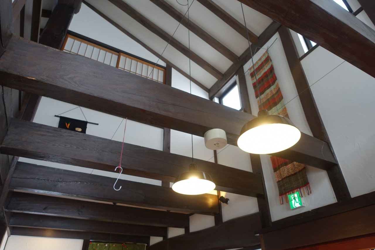 明治30年代建築の蔵を改装した店内に入ると、どこか懐かしい雰囲気に包まれます。どっしりとした柱や梁は存在感があるけれど、高い天井から優しく光が入り、とても開放的。