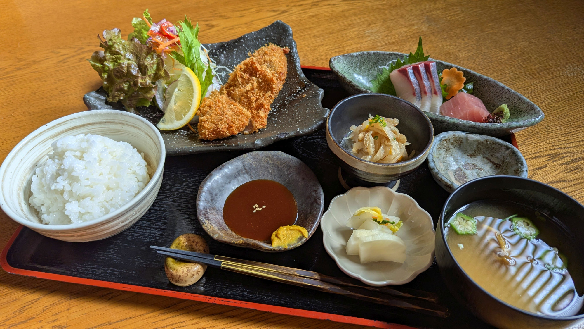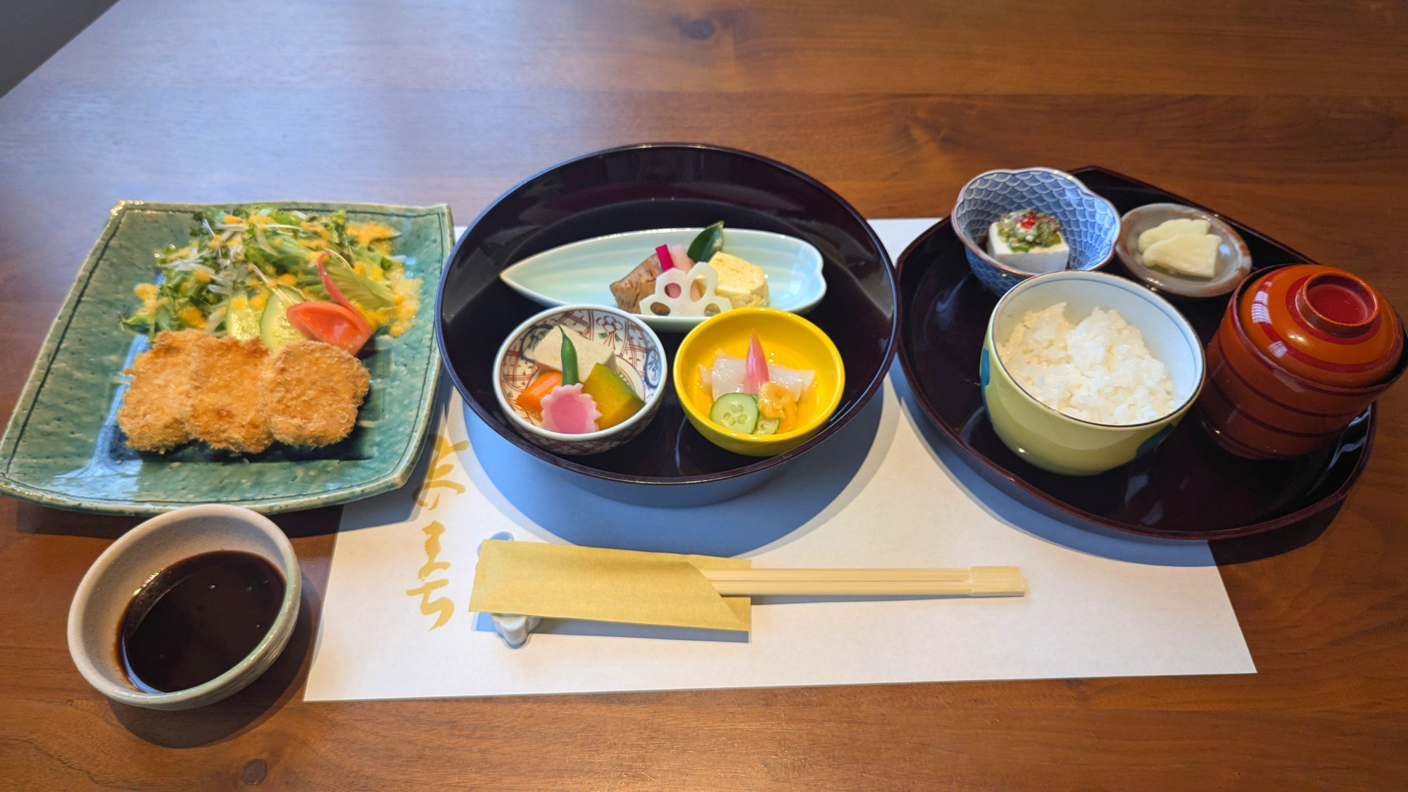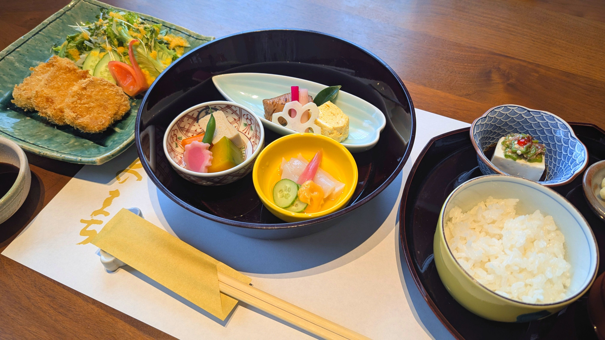 メイン料理は、能登豚のヒレカツ、刺身、天ぷら、海老フライからお好みで選べる贅沢さ。特にヒレカツはサクッと軽やかな衣と柔らかな肉の旨みが絶妙に調和し、上品さと食べ応えを兼ね備えています。