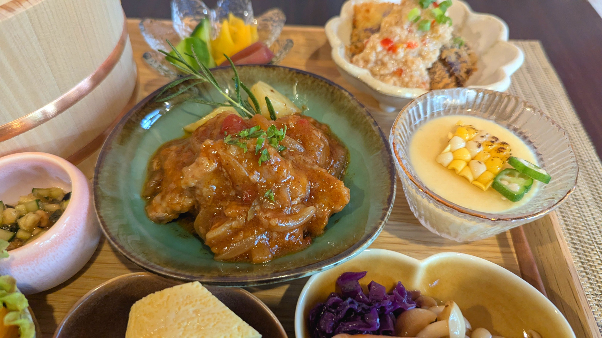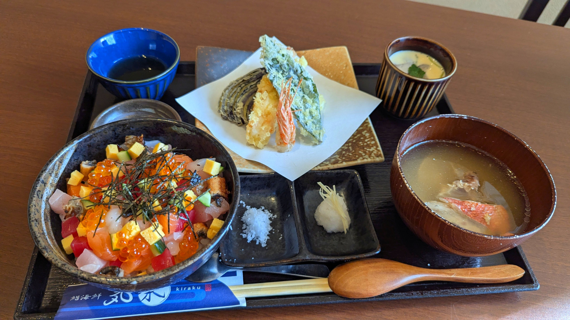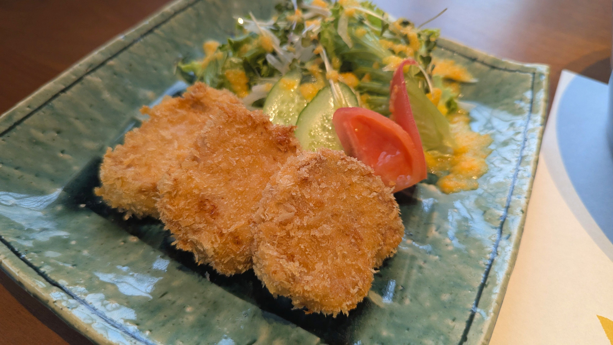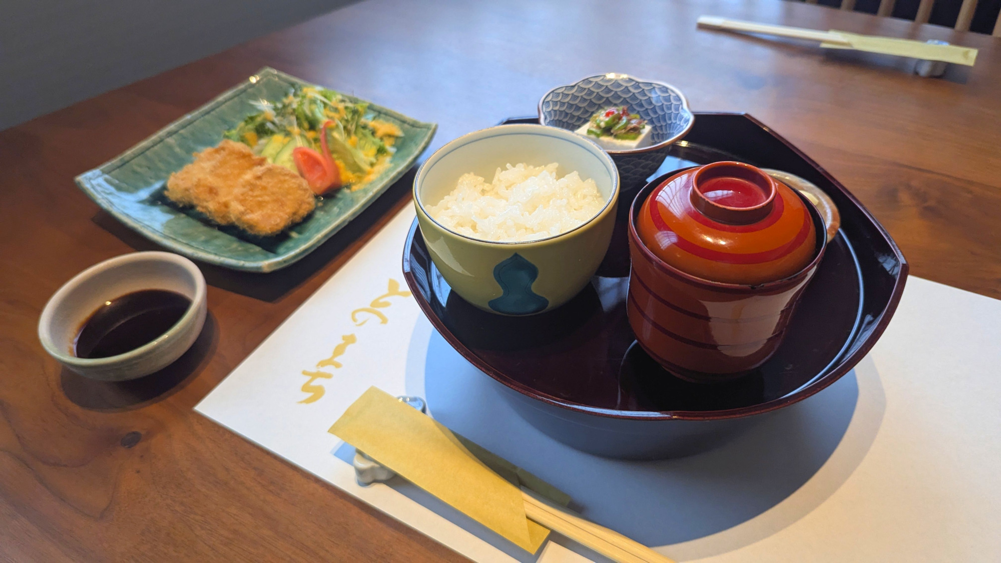 メイン料理は、能登豚のヒレカツ、刺身、天ぷら、海老フライからお好みで選べる贅沢さ。特にヒレカツはサクッと軽やかな衣と柔らかな肉の旨みが絶妙に調和し、上品さと食べ応えを兼ね備えています。