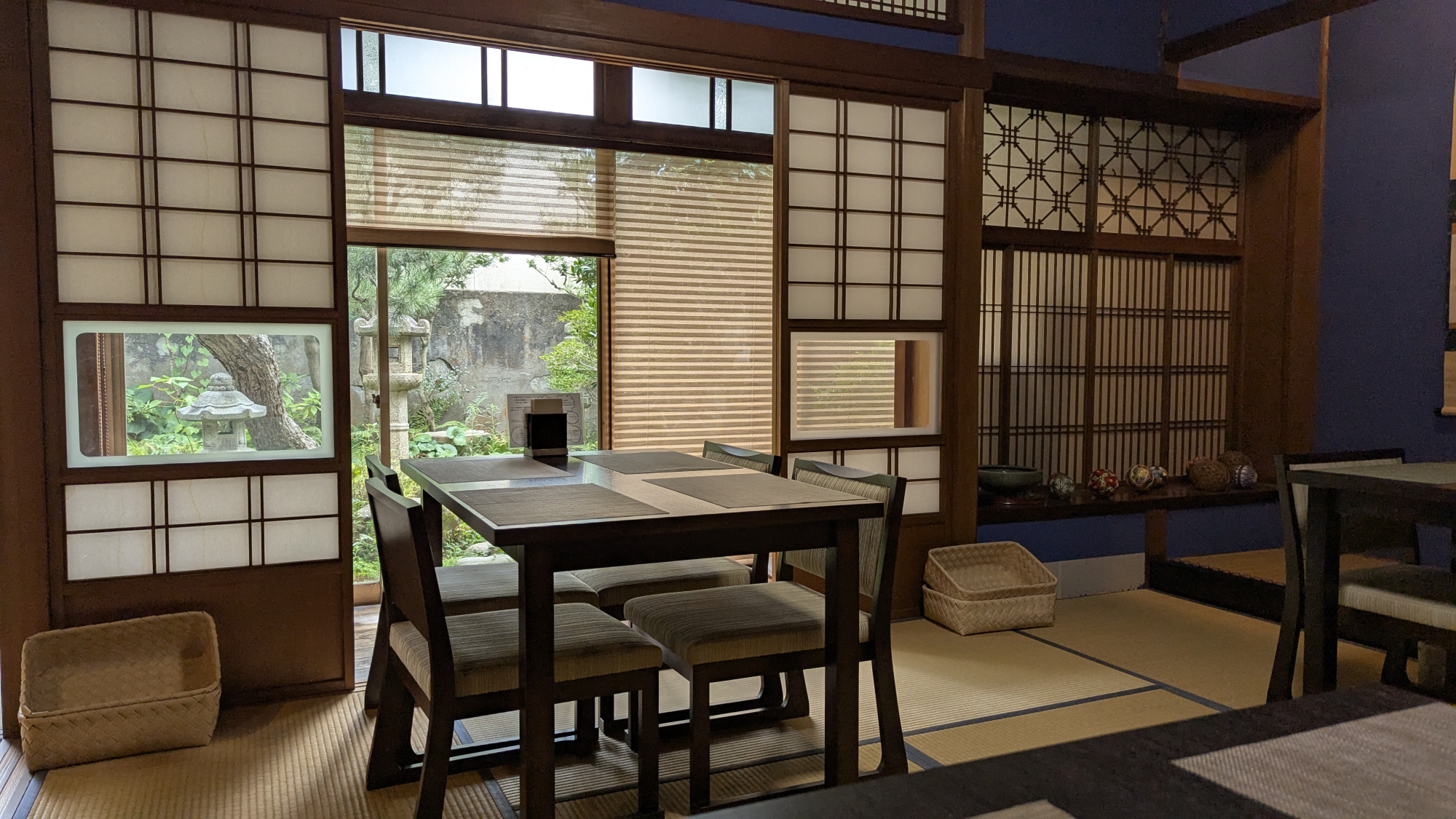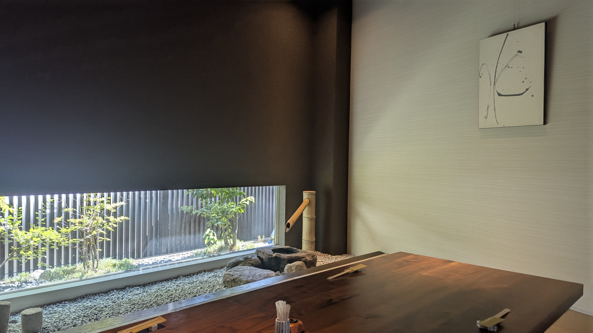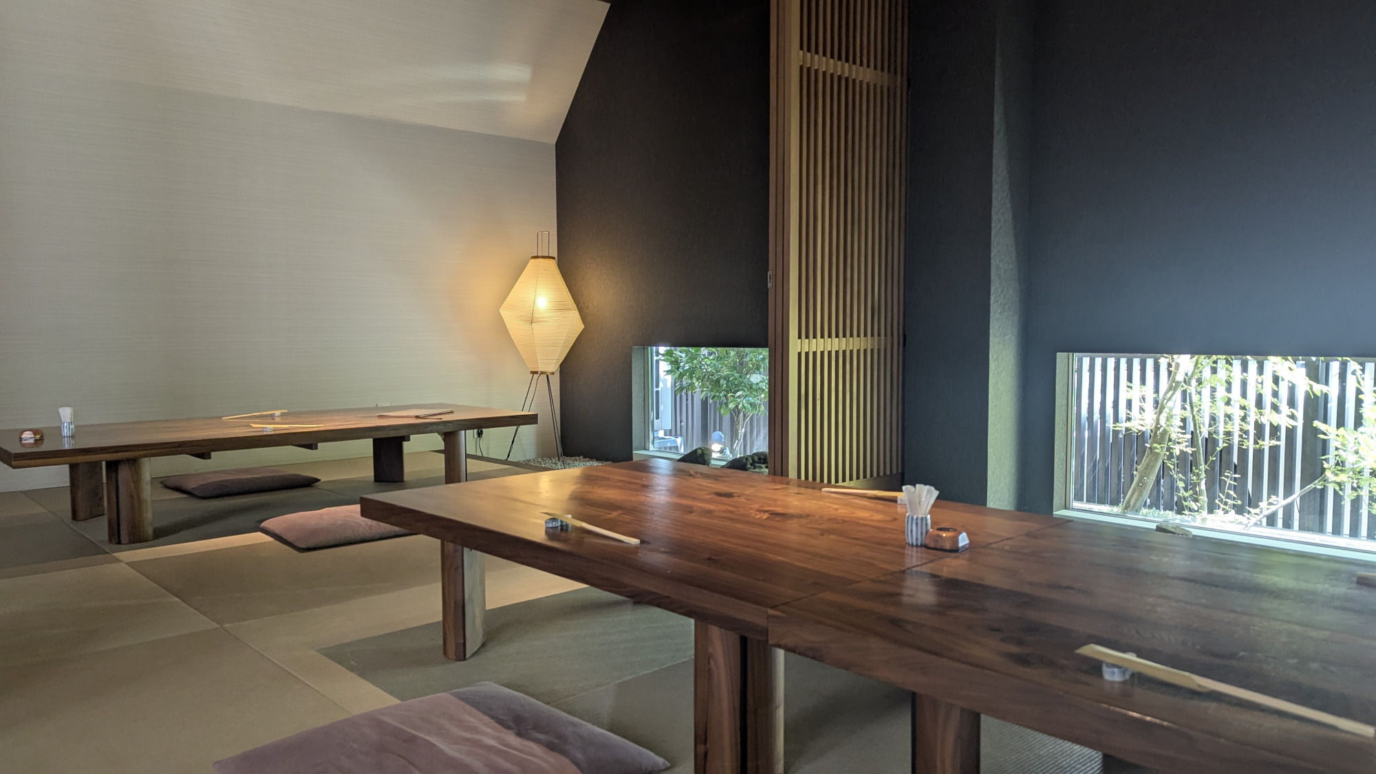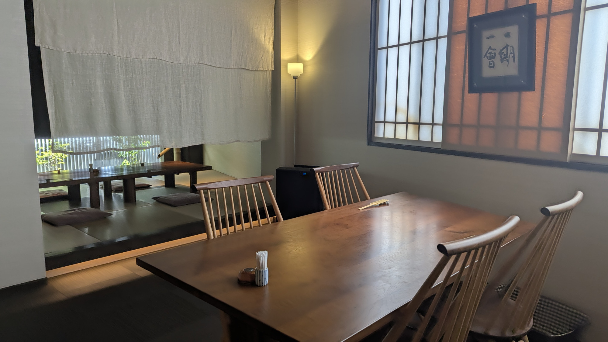木の温もりあふれるテーブル、障子越しに差し込むやわらかな光、そして坪庭をのぞむ窓辺。店内には、都会の喧騒を忘れさせる静けさと上質さが漂います。