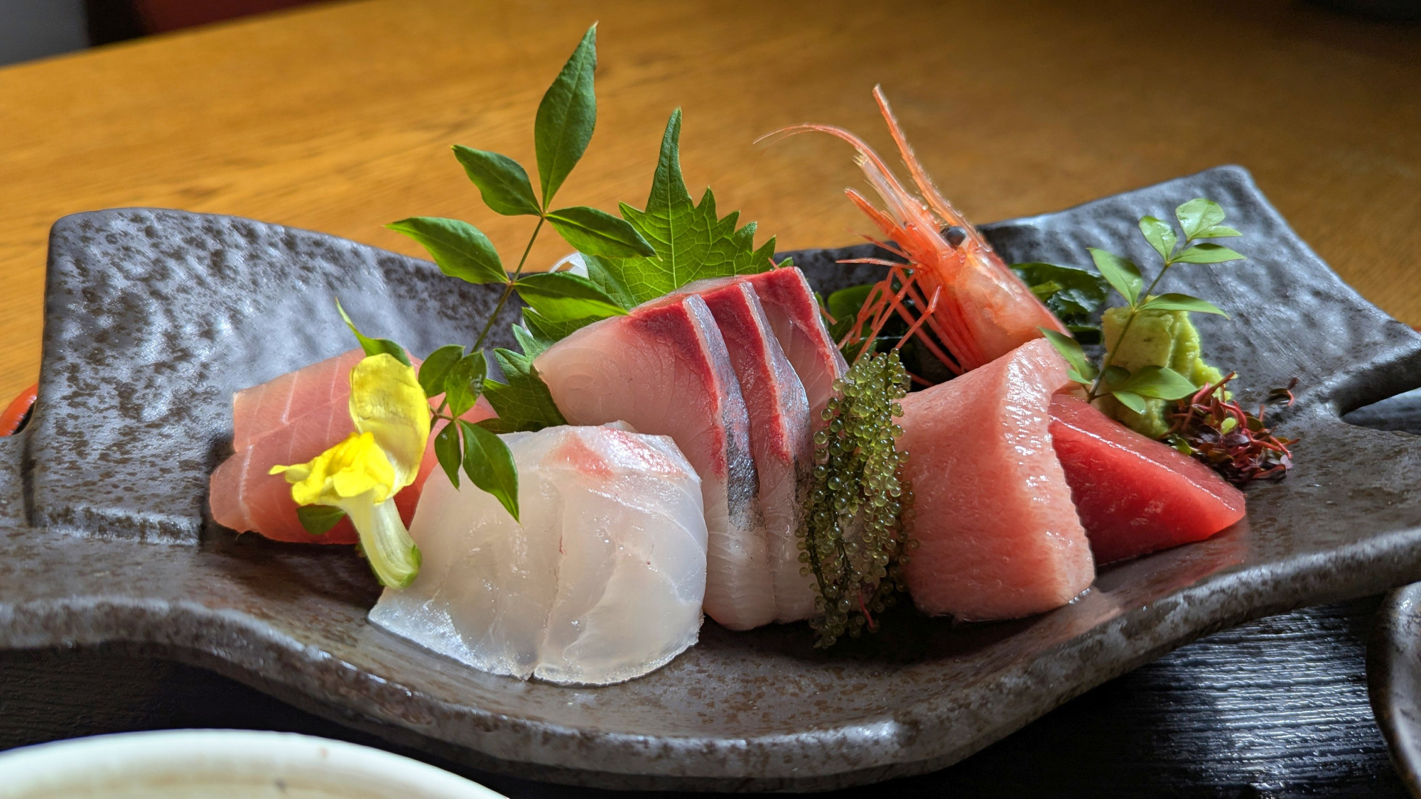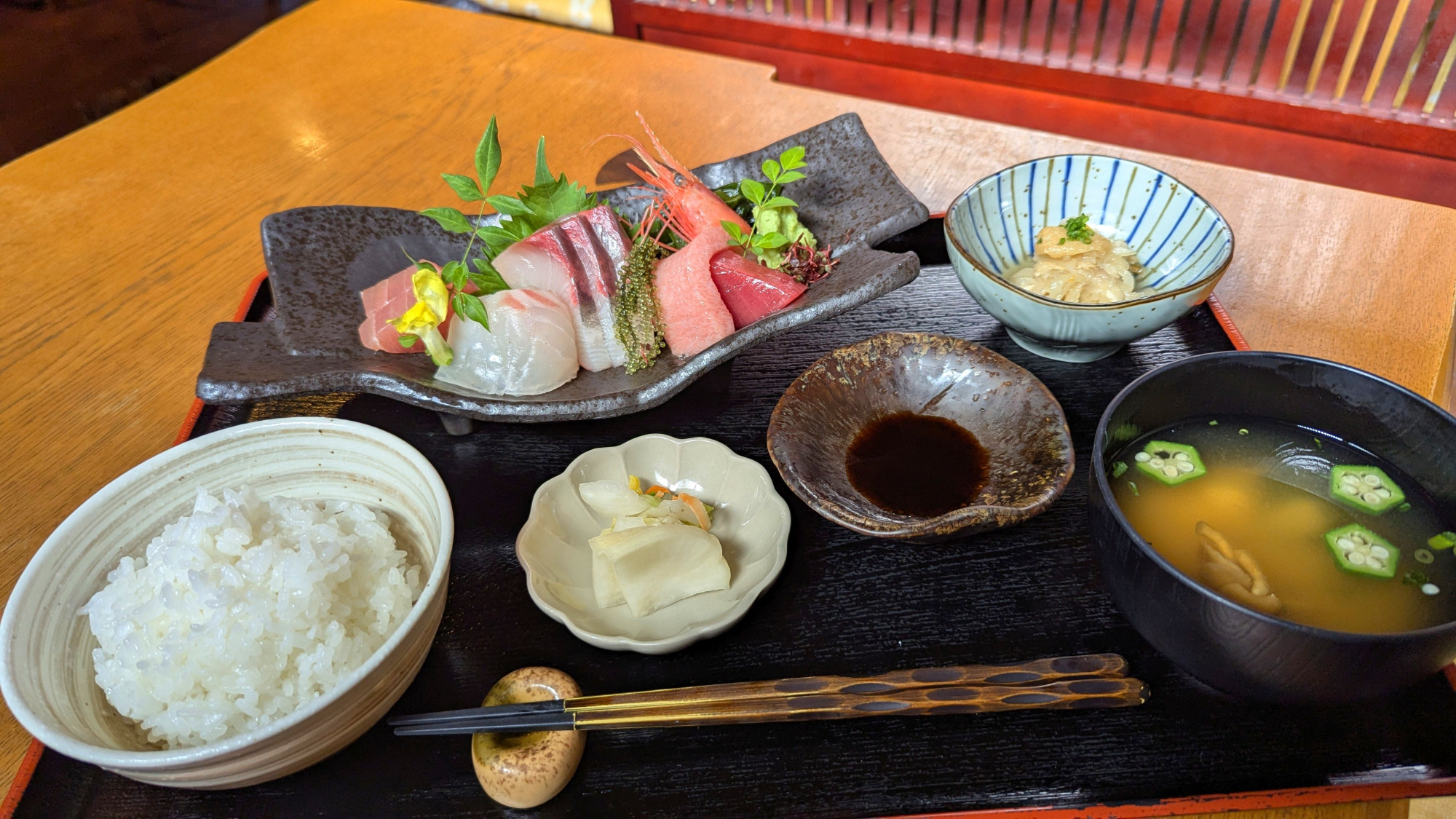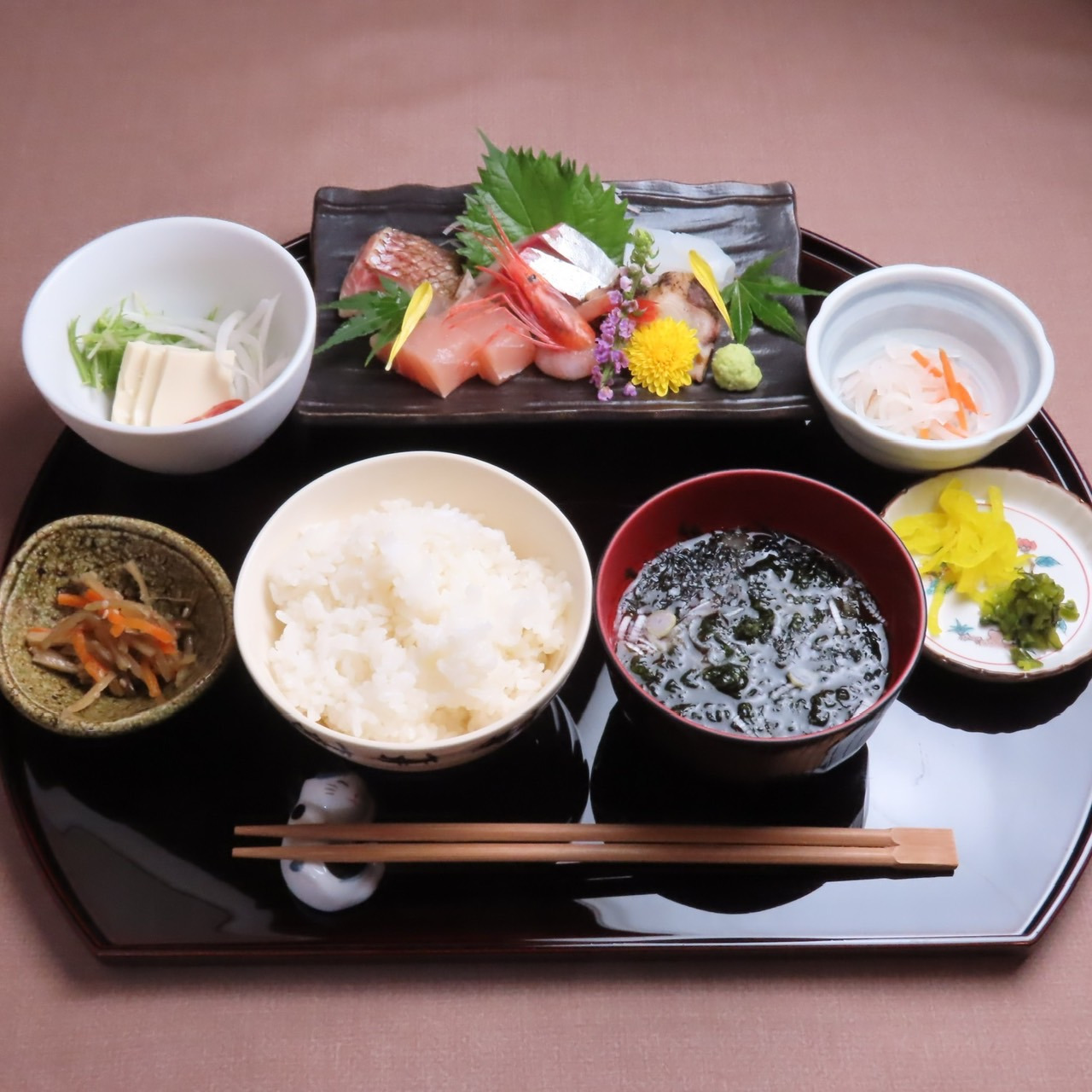 また季節の刺身定食は、仕入れ状態に応じて厳選される鮮魚がマグロ、甘エビ、鯛、カンパチ、炙りなど多彩に並び、切り付け・厚み・盛り付けの繊細さが旅館仕込みの技を感じさせます。