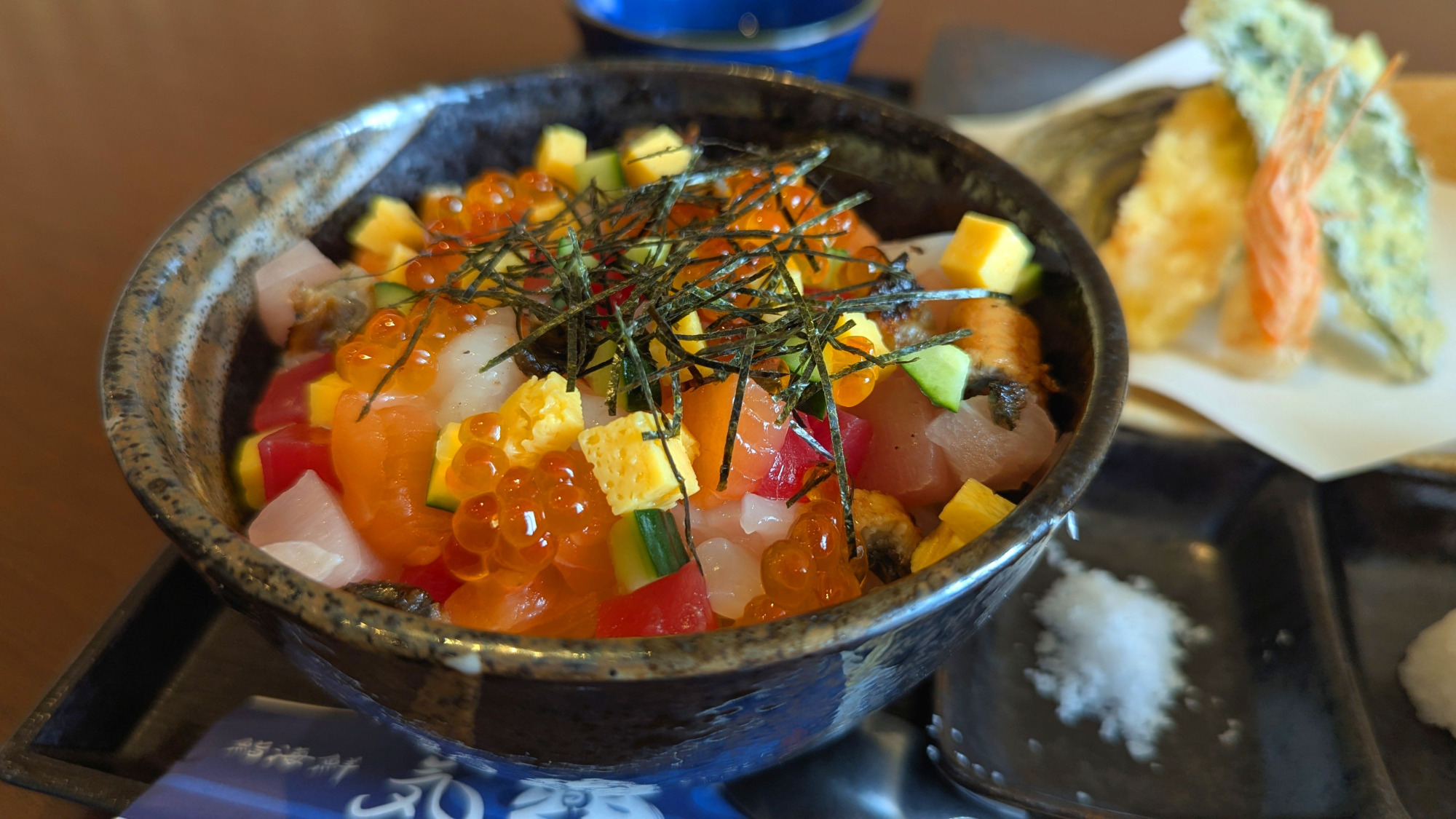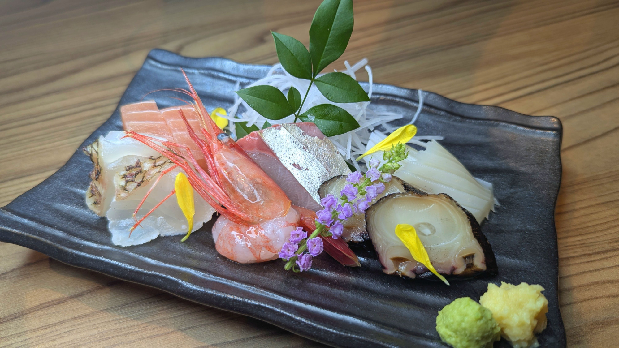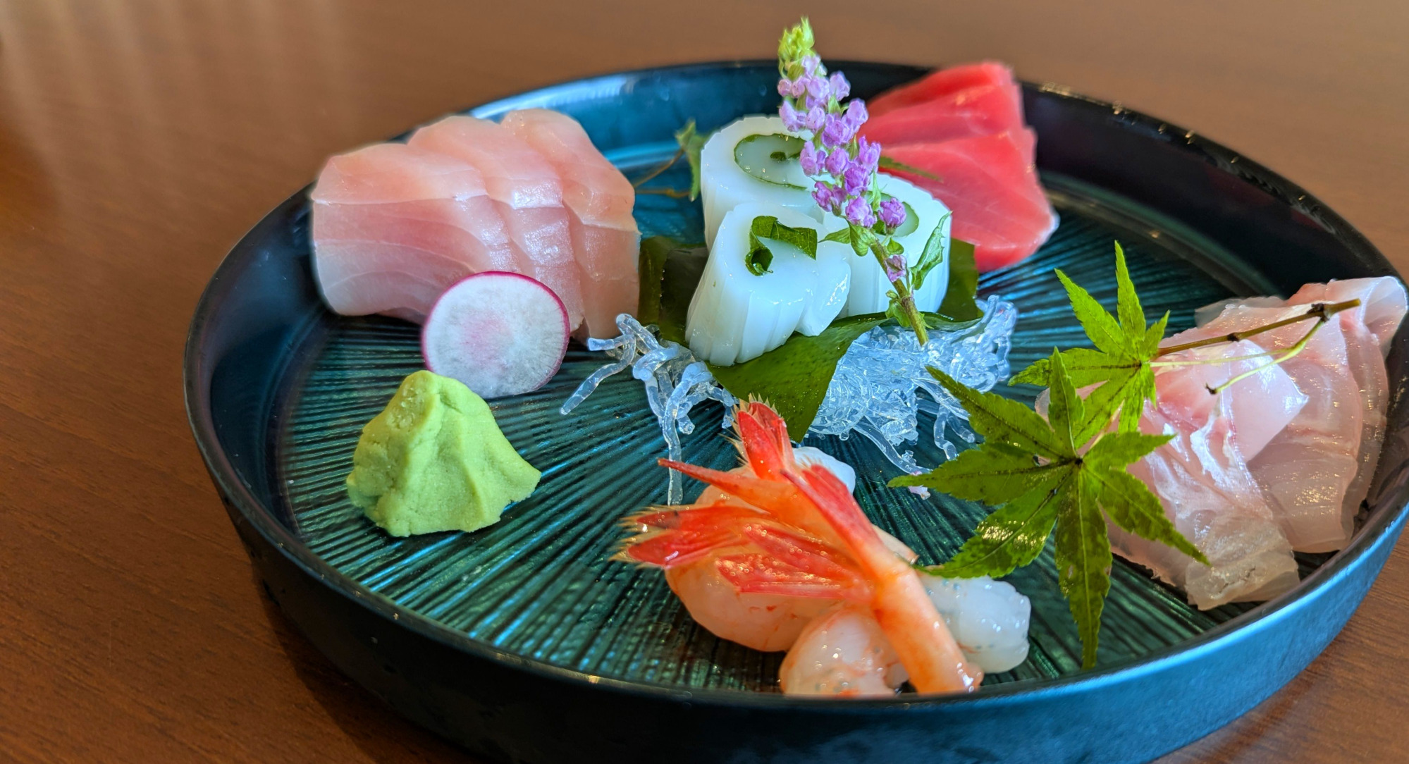 また季節の刺身定食は、仕入れ状態に応じて厳選される鮮魚がマグロ、甘エビ、鯛、カンパチ、炙りなど多彩に並び、切り付け・厚み・盛り付けの繊細さが旅館仕込みの技を感じさせます。