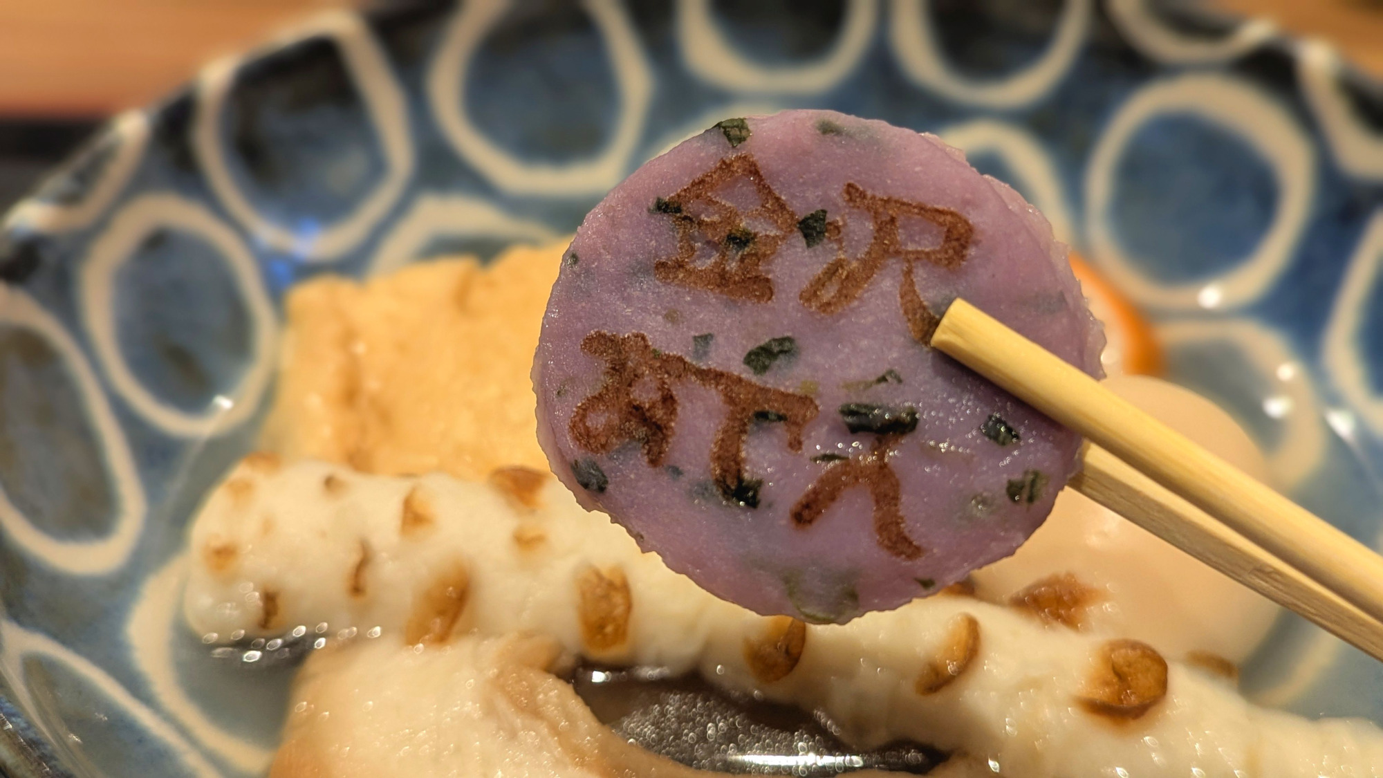 「金沢おでん老舗50年会」だけで食べられる金時草のはんぺんは、見た目も可愛らしく、旅の記憶に残る一品です。