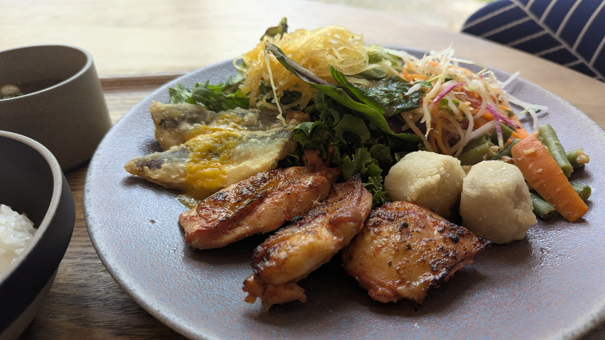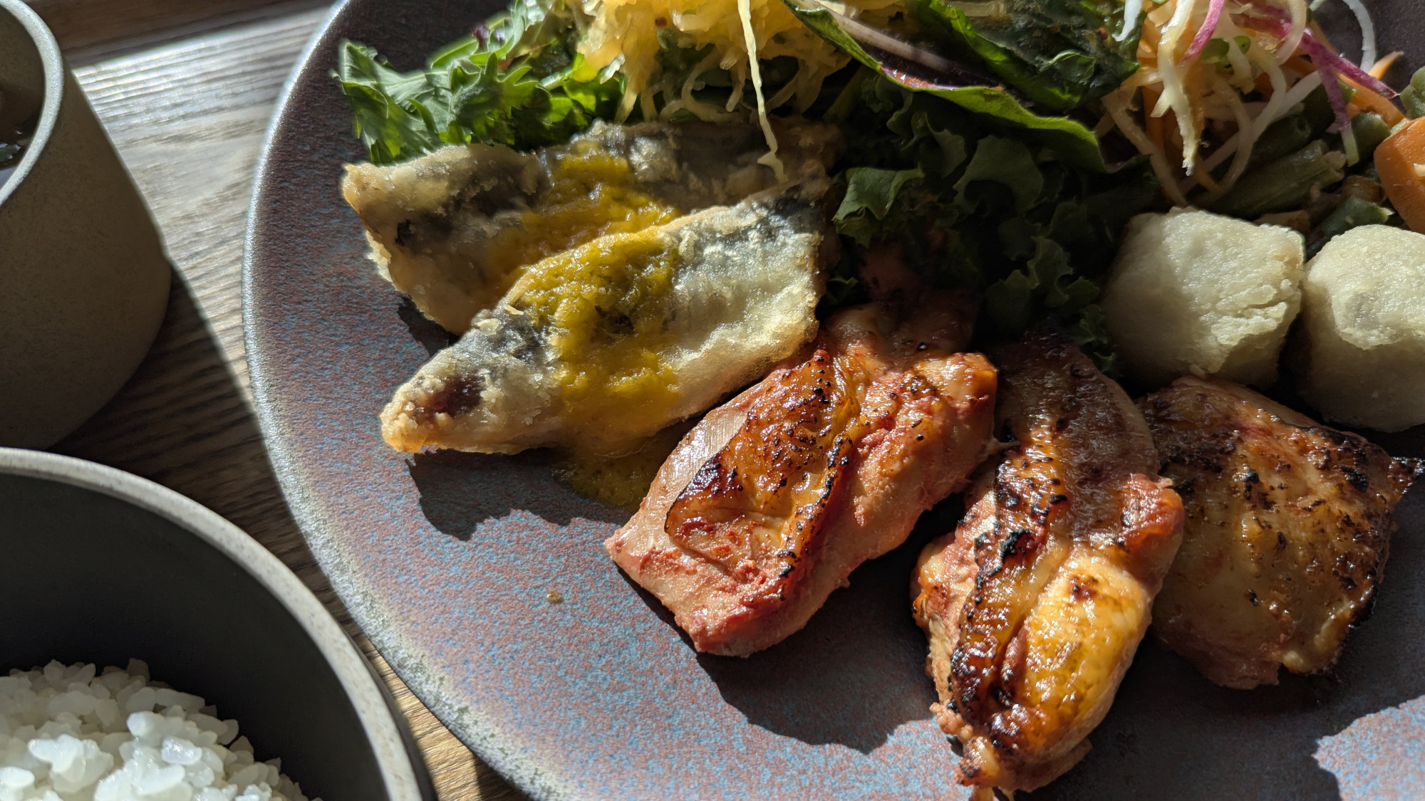 新鮮地物野菜の滋味、魚の旨み、肉料理の深いコクに加え、フレンチの経験を活かしたソースの妙や、野菜の彩りを生かした盛り付けが加わります。ひとつひとつがまるで違うベクトルの美味しさを放ちながら、見栄えも味もそろって完成度の高い一膳に仕上がっているのです。食べ進めるほどに胸いっぱいの多幸感に包まれて笑顔がこぼれます。