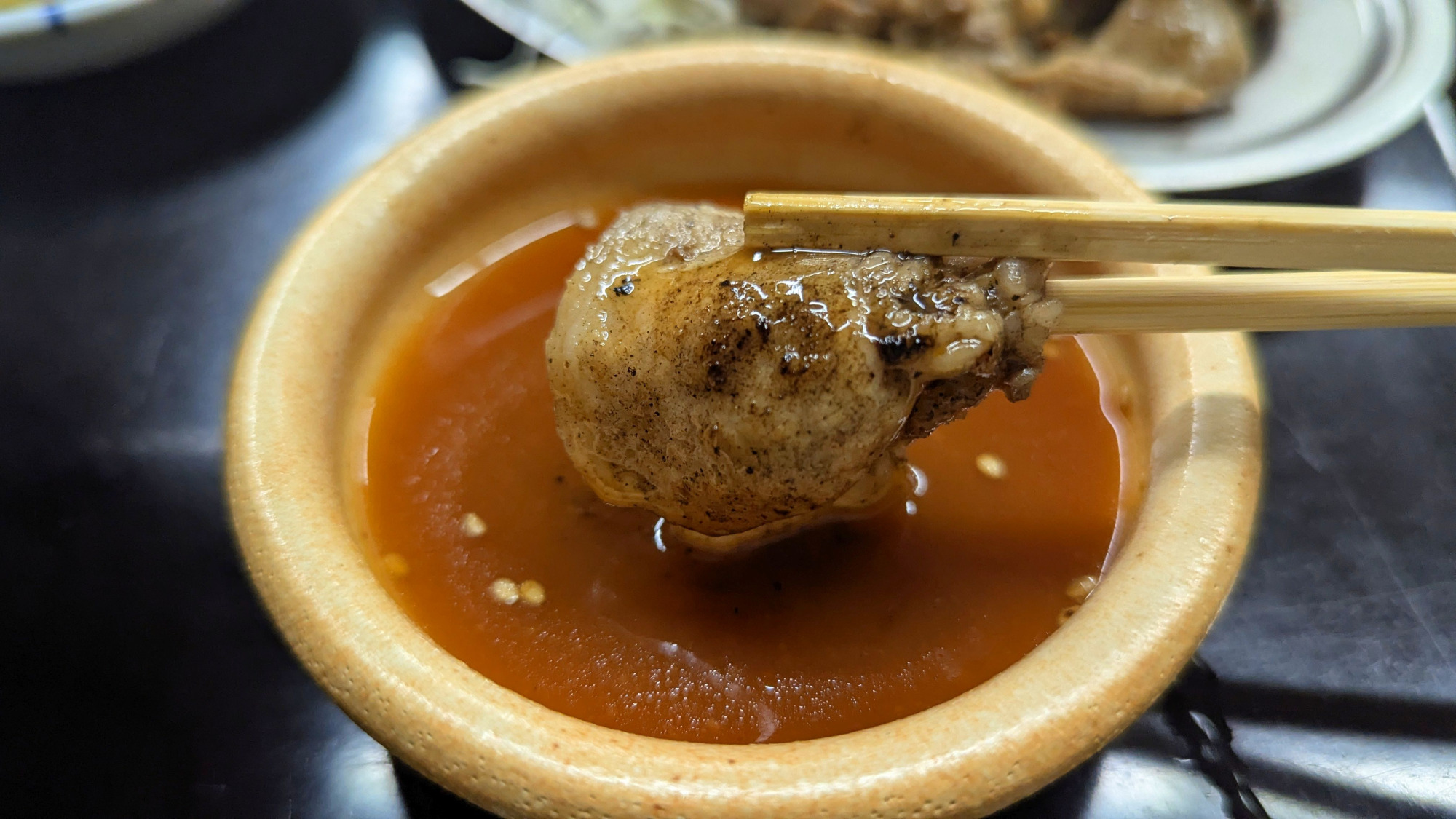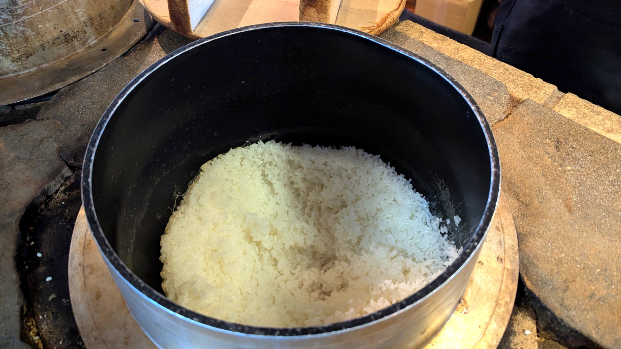 ご飯は店内のかまどで炊き上げられ、香りと甘みが格別。このご時世におかわり自由だなんてありがたい…!待っている間には、ソース用のゴマをすりながらワイワイ盛り上がれるのも楽しいひととき。