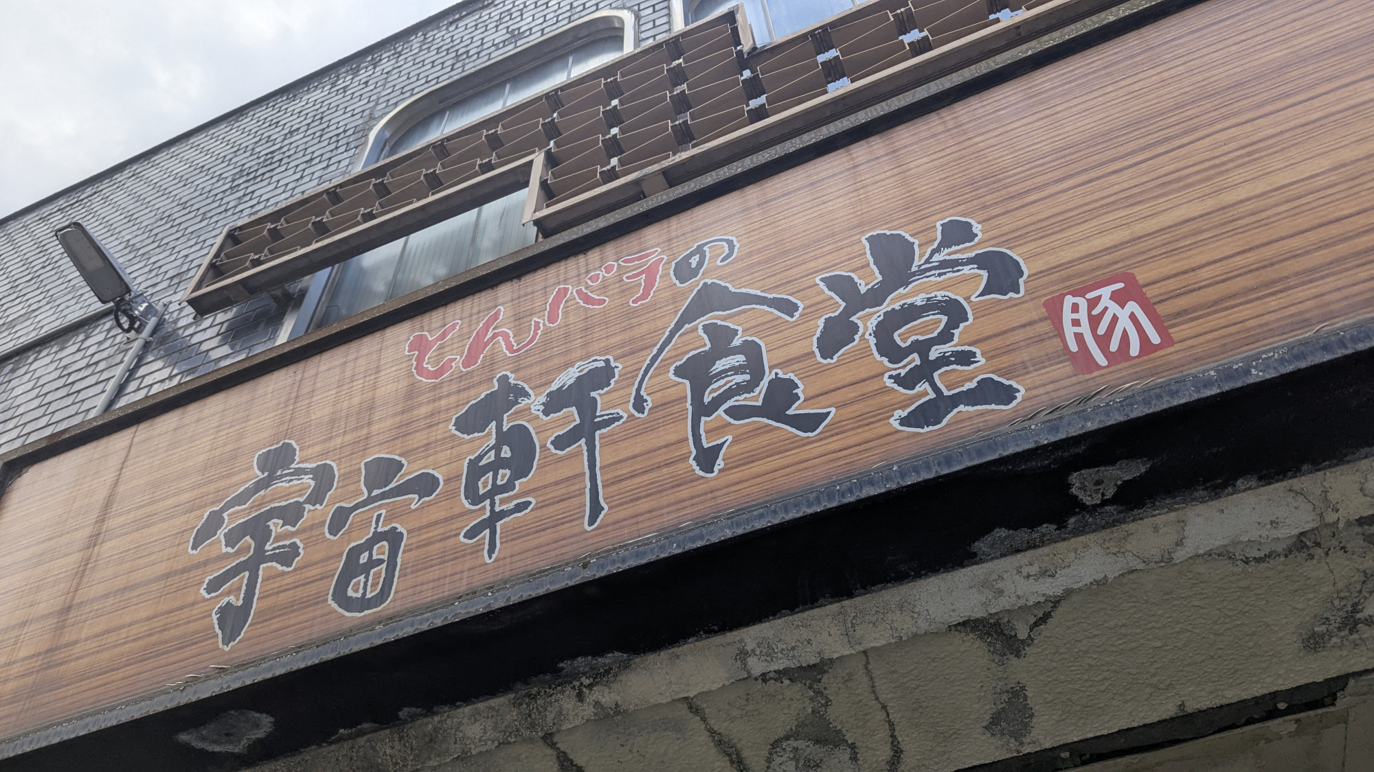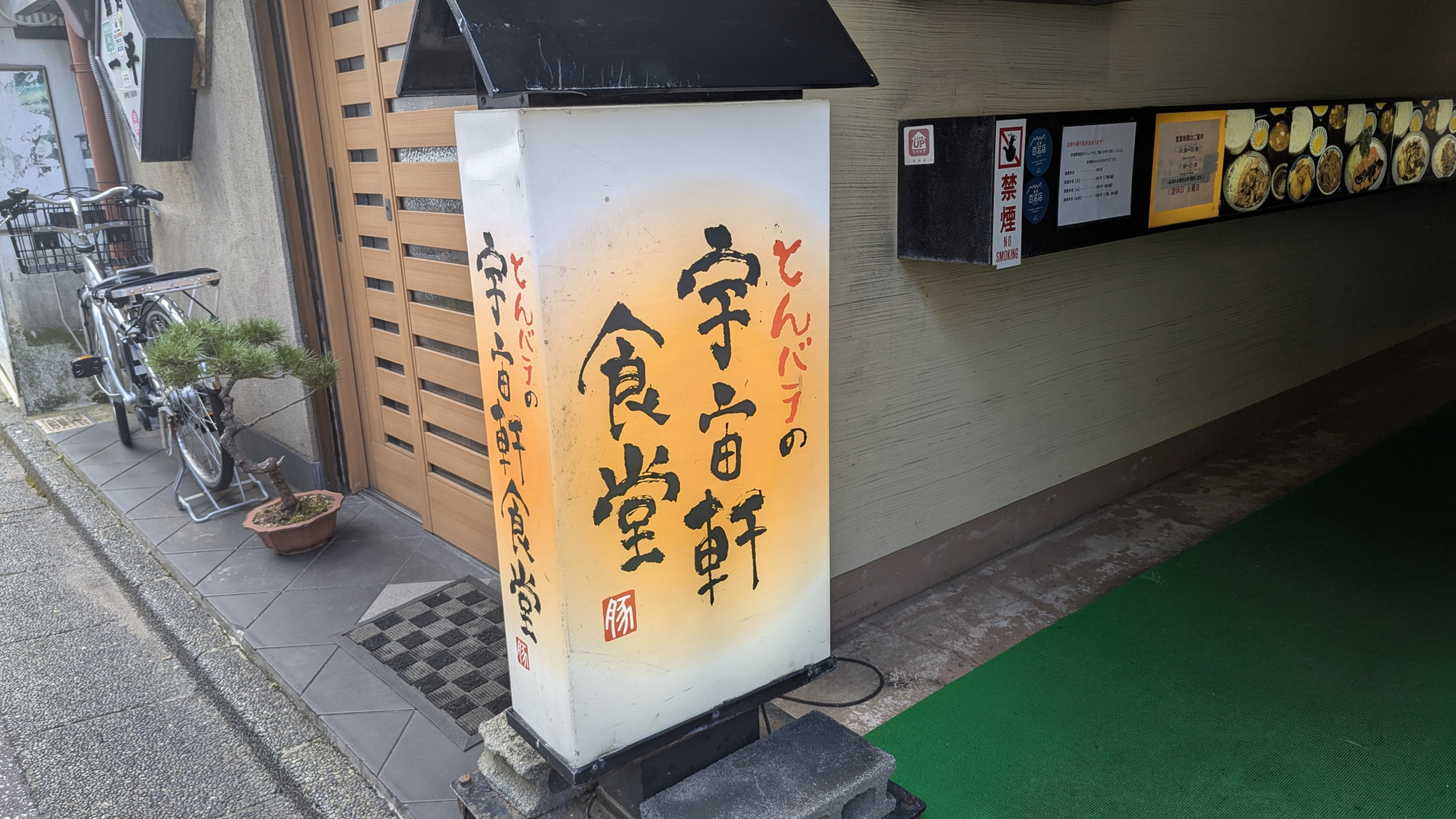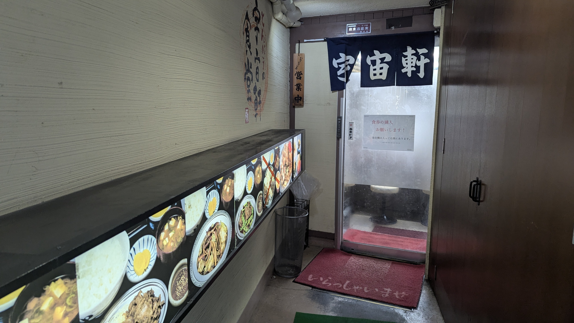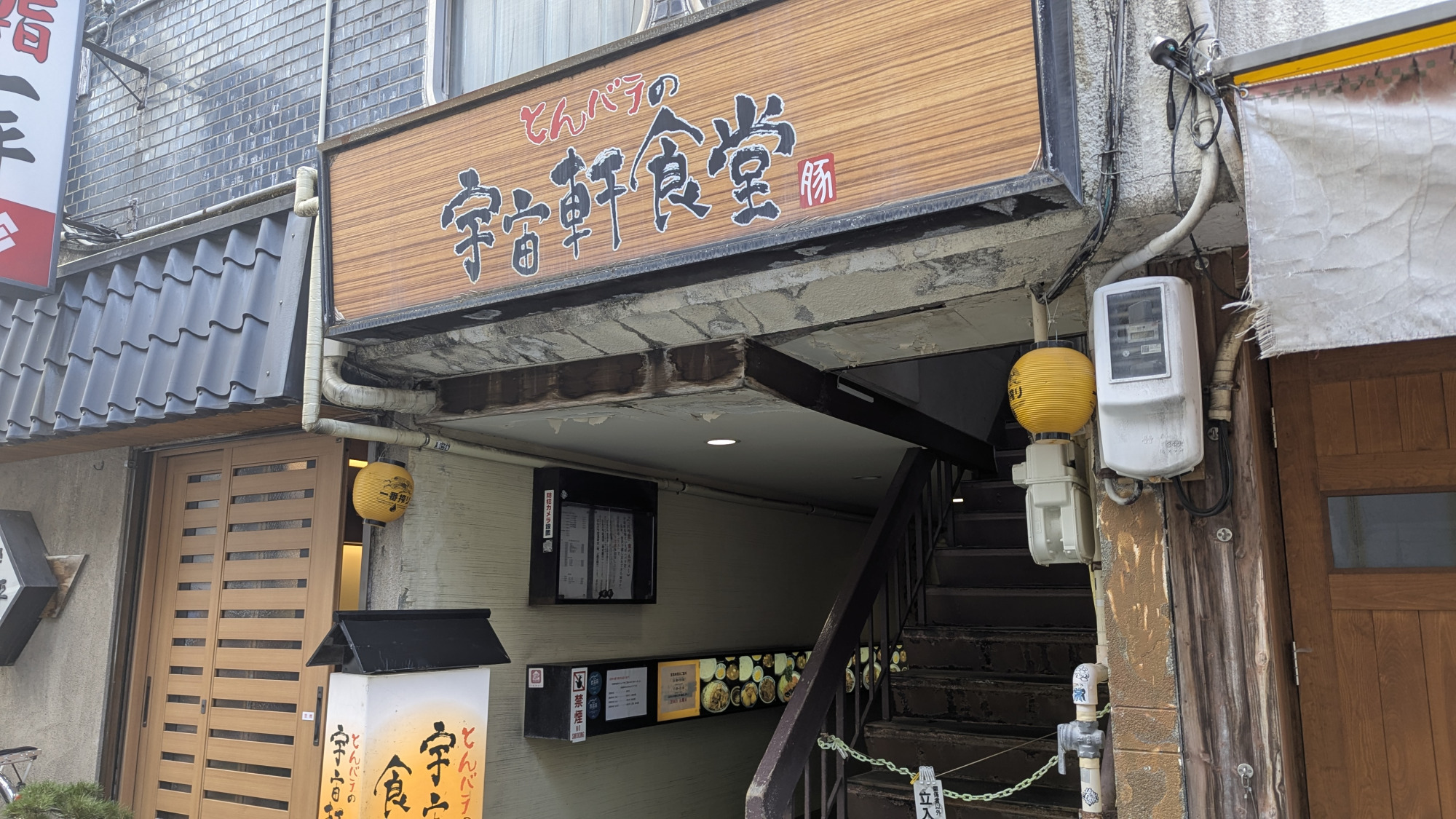宇宙軒は片町スクランブルからすぐ、半地下に潜り込むように現れる老舗食堂。