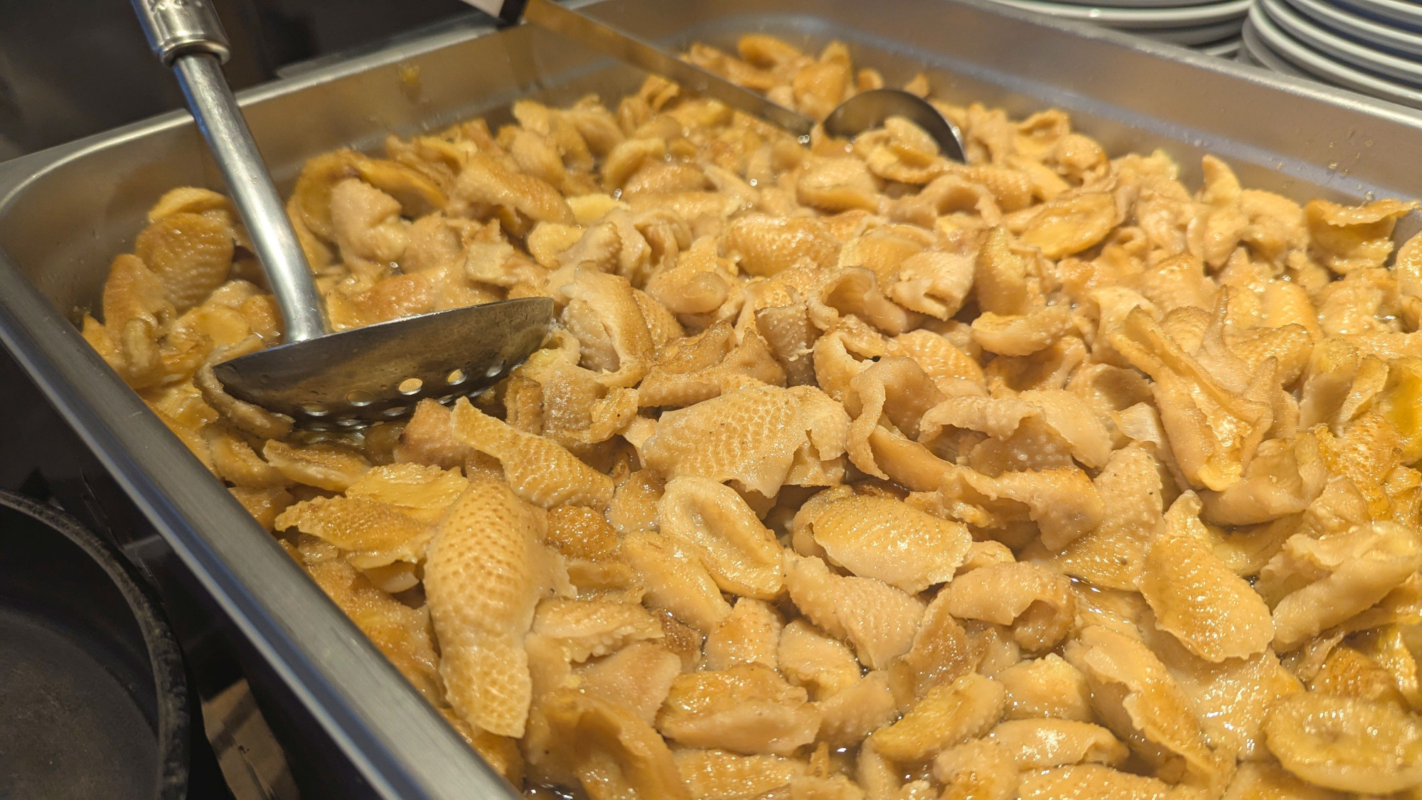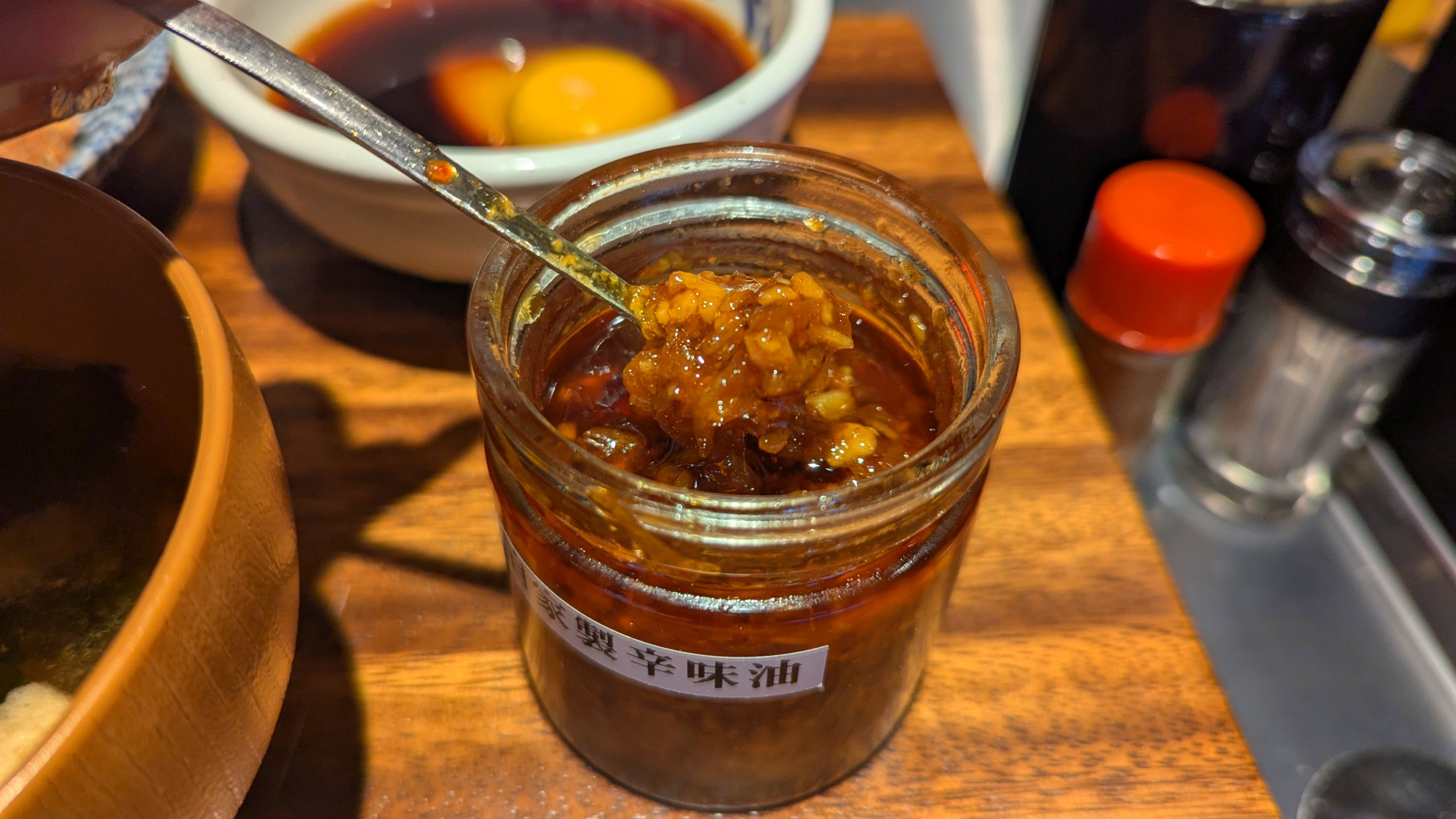 カウンターだけの店内に入ると、まず目に飛び込んでくるのは年季の入った大きな黒い鉄板。その上で豚バラが次々と焼かれ、香ばしい匂いと音が広がっていきます。鉄板は何十年も継ぎ足されてきた“味の歴史”そのもの。