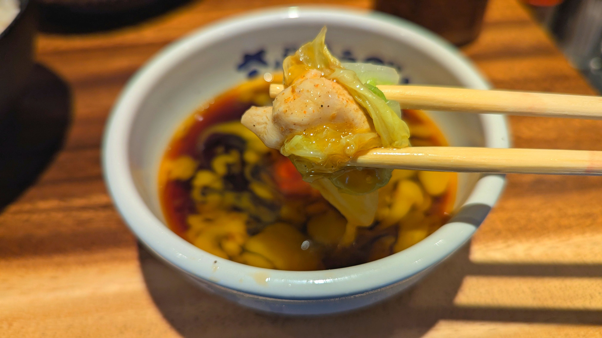 名物の「親とり白菜鍋」は、シャキシャキの白菜と噛むほど旨みが広がる親鶏を鶏油がやさしくまとめ、能登のいしるを使用した秘伝のたれ と辛味油が奥深さを添えます。