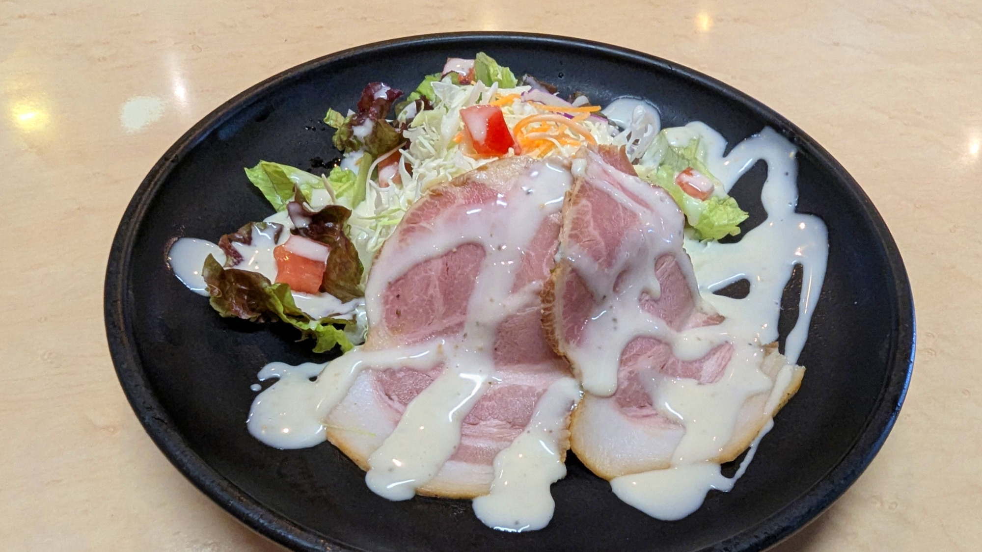 さらに、自家製豚ハムがのった特製サラダがお客さんにサービスされるという太っ腹ぶり。店長の心意気に思わず感動して大満足でうるうるしちゃう時もあるくらい。