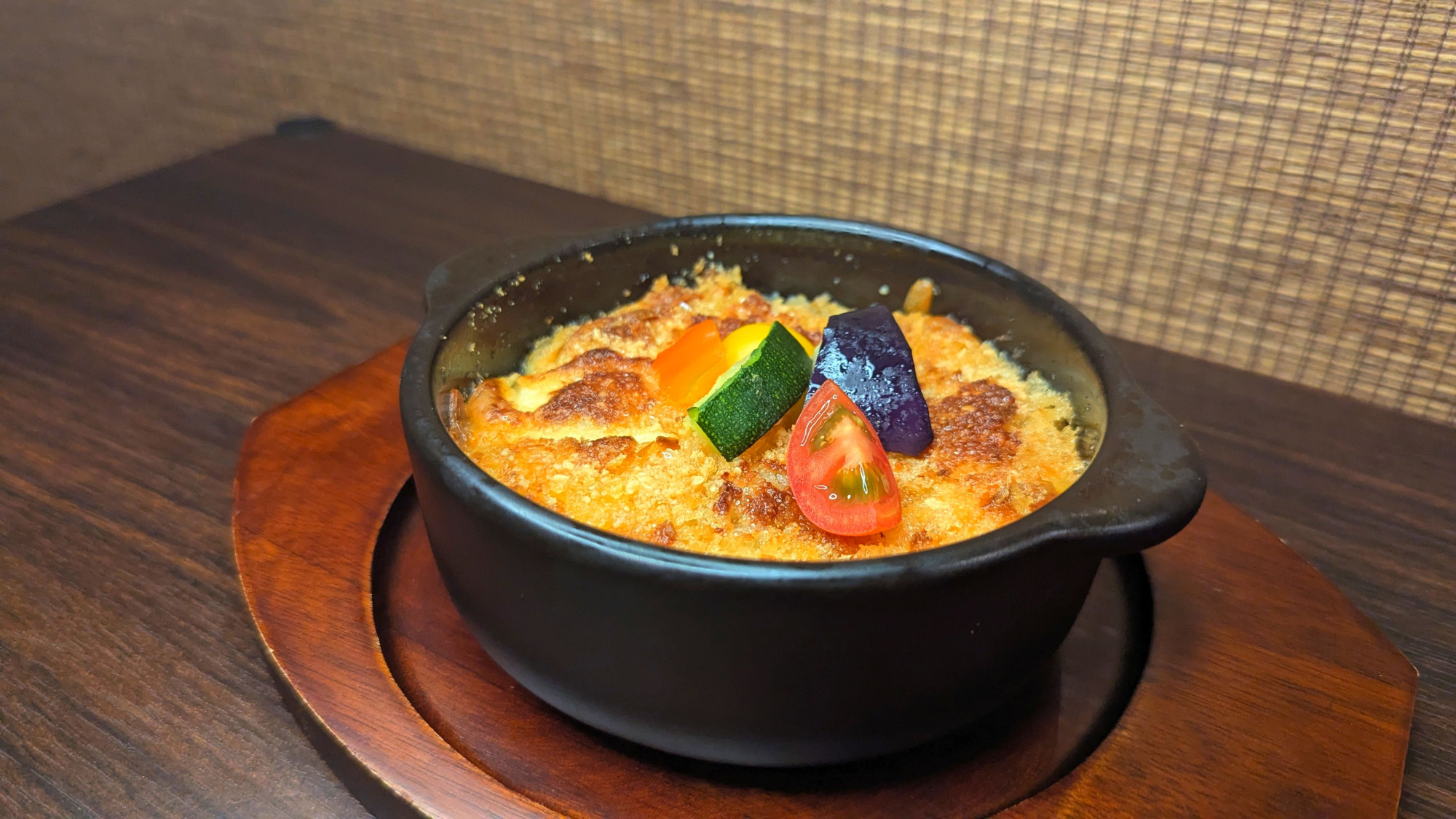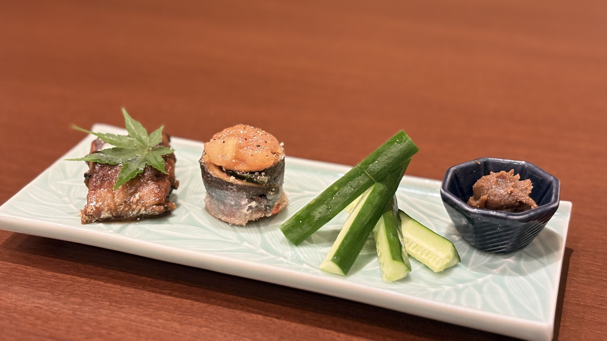 料理を手がけるのは、加賀山代温泉「かんぽの宿」で料理長を務めた経験をもつ職人。日本海の新鮮な魚介や加賀野菜など地元食材をふんだんに用い、伝統を受け継ぐ一皿一皿におもてなしの心を込めています。