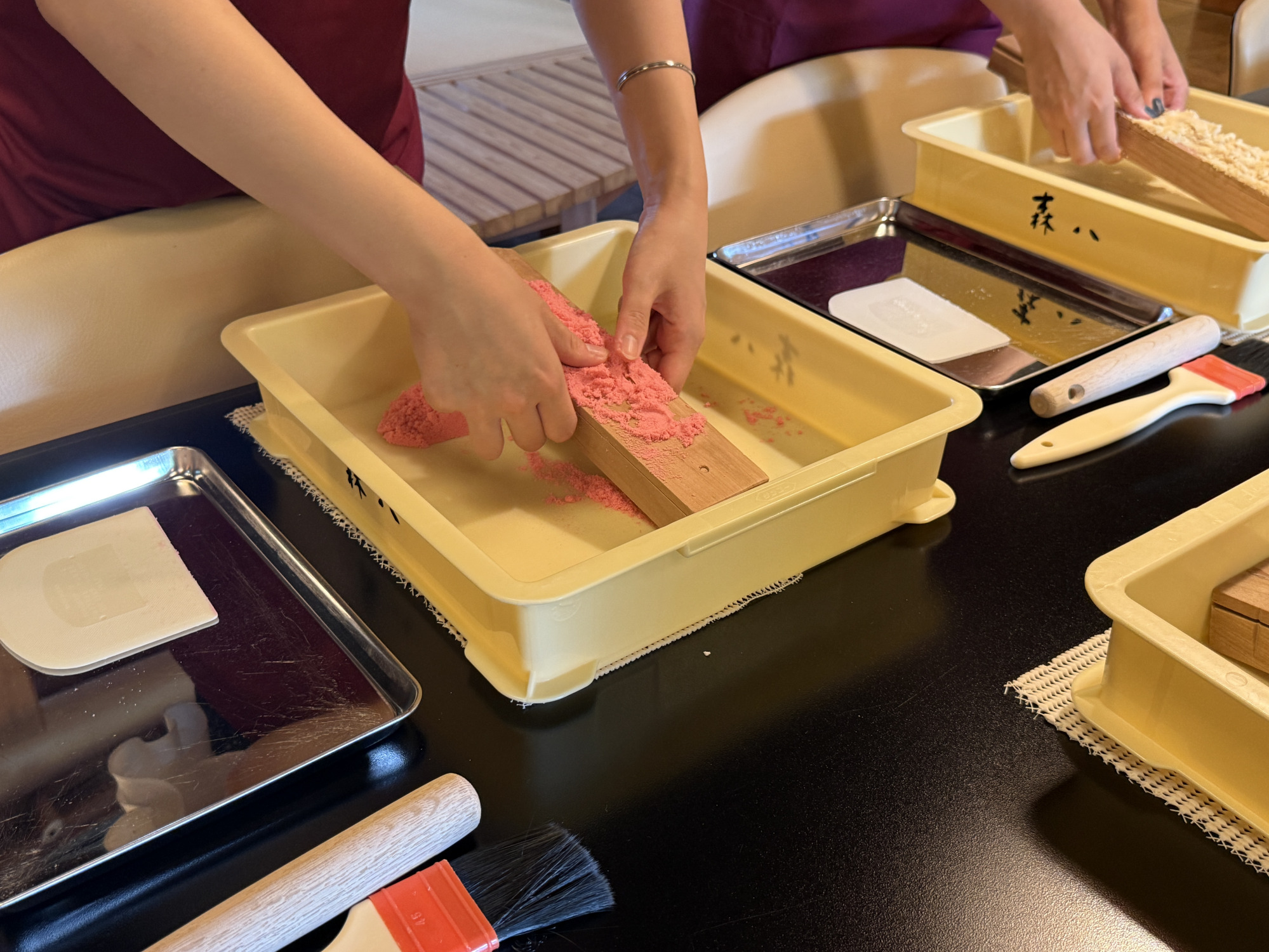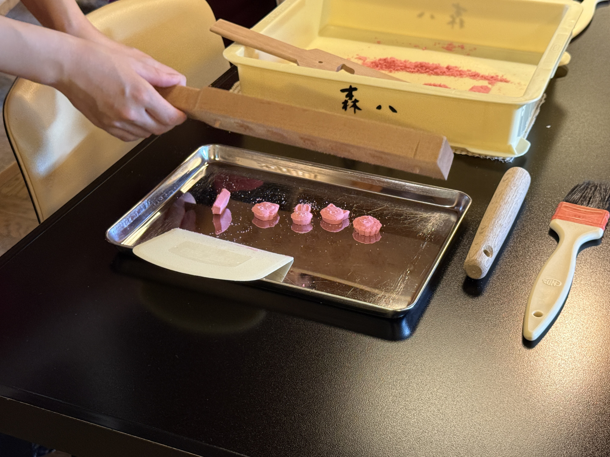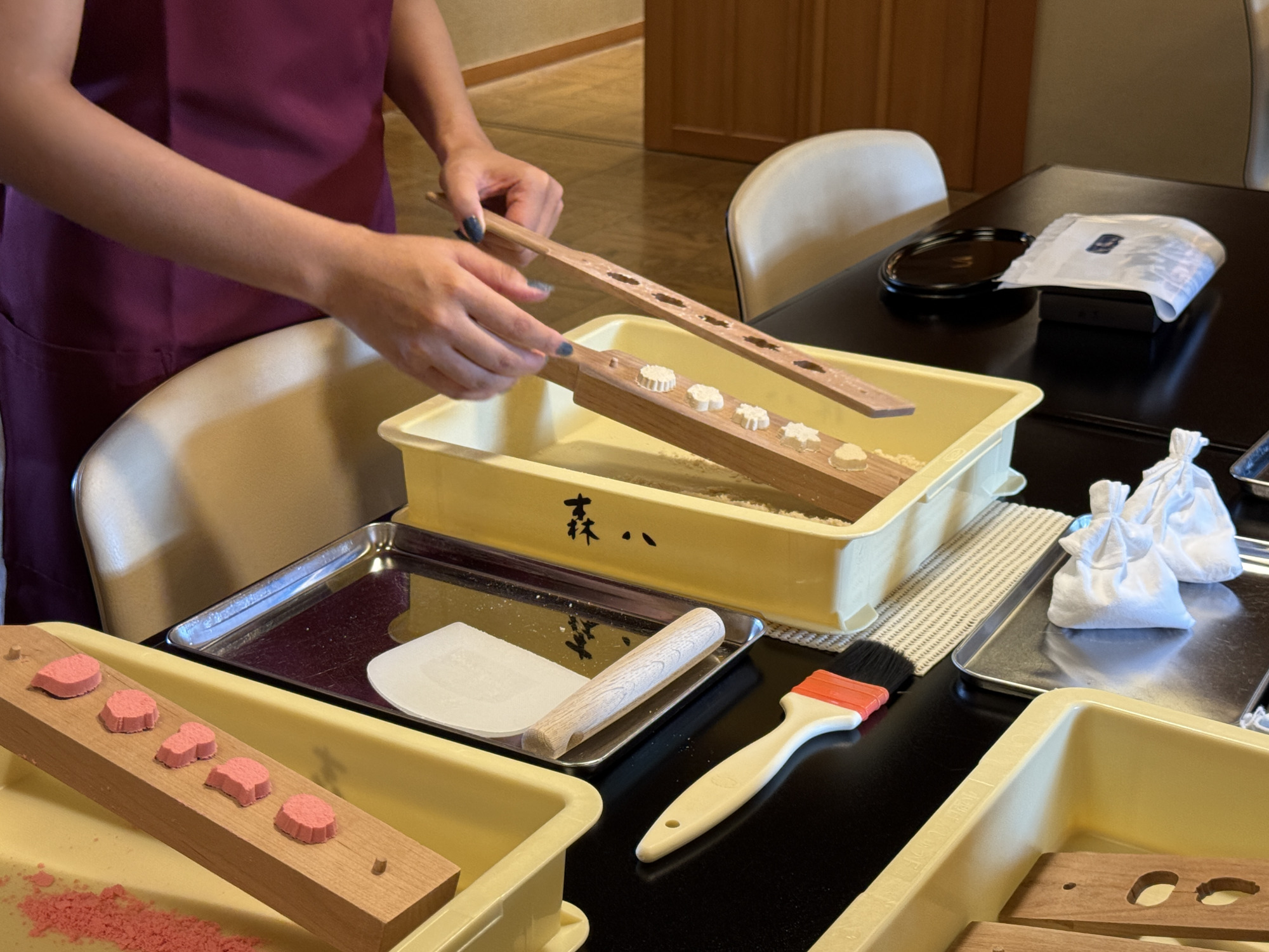また、同じスペースで加賀で古い歴史を持つ「落雁」の手作り体験も可能で、車椅子を利用される方にも無理なく楽しめるよう、高さや動線に配慮しています。