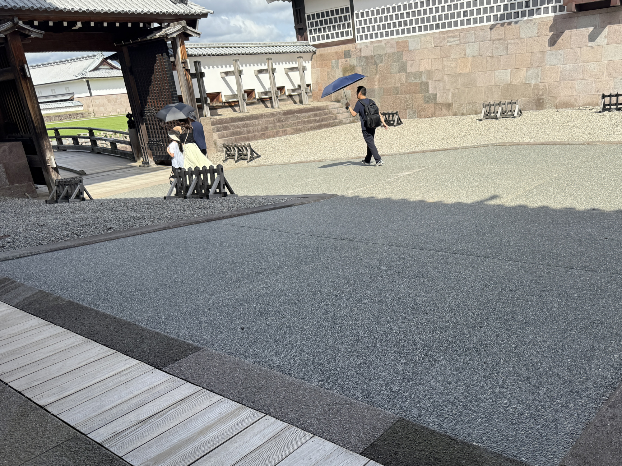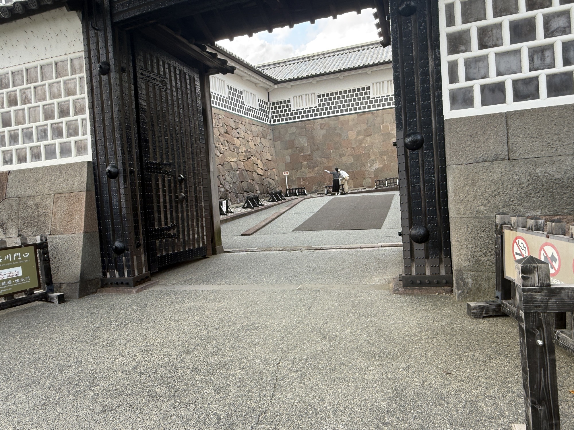 公園の散策の最後は「橋爪門」へと向かいます。途中には、令和6年から進められている「二の丸御殿」の復元工事現場も見られ(完成までは数十年かかるという)、かつての城の姿を思い描きながら歩くことができます。橋爪門の手前にもバリアフリートイレも完備。安心して立ち寄れるポイントです。ただし、ここから門まで少し傾斜のある下り坂となるため、車椅子をご利用の方はご注意を。さらに「橋爪橋」はアーチ形になっており、車椅子での通行には介助が必要です。