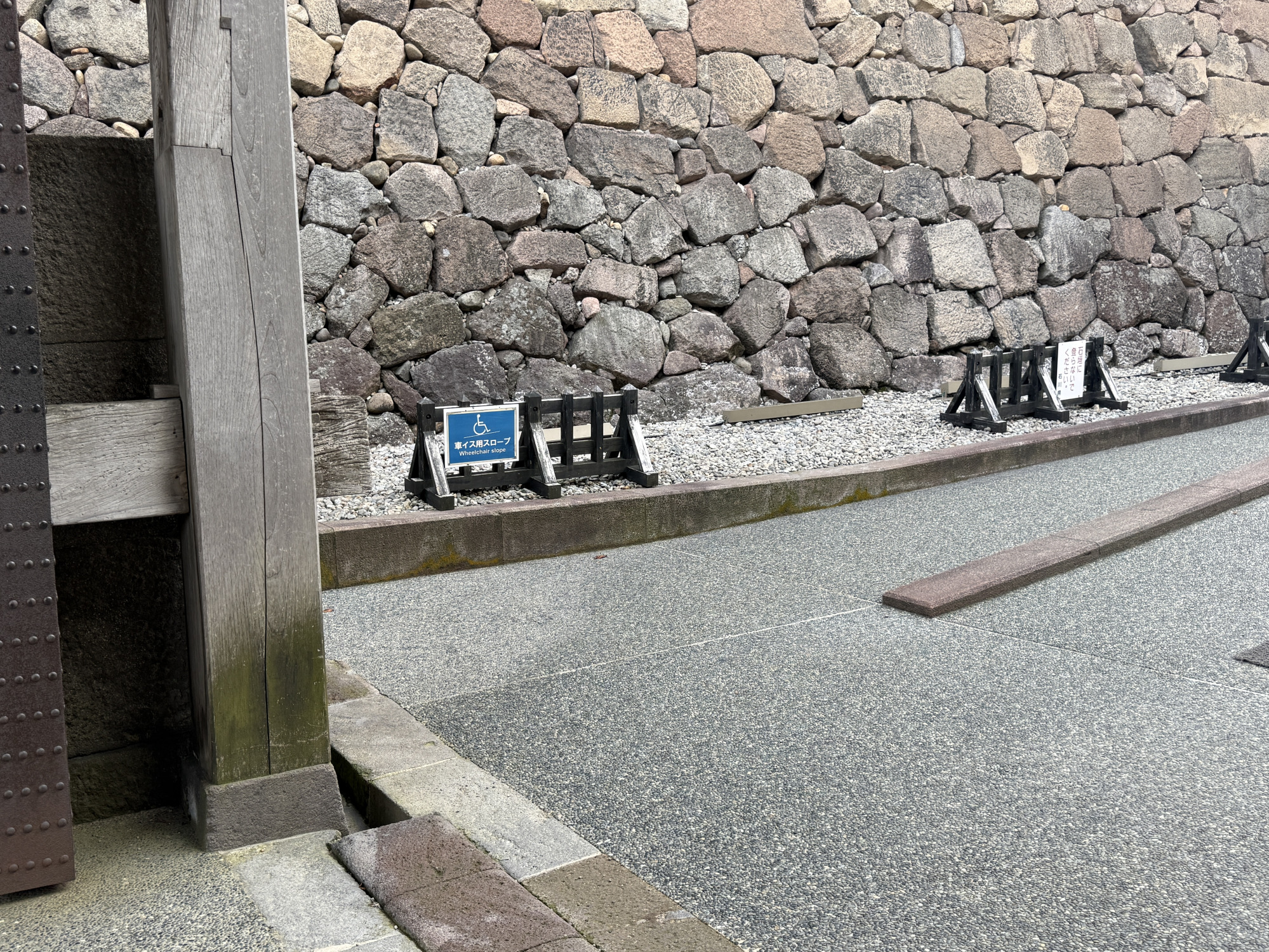 石川県観光物産館から兼六園へ向かう『紺屋坂』(兼六園下交差点から兼六園の桂坂口へ向かう坂道)は、急な上り坂になっており、車椅子での移動はかなりの負担に。