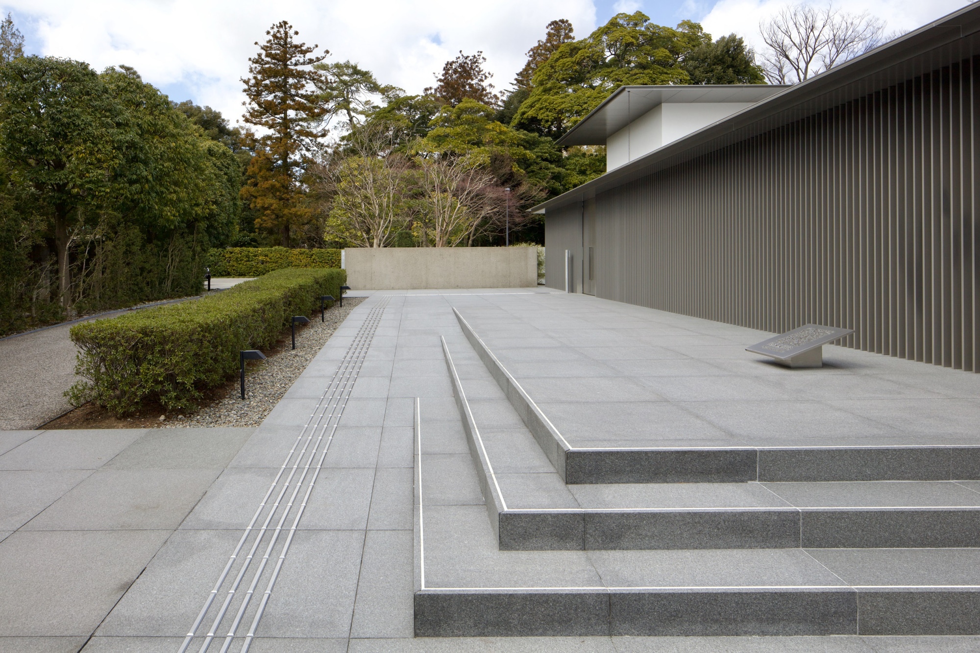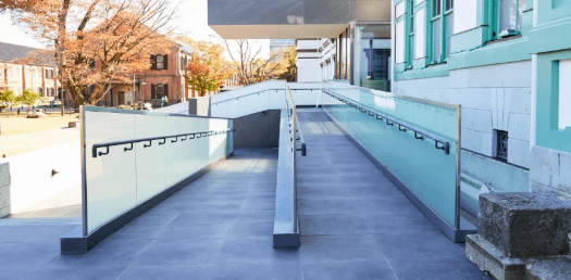 国立工芸館エントランス外、階段横に緩やかな傾斜の段差迂回スロープがあります。また、エントランスのドアは自動扉になっており、開閉に力が要らないので、介助なしでも入館しやすいです。