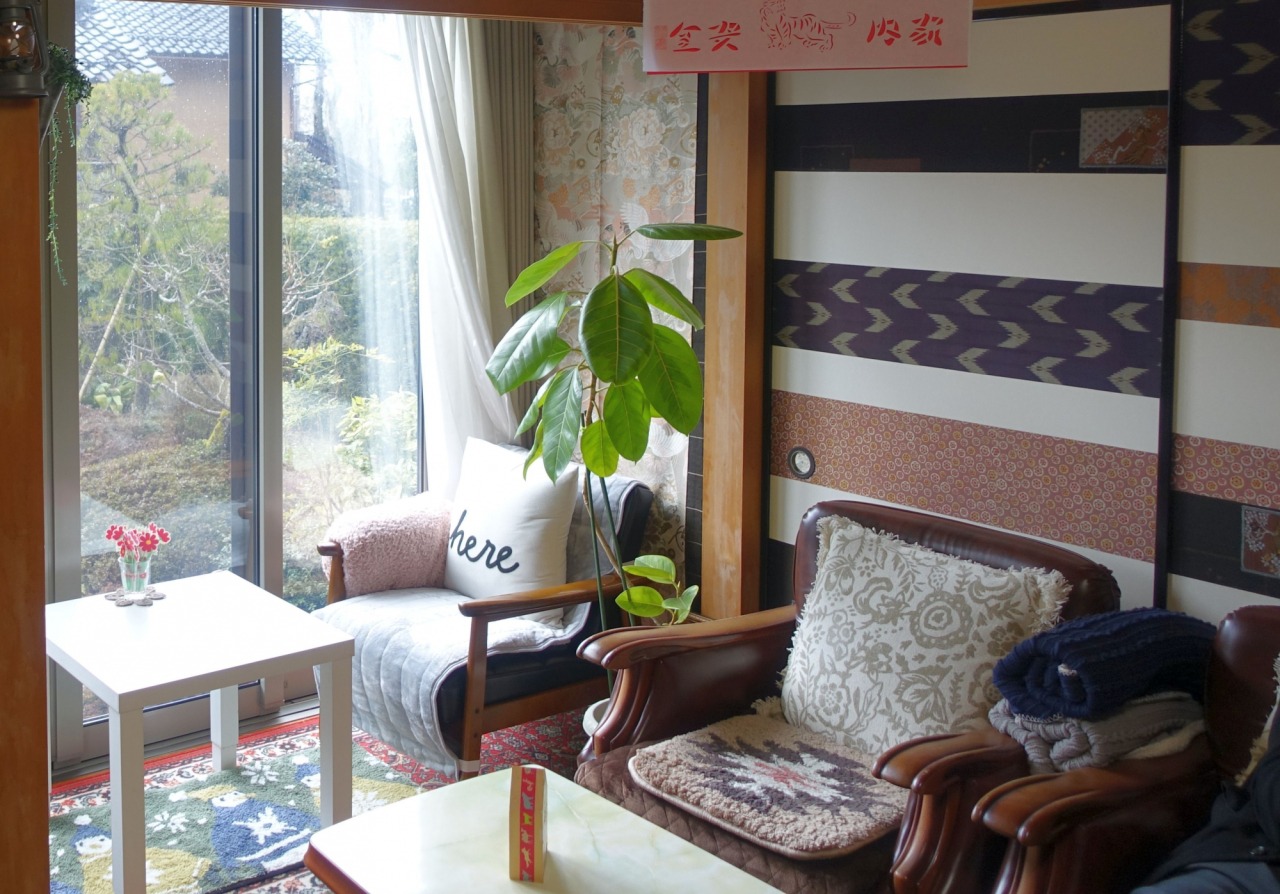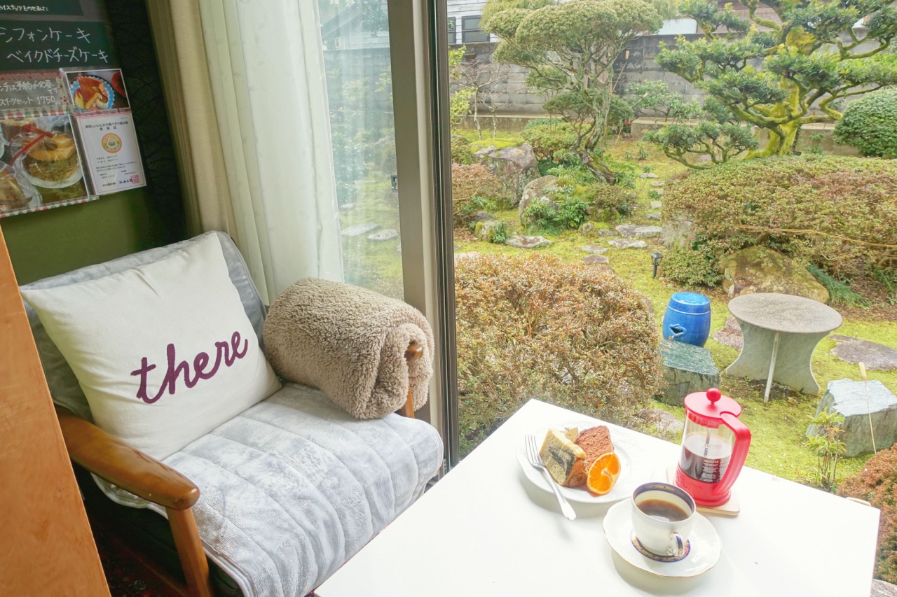 手入れが行き届いた庭を眺めるソファ席は、のんびり過ごしたいときの特等席。民家を改装した部屋はアットホームな雰囲気で、ほっと心が落ち着きます。