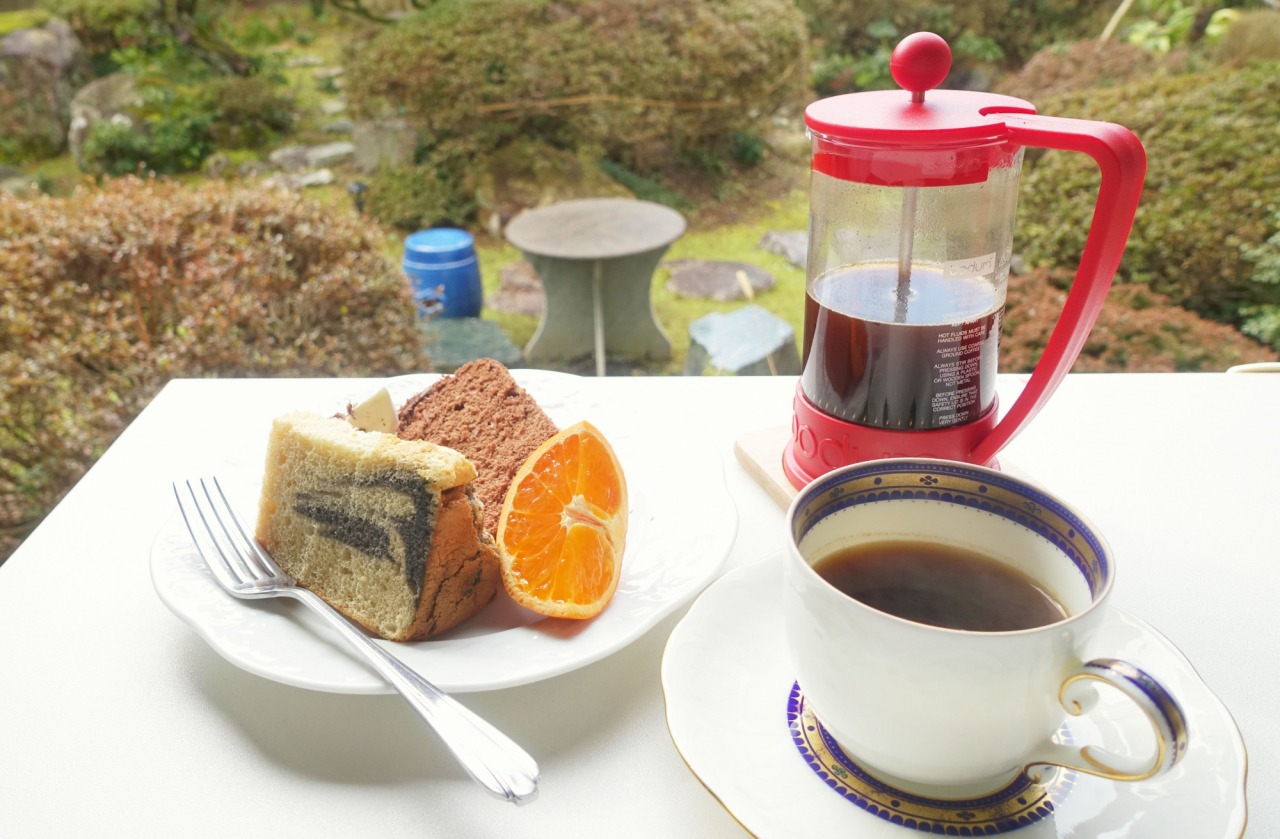 ふんわりとしたシフォンケーキには濃厚なコーヒーが合うかな~? と、フレンチプレスのコーヒー(500円)をチョイス。これが大正解の組み合わせでした。コーヒーの深いコクと、ふんわりと優しいシフォンケーキが絶妙にマッチします。