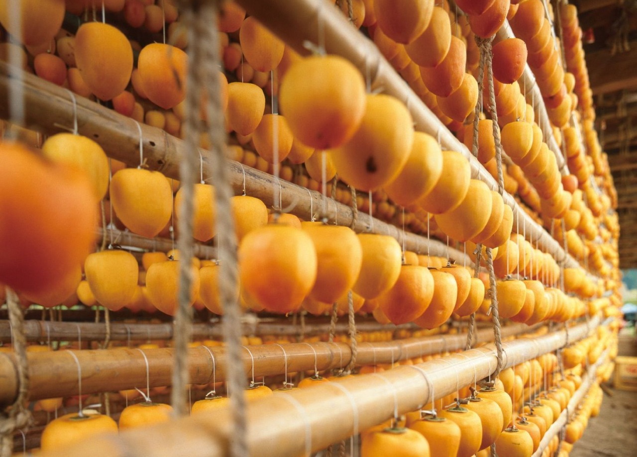 農家さんの軒先でオレンジ色のカーテンのように柿が干される光景は、志賀町の冬の風物詩なのだそう。