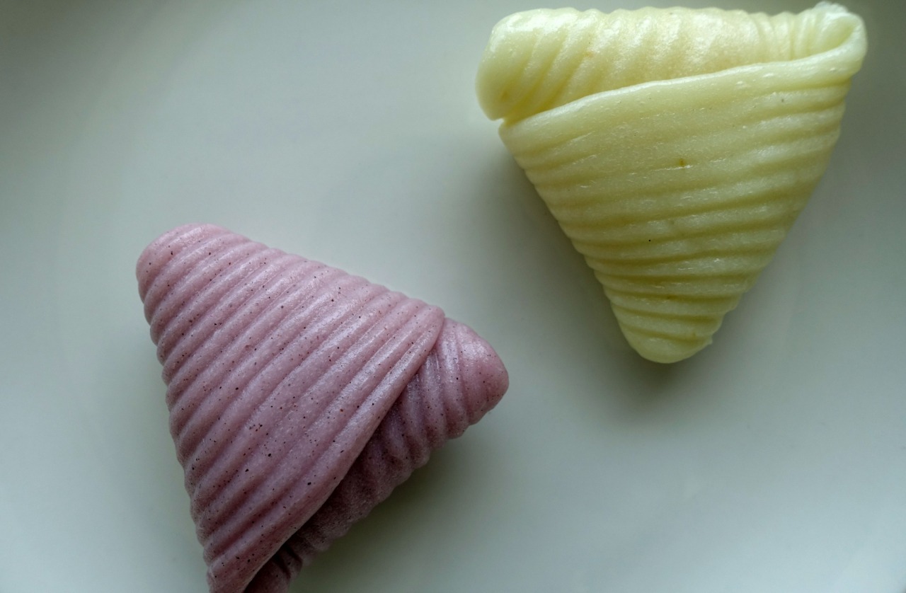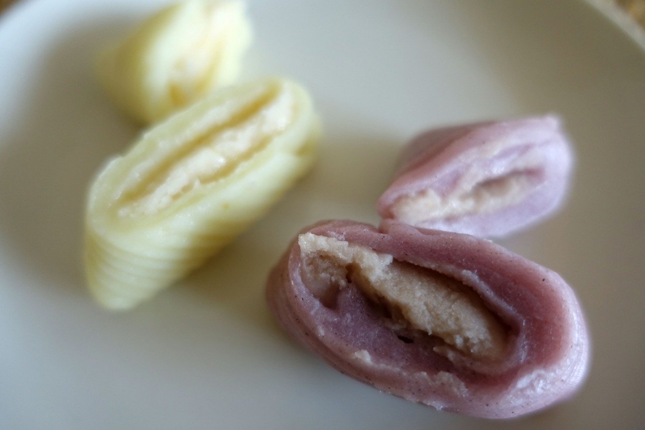 上品な紫色は、黒米粉入りの生地に、くるみ入りの味噌あんを包んだ「黒米・くるみ」。