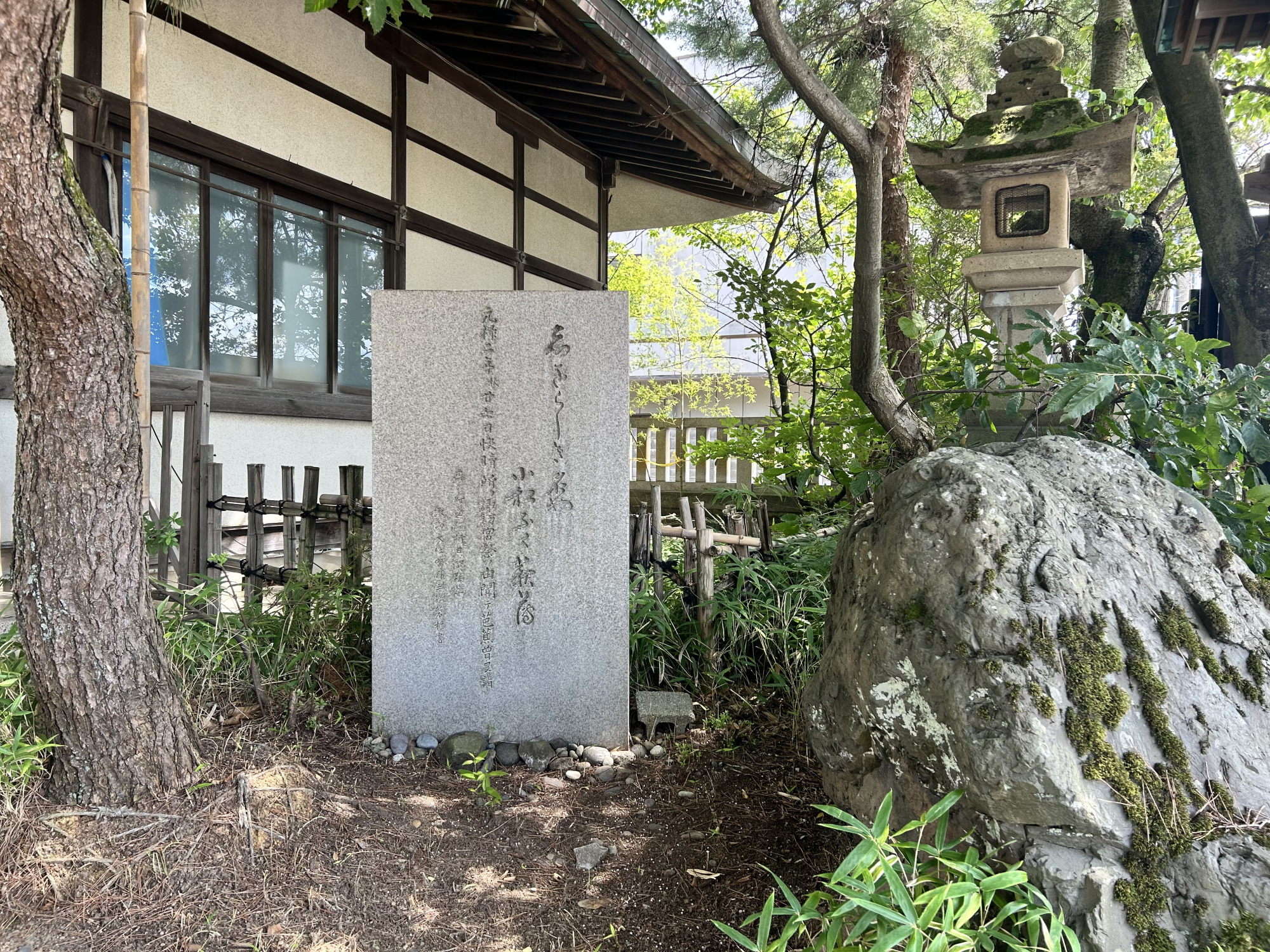小松大橋の句碑が自然風景の中にあるのに対し、こちらは町なかの静かな憩いの場にあり、より落ち着いた雰囲気の中で句と向き合うことができます。