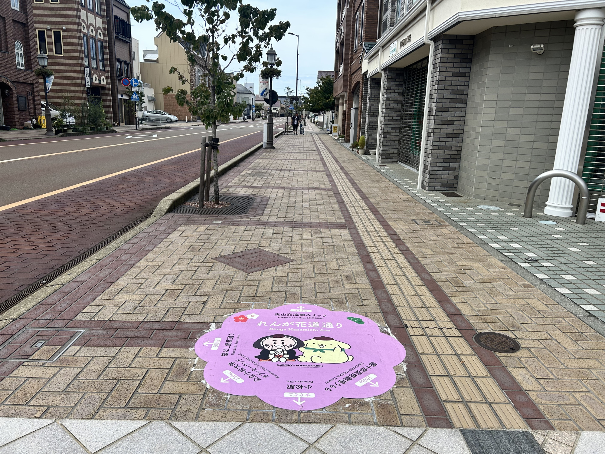 小松駅西口からまっすぐ進んだ先にある横断歩道を渡り、れんが花道通りに入ります。横断歩道を渡った先の道には、小松市のご当地キャラクター「カブッキー」と、サンリオのキャラクター「ポムポムプリン」が描かれた案内図が設置されており、進む方向を示してくれるため、迷う心配もありません。