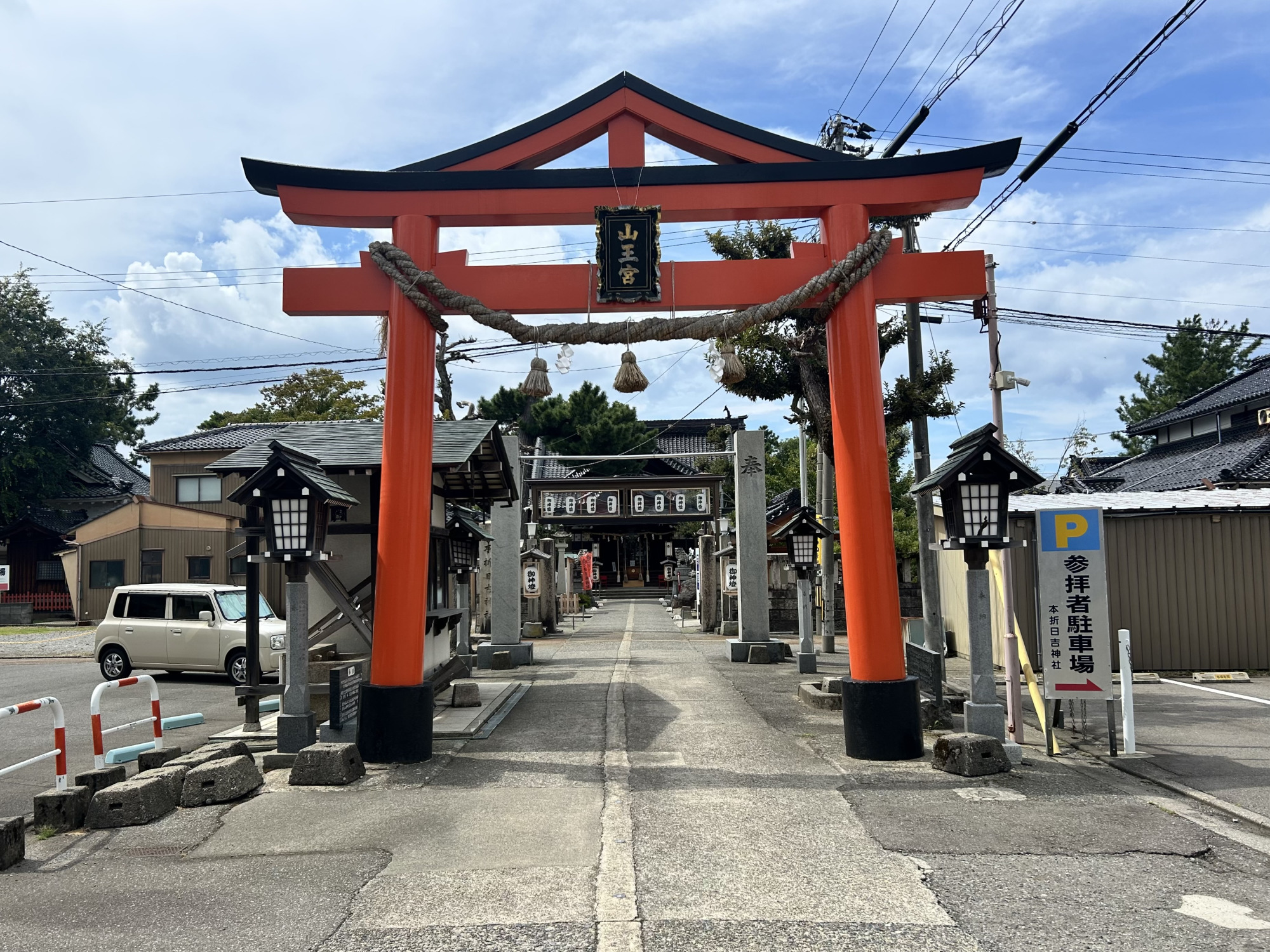 町の中心に位置する本折日吉神社は、破風付きの朱塗りの鳥居が印象的で、「山王さん」「日吉さん」の名で地元の人々に親しまれています。