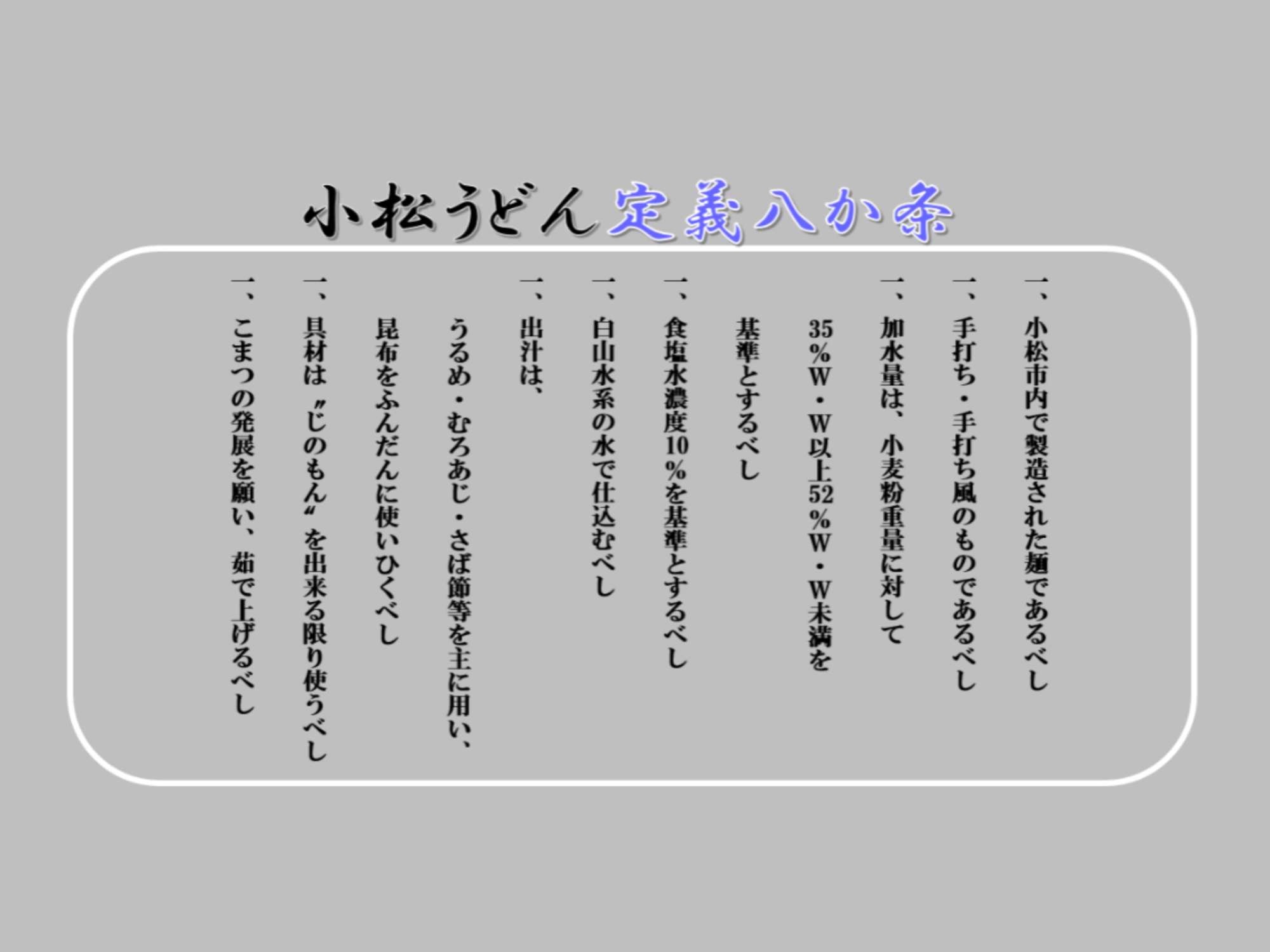 小松うどんには「定義八か条」がありますが、ルールはそこまで厳格ではないため、同じ小松うどんでも店舗ごとに異なる味わいを楽しむことができます。