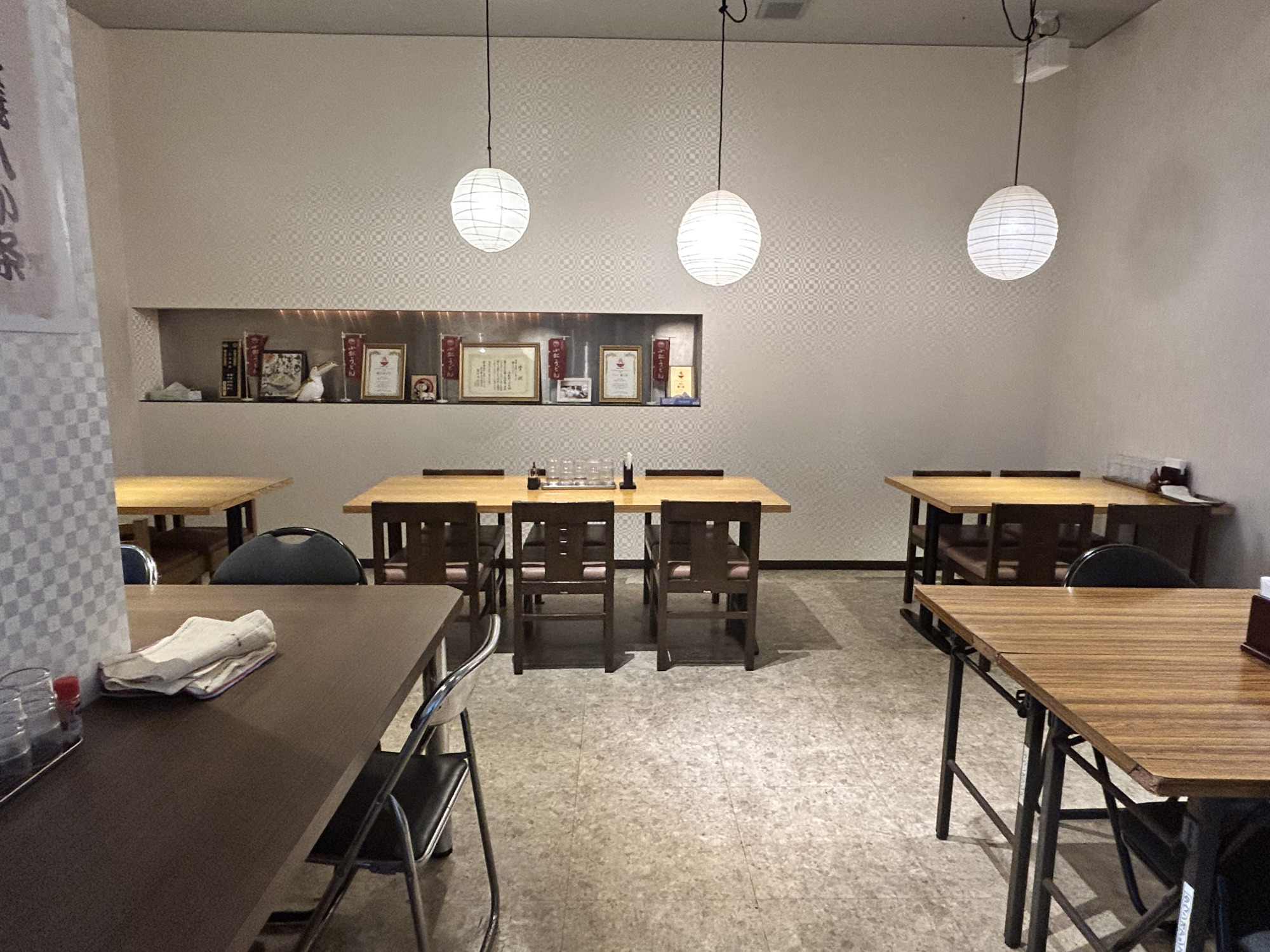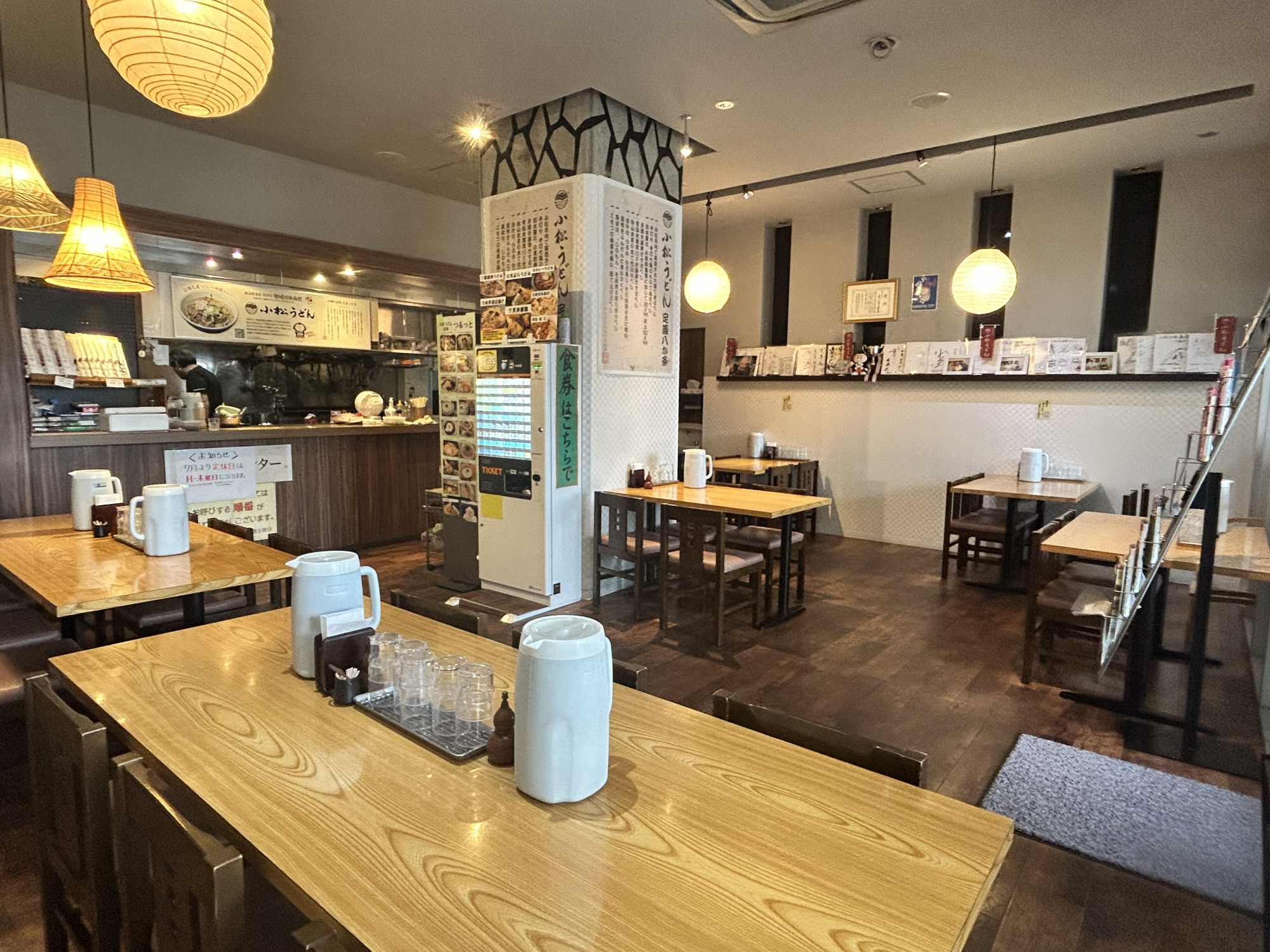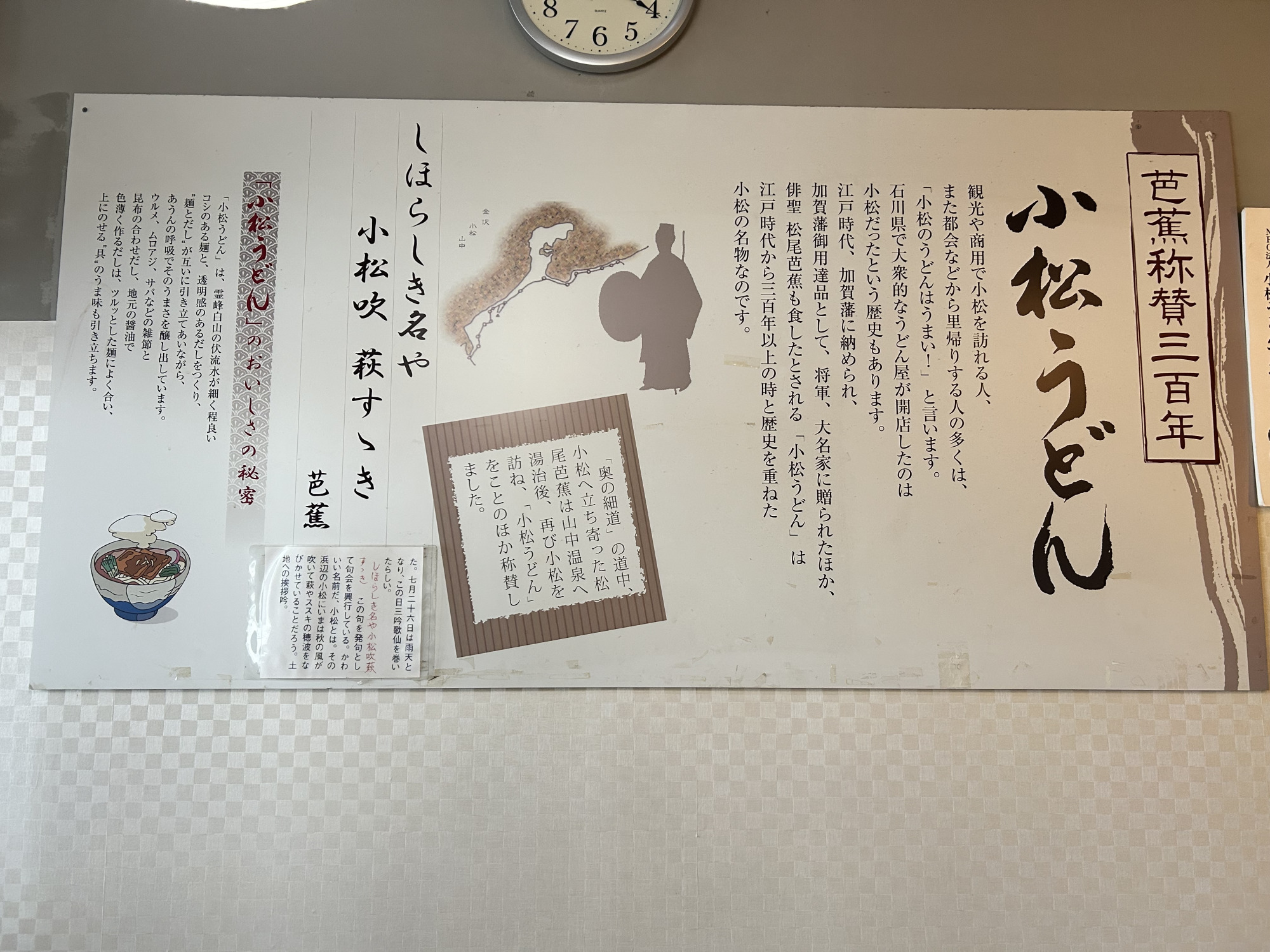 店内は、オレンジ色の照明に木の床やテーブル、白い壁が調和した、柔らかく温かな雰囲気。壁には「小松うどん定義八か条」や「松尾芭蕉と小松うどんの関わり」などが紹介されており、旅の締めくくりにふさわしく、最後まで芭蕉の面影を感じながら食事を楽しむことができます。