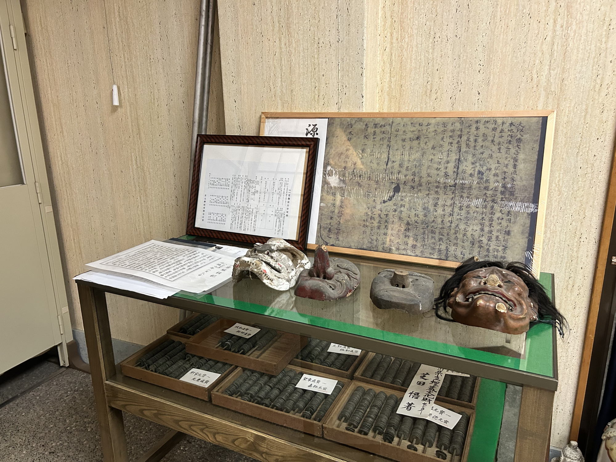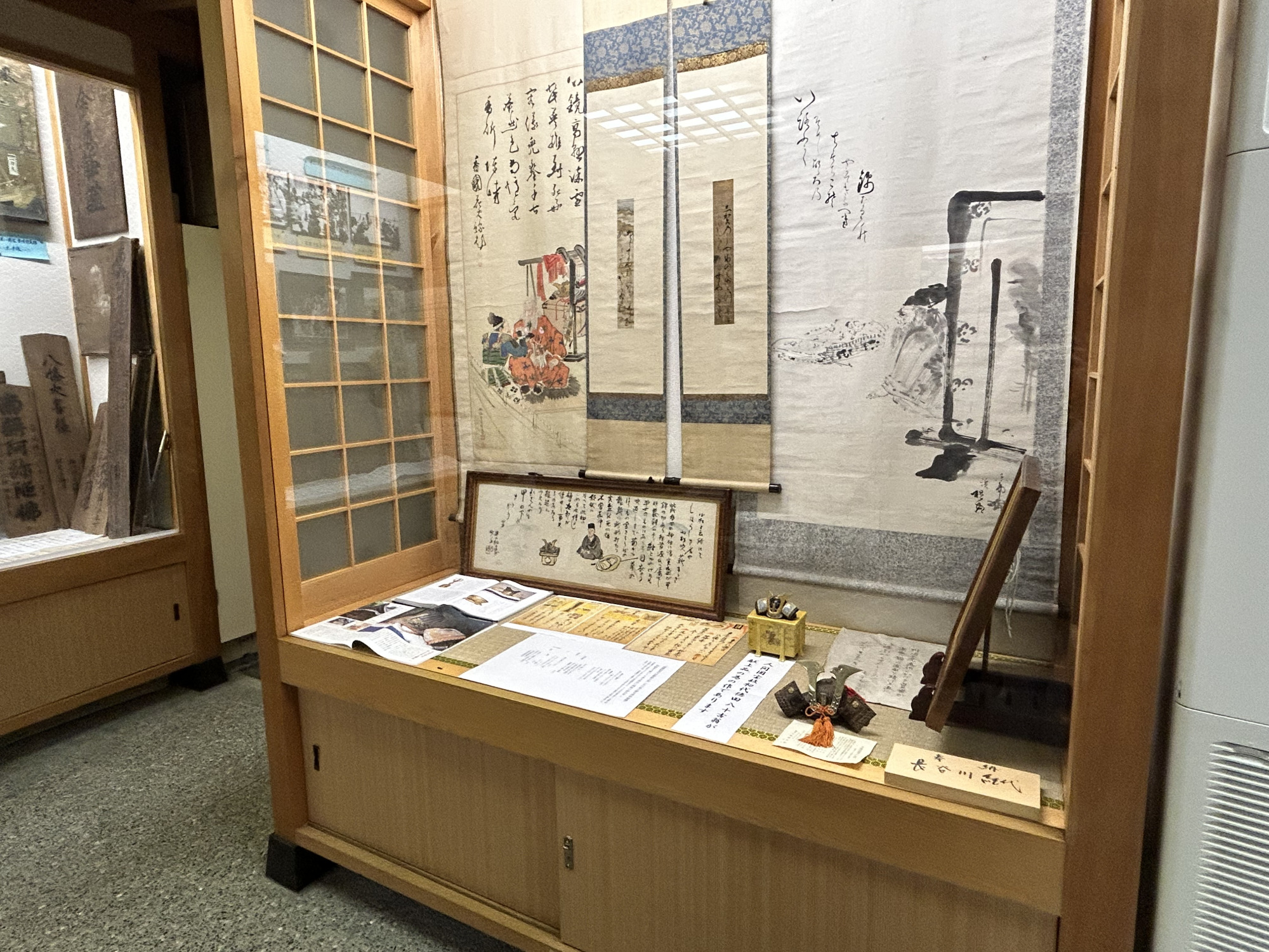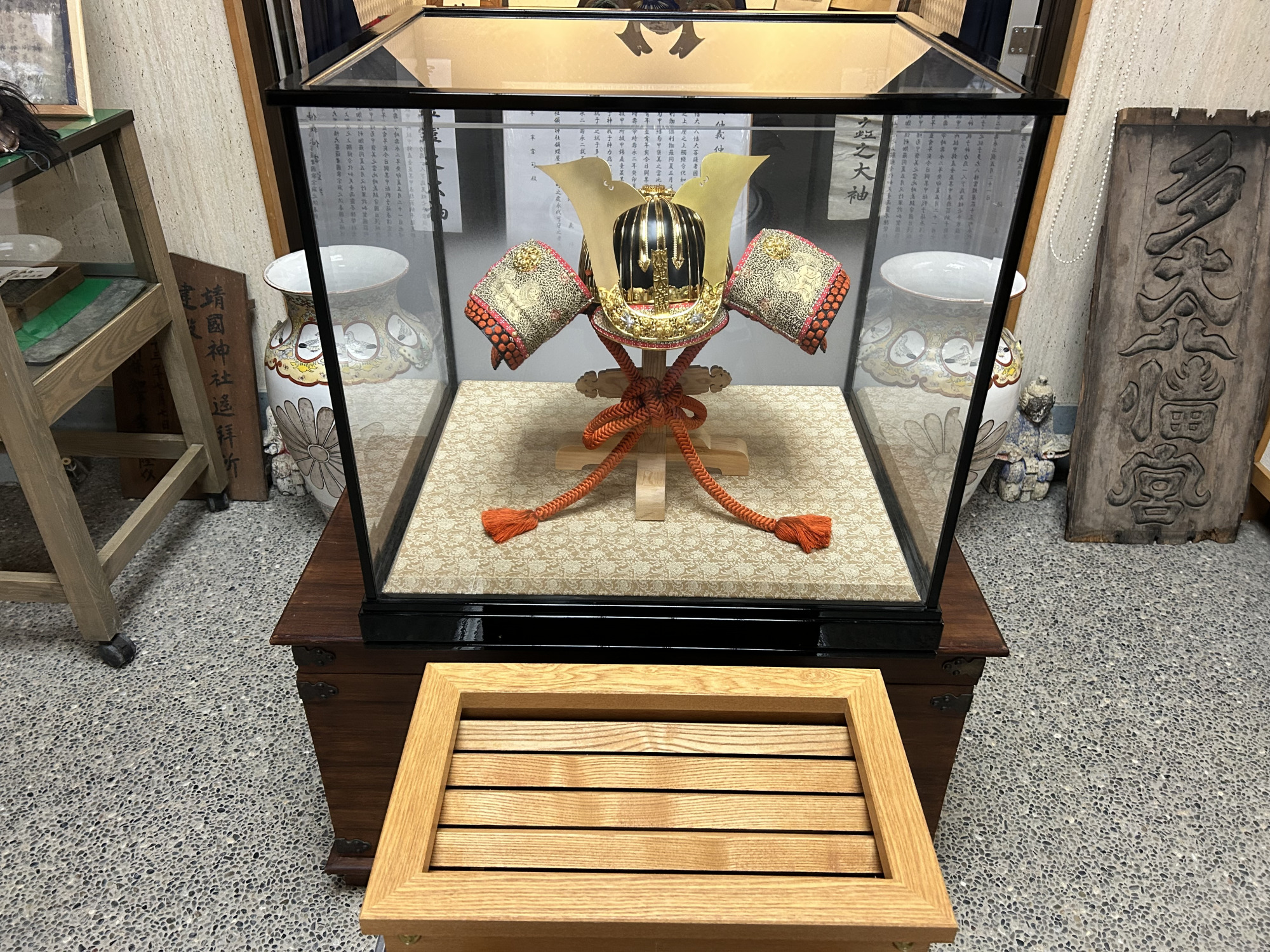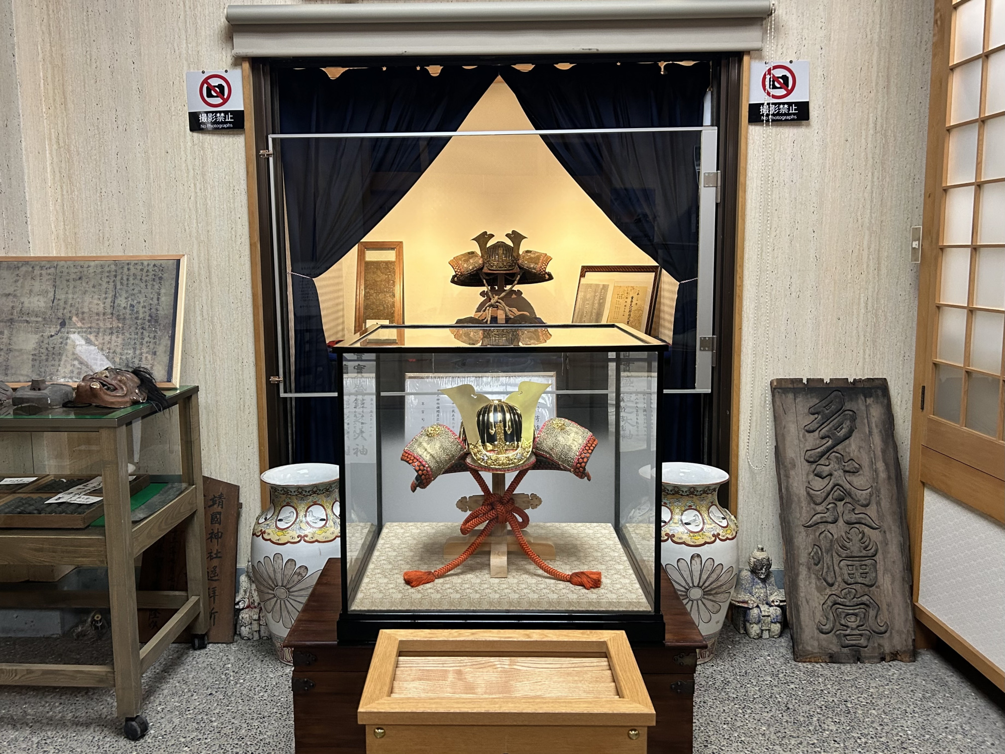 実際に実盛が使用したと伝わる兜は、レプリカの奥にあるショーケースで厳重に保管されており、光による劣化を防ぐため、普段はブラインドが下ろされています。目の前で静かに上がるブラインドは、まさに秘宝が姿を現すかのような演出です。