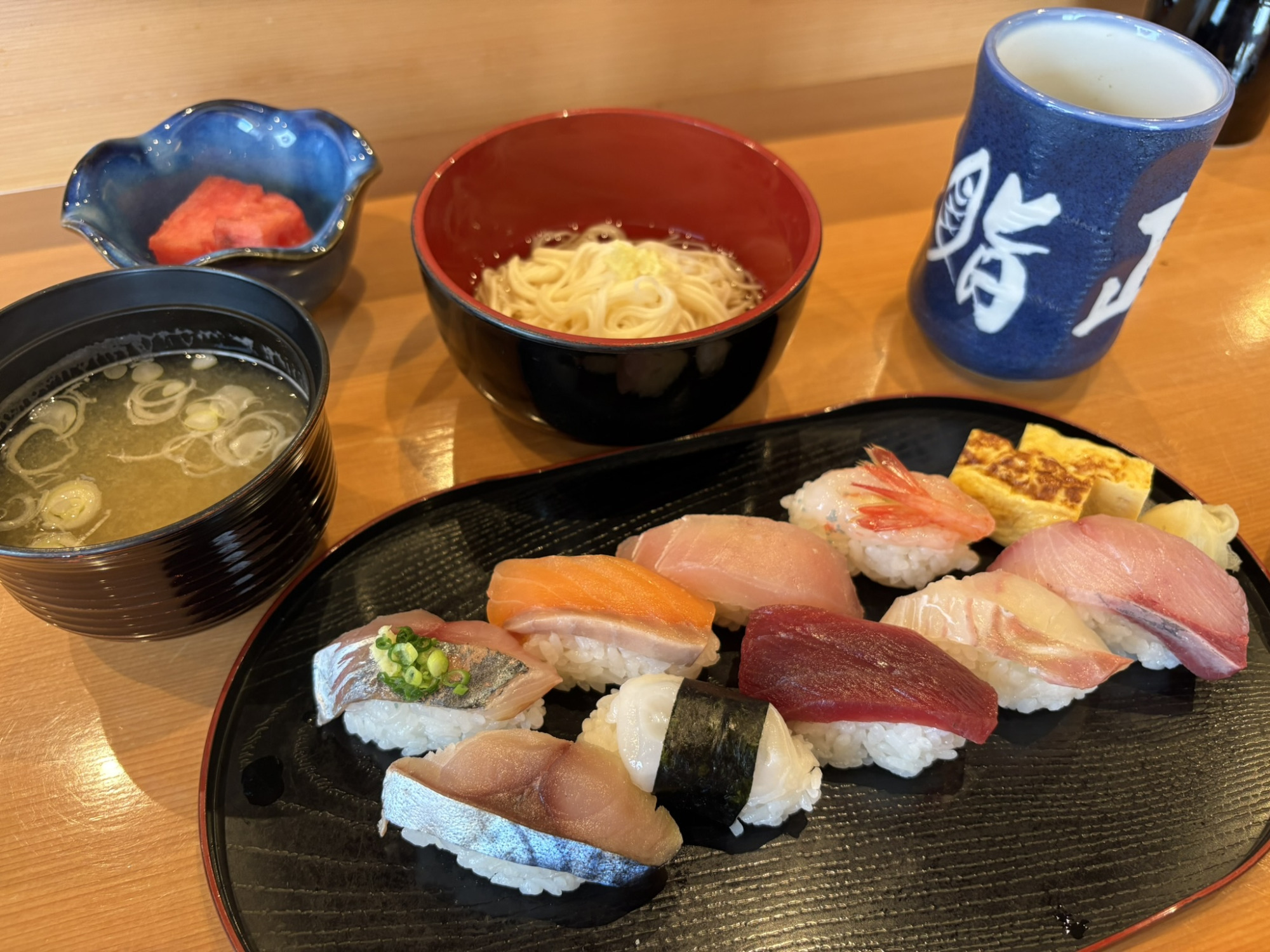 この日いただいた握りランチは、1,700円(税込)で、握り9貫に卵焼き、そうめん(またはうどん)、みそ汁、フルーツ付き!筆者に同行した食べ盛りの中学生の息子も、大満足のボリュームです。