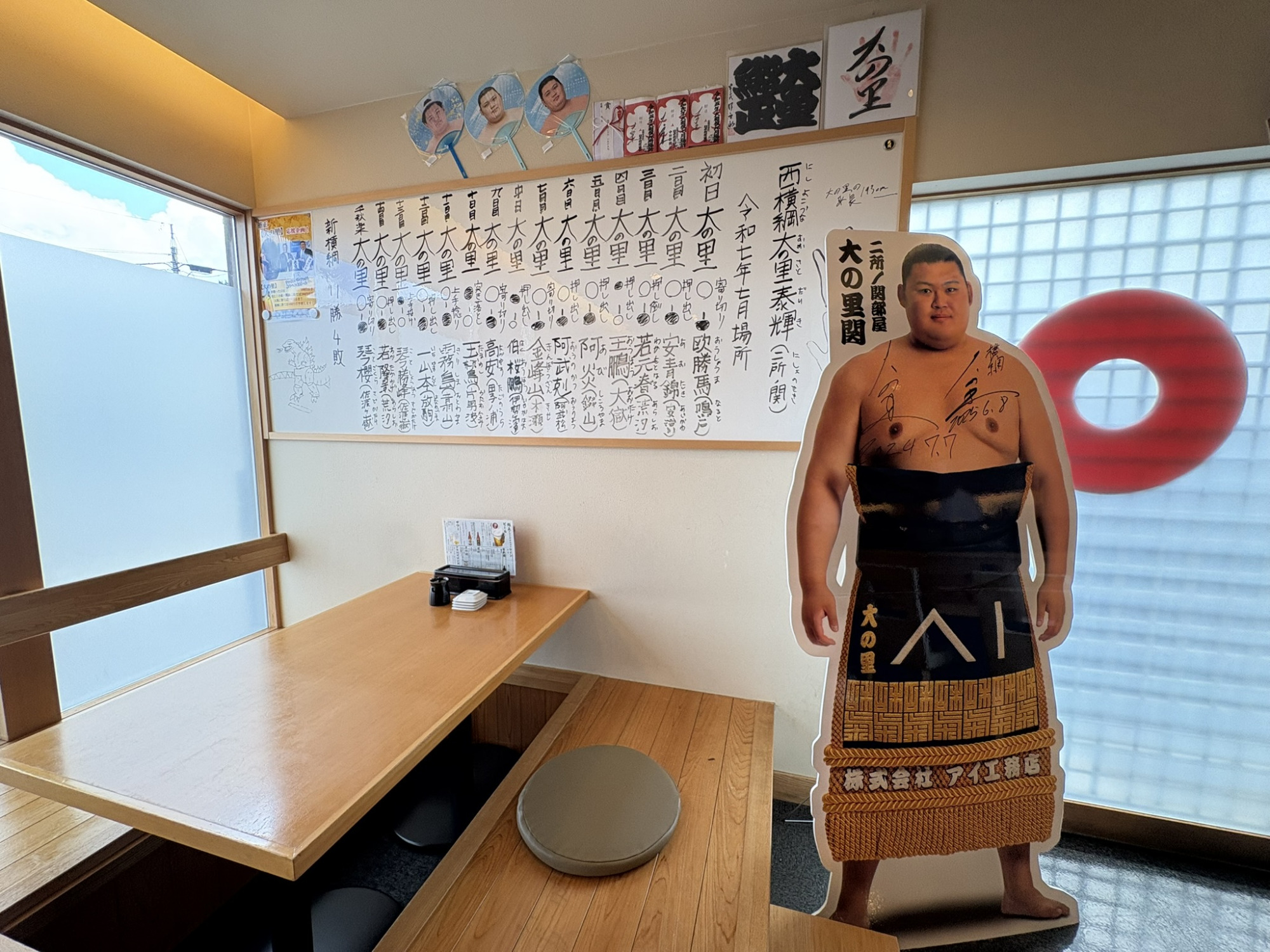 店の一角には、大きな全身パネルも。こちらは祝賀会のために制作したものを、大の里関の父親から譲り受けたんだそうです。