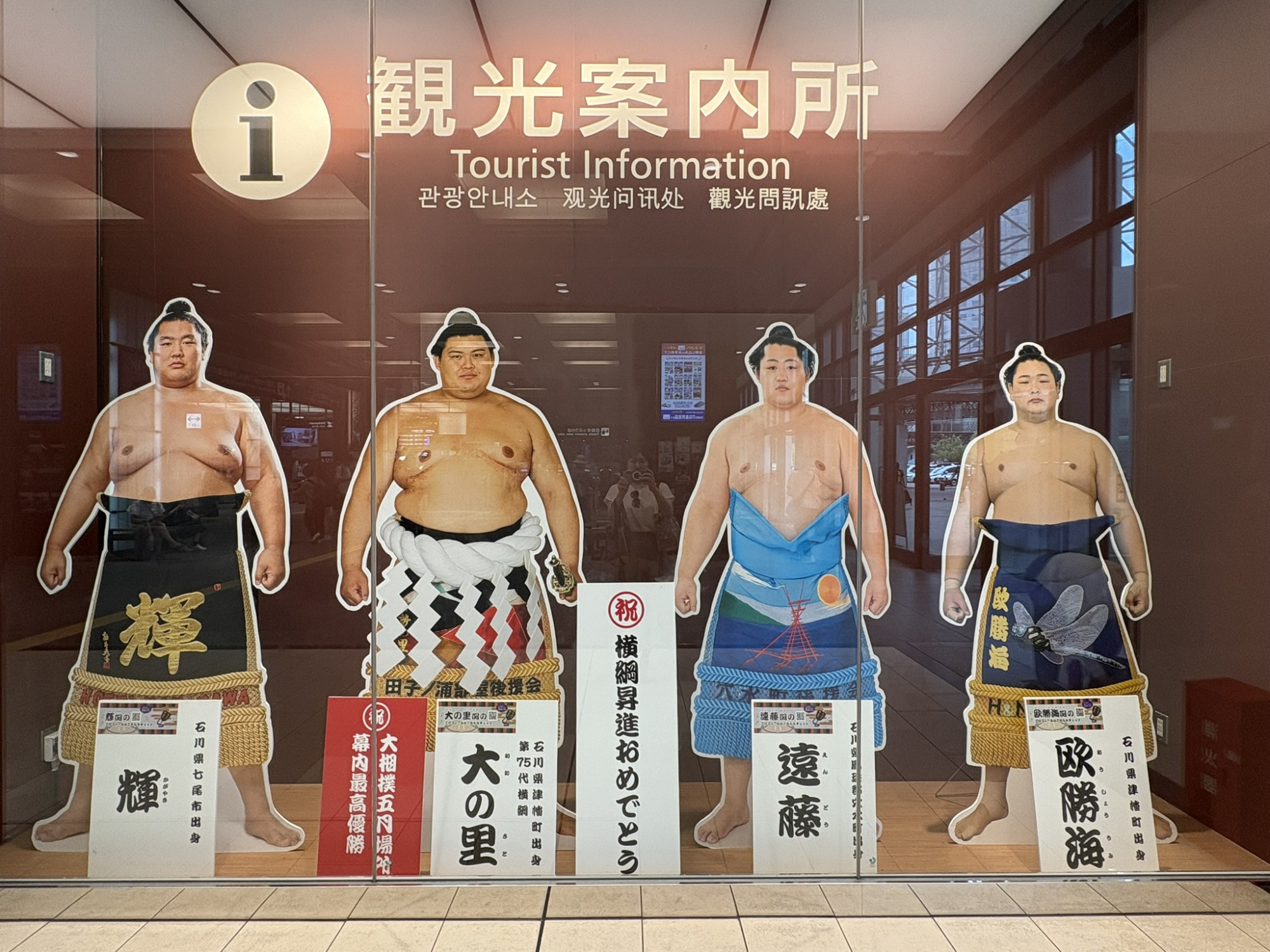 金沢の玄関口・金沢駅の観光案内所では、大の里関をはじめとする郷土ゆかりの力士たちが、等身大パネルでお出迎えしてくれます。多くの観光客がこのパネルの前で写真を撮っている姿を見かけるので、必ずおさえておきたいフォトスポットです。