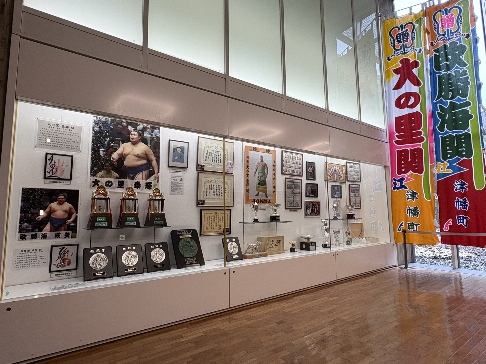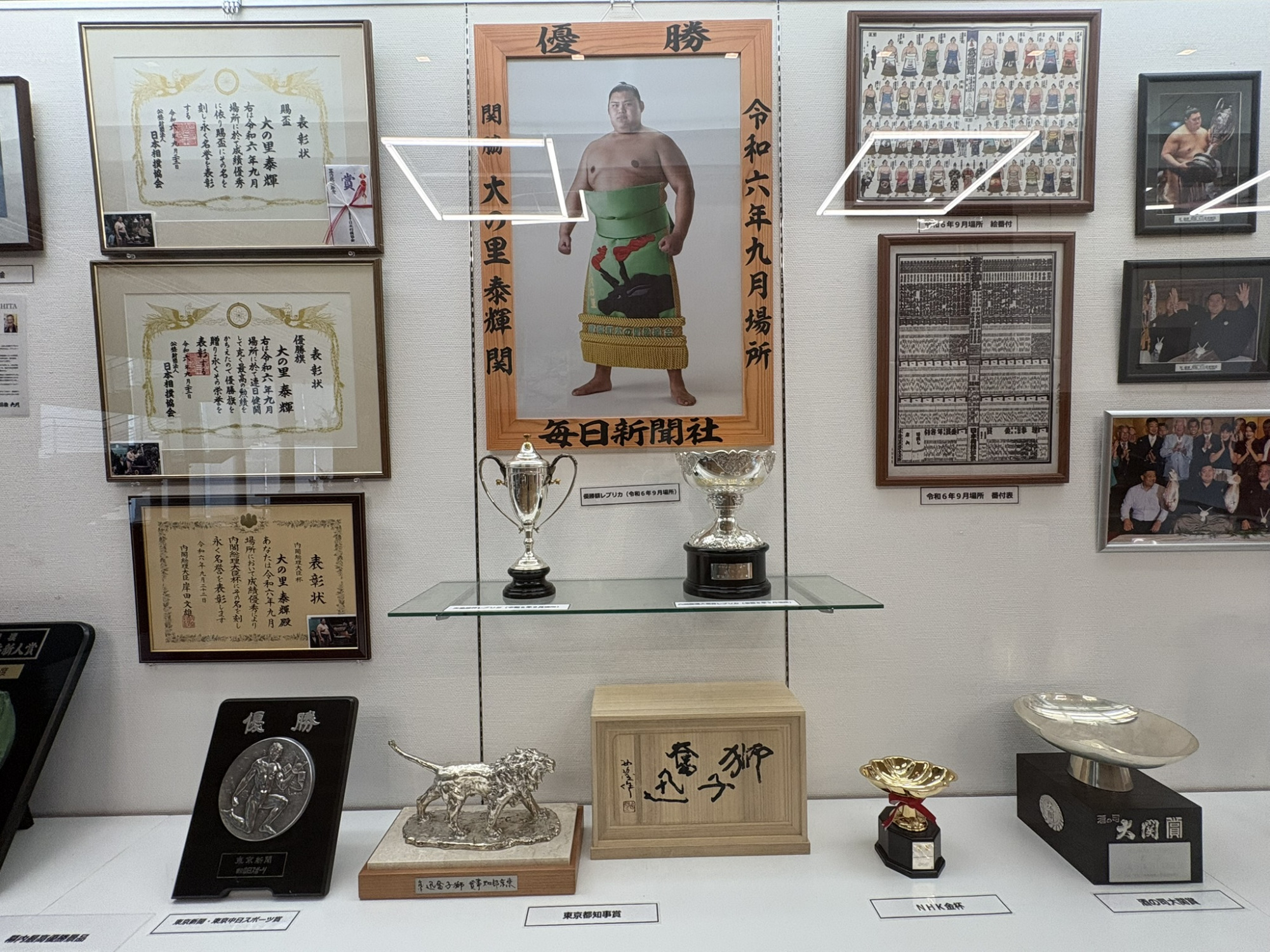 展示ケース内には、大の里関から町に提供された昨年9月場所の優勝額レプリカをはじめ、殊勲賞・敢闘賞・技能賞の三賞のトロフィー、天皇賜杯と内閣総理大臣杯のレプリカなどが飾られています。