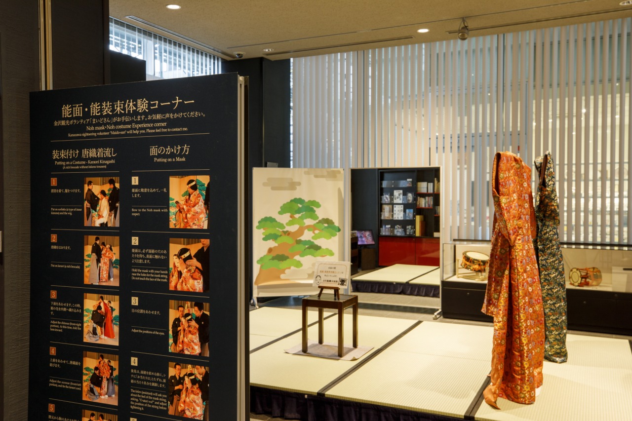 なお、1階奥には体験用の能装束と能面が展示されています。現在はコロナウィルス感染拡大防止のため中止しておりますが、通常時は着装体験や記念撮影なども可能ですので、金沢旅行の思い出にぜひ体験してみてくださいね。