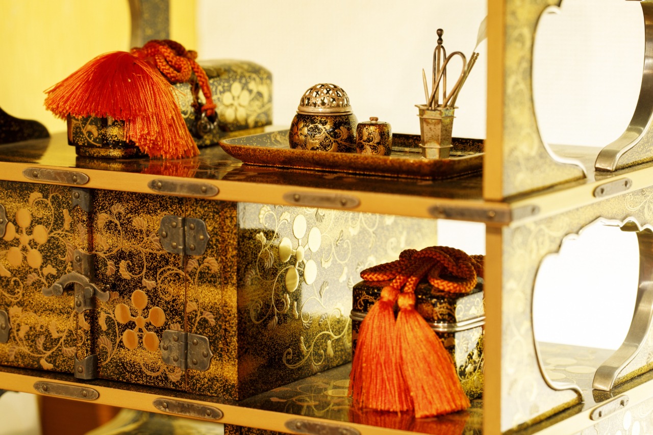「こちらの雛飾りは成巽閣に現存する実物を現代の職人が忠実に再現しました。細部までしっかりと作り込まれており、この3品を制作するのに約3年を要しました。小ぶりな作品ながら金銀の蒔絵や螺鈿が施された精巧かつ絢爛豪華な作りで、加賀百万石の文化の奥深さを感じられる逸品です」と岡さん。