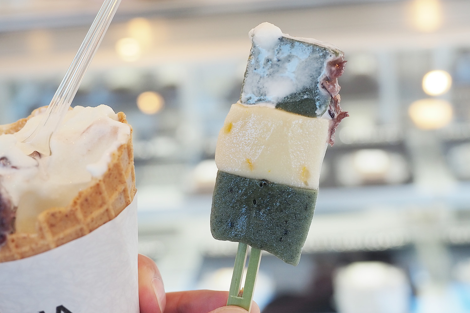 【写真のメニュー】牧草×アーモンドプラリネ(1枚目)、河北潟すいか×チョコミント(2枚目、夏季限定)