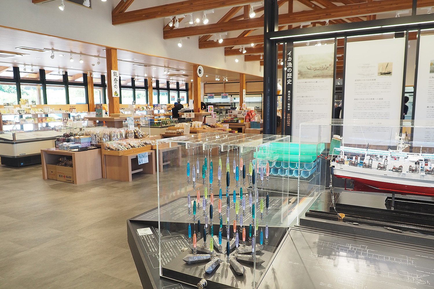 日本三大イカ釣り漁港・能登小木港近くの道の駅「イカの駅つくモール」では、全長13mのイカキングがお出迎え。館内もイカづくしですが、特に人気なのがイカスミソフト。塩分が甘さを引き立て、クセになる味わいです。夏はイカキングと写真を撮ると手が真っ黒になりがちなので要注意! 食後は遊覧船で九十九湾を楽しむのもおすすめ。