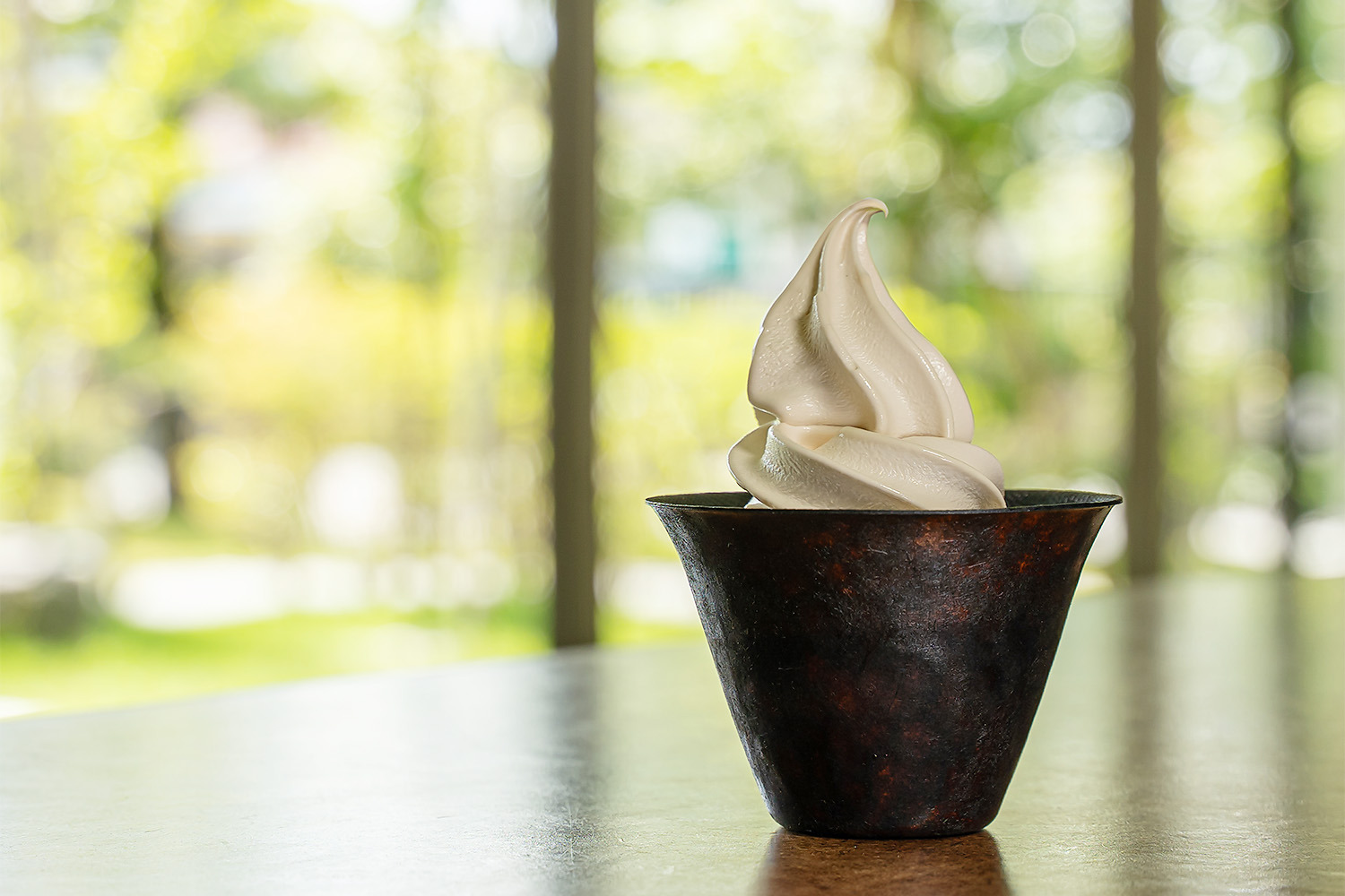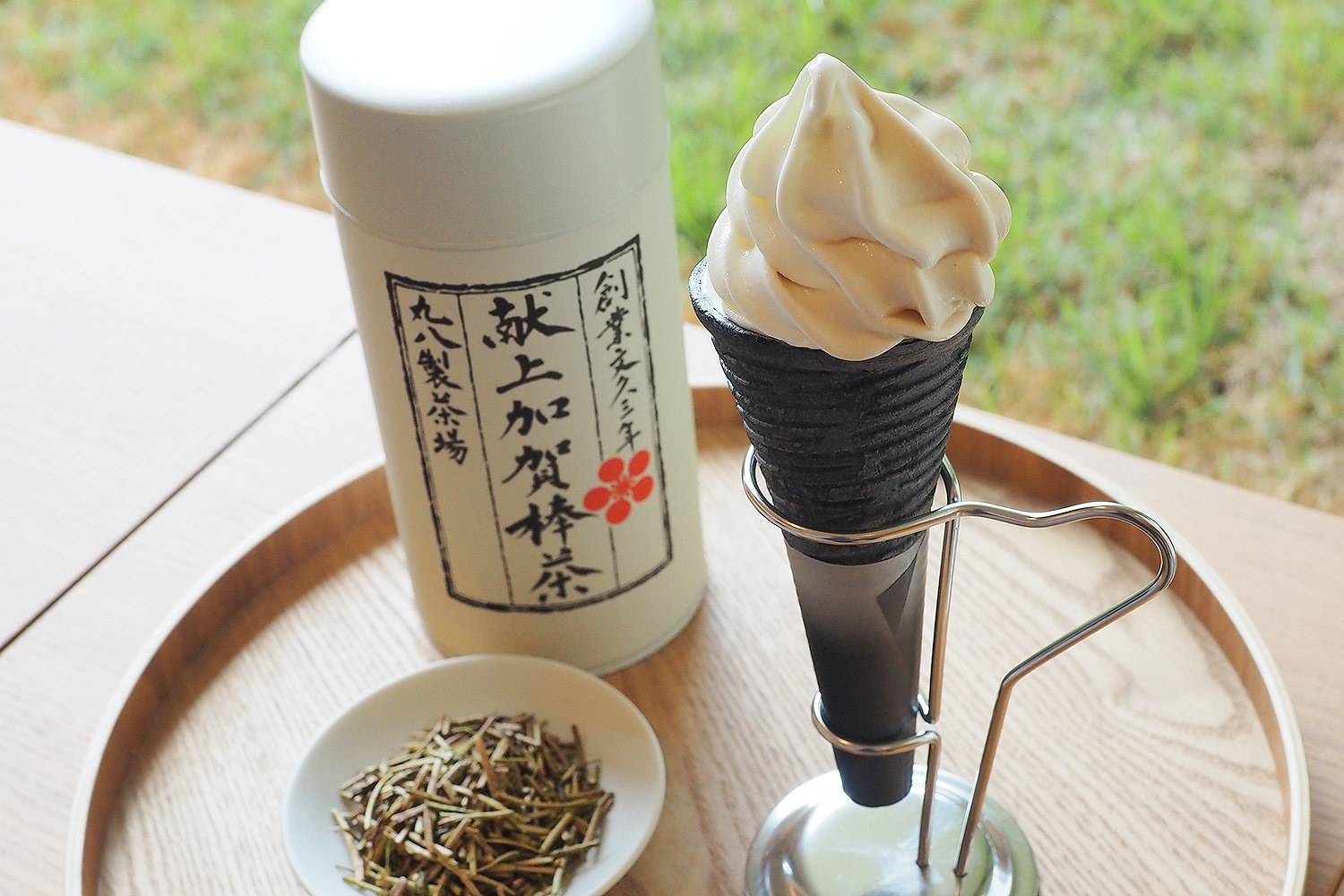 加賀市に本店を構える、1863年創業の「丸八製茶場」から、極上のソフトクリームが登場。昭和天皇に献上された「献上加賀棒茶」と北海道産の新鮮な生乳を使い、滑らかな口当たりに上品な香りは、まるで「献上加賀棒茶」を食べているかのような感覚。山中塗の拭き漆加工カップと竹炭入りコーンで提供する、こだわりぬいた至高の一品です。