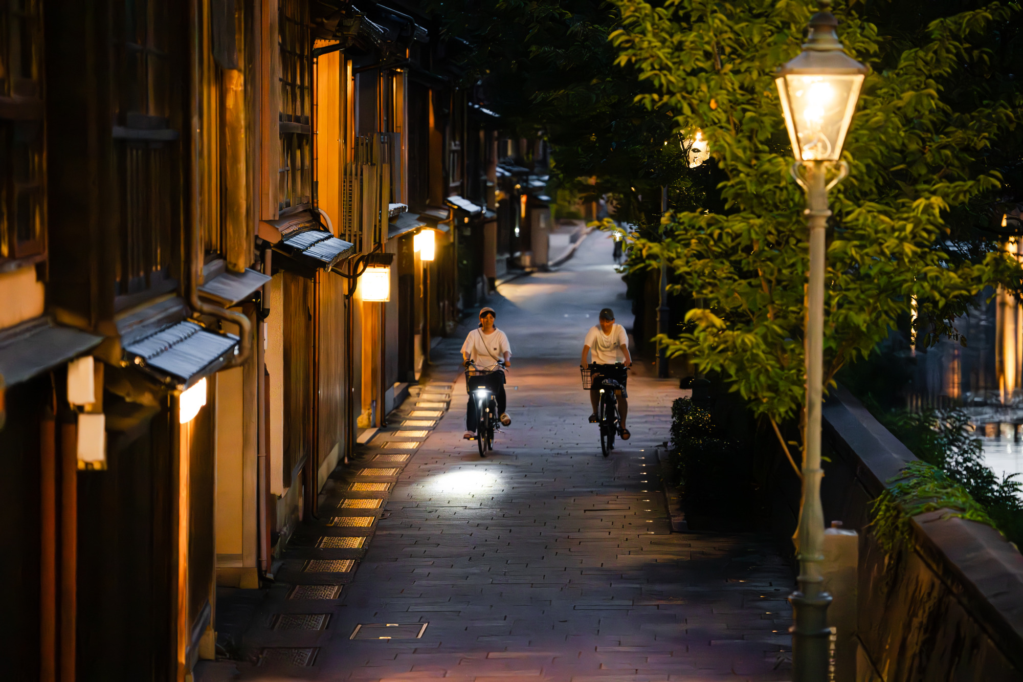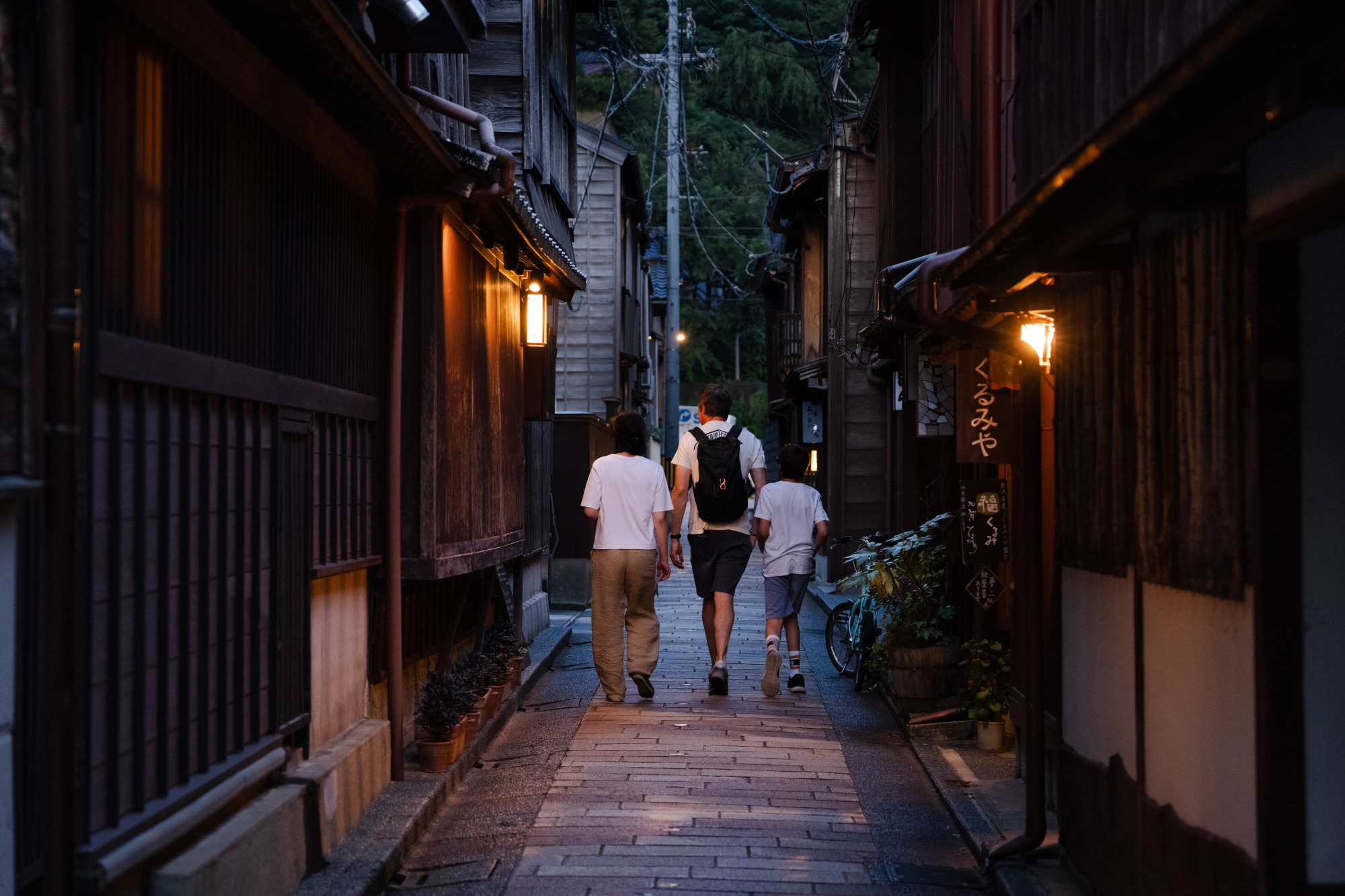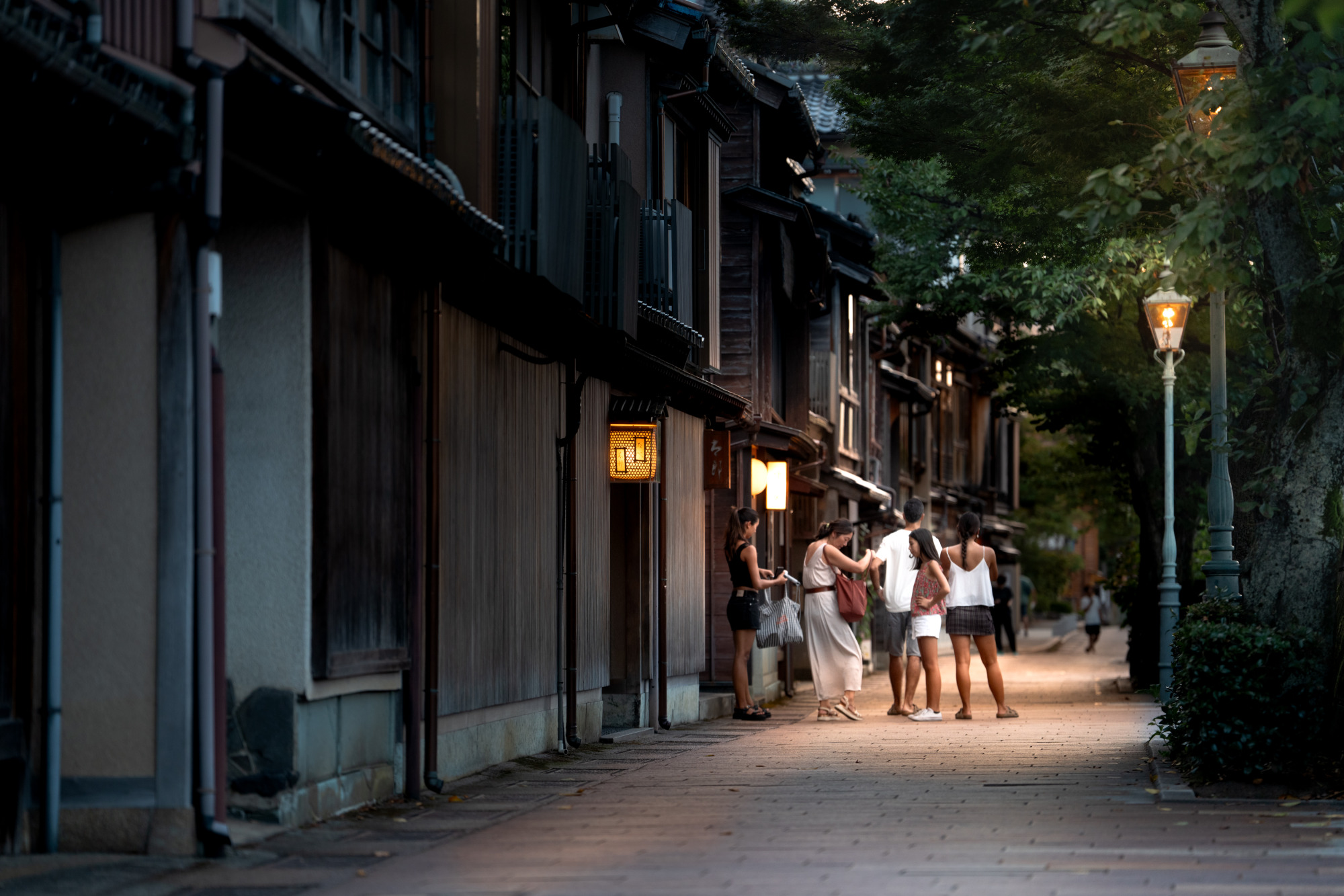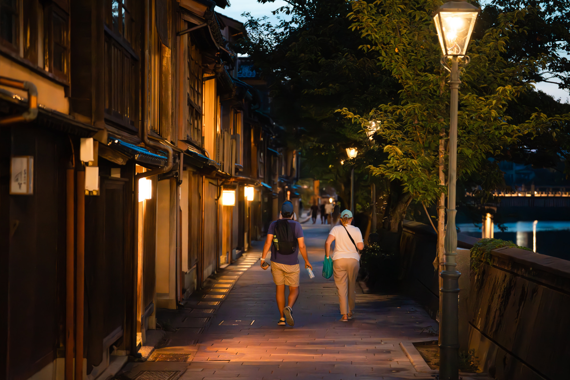 昼は観光客で賑わうエリアですが、夜には建物の外観がライトアップされ、静かで落ち着いた雰囲気の中、茶屋街ならではの街並みをゆっくりと楽しむことができます。