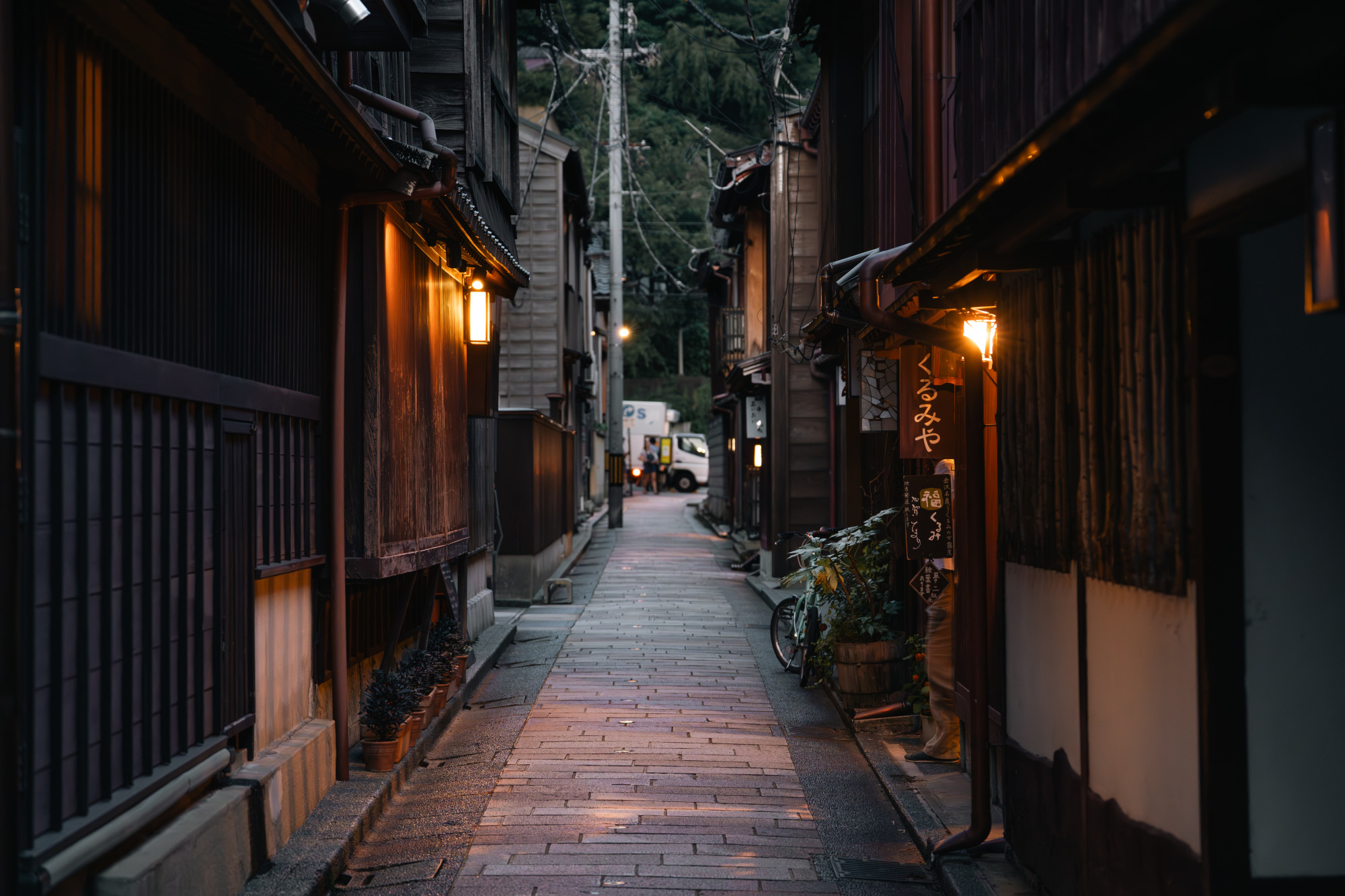 主計町茶屋街は、浅野川沿いに位置する金沢市の歴史的な茶屋街で、国の重要伝統的建造物群保存地区に選定されています。明治時代から続く町家が並び、現在も一部で茶屋営業が行われています。周辺には「暗がり坂」や、浅野川にかかる「中の橋」などの見どころがあり、散策路としても整備されています。夜間は建物の外観や橋周辺がライトアップされ、落ち着いた雰囲気のなかで歴史ある街並みを楽しむことができます。