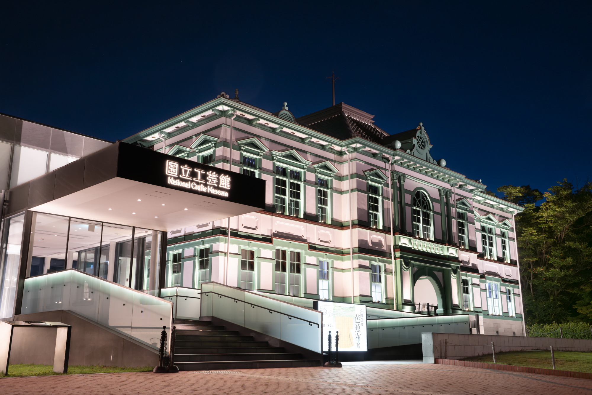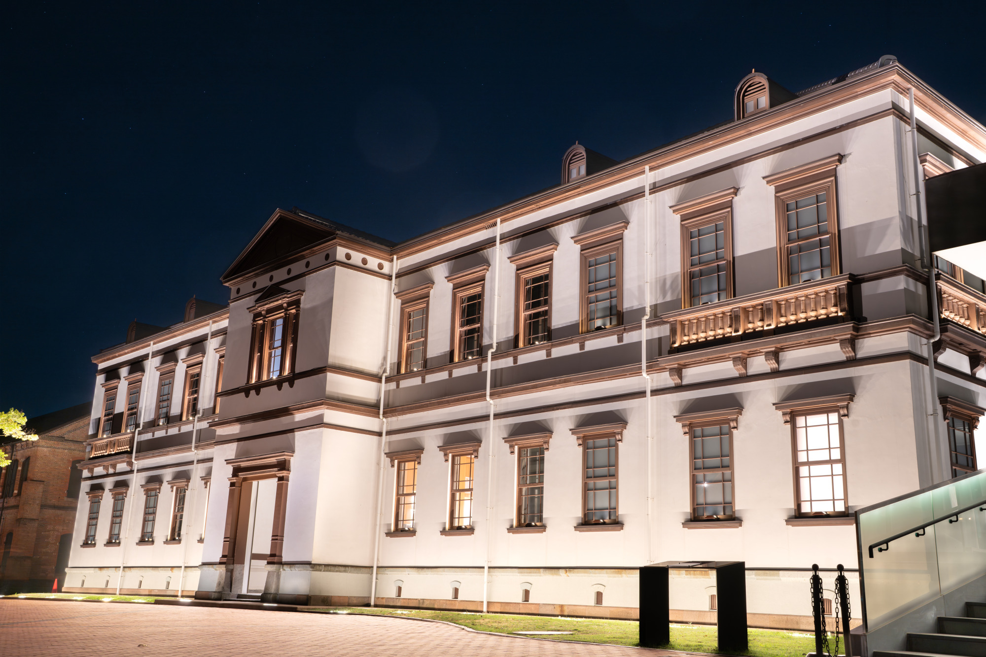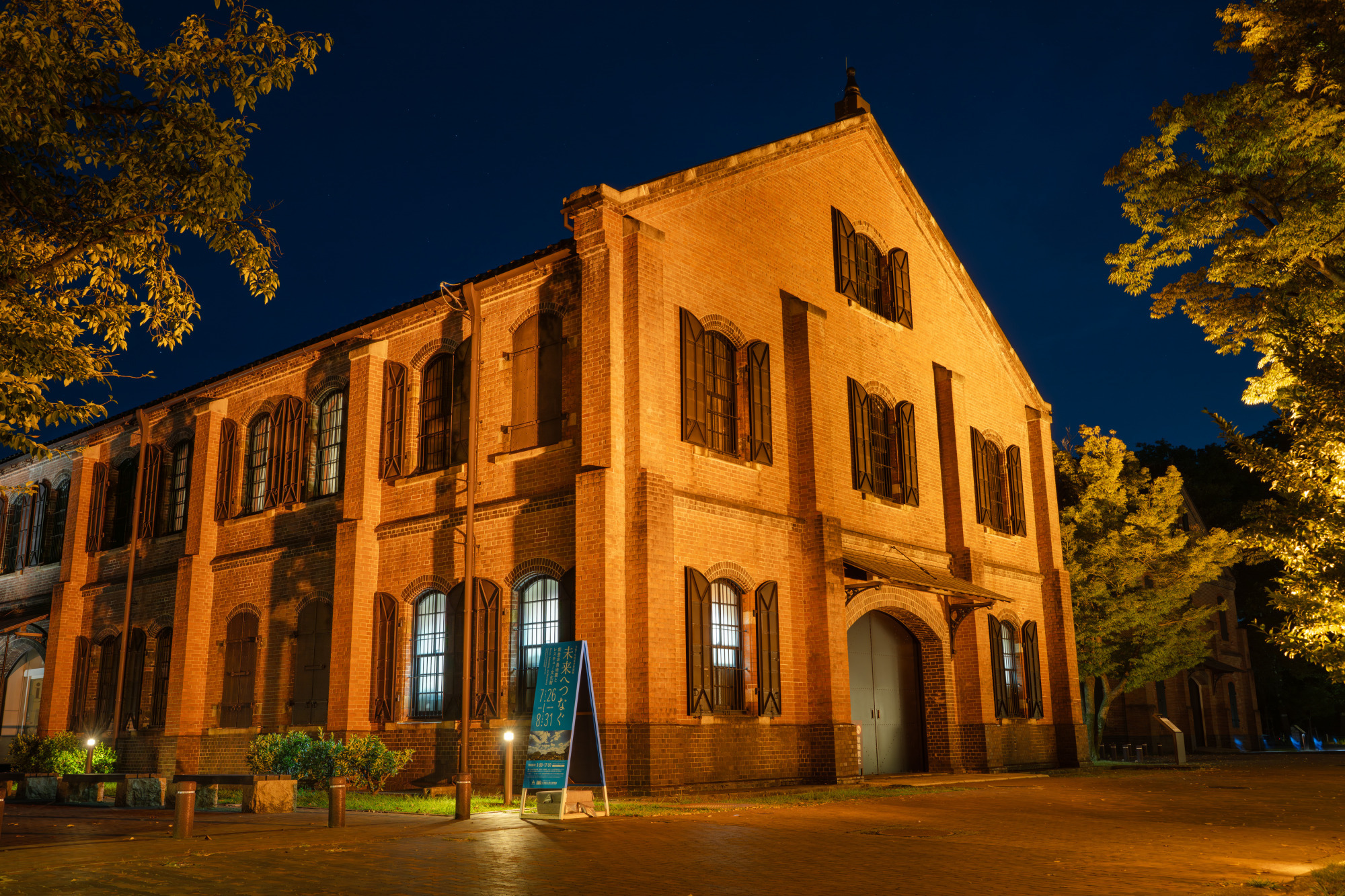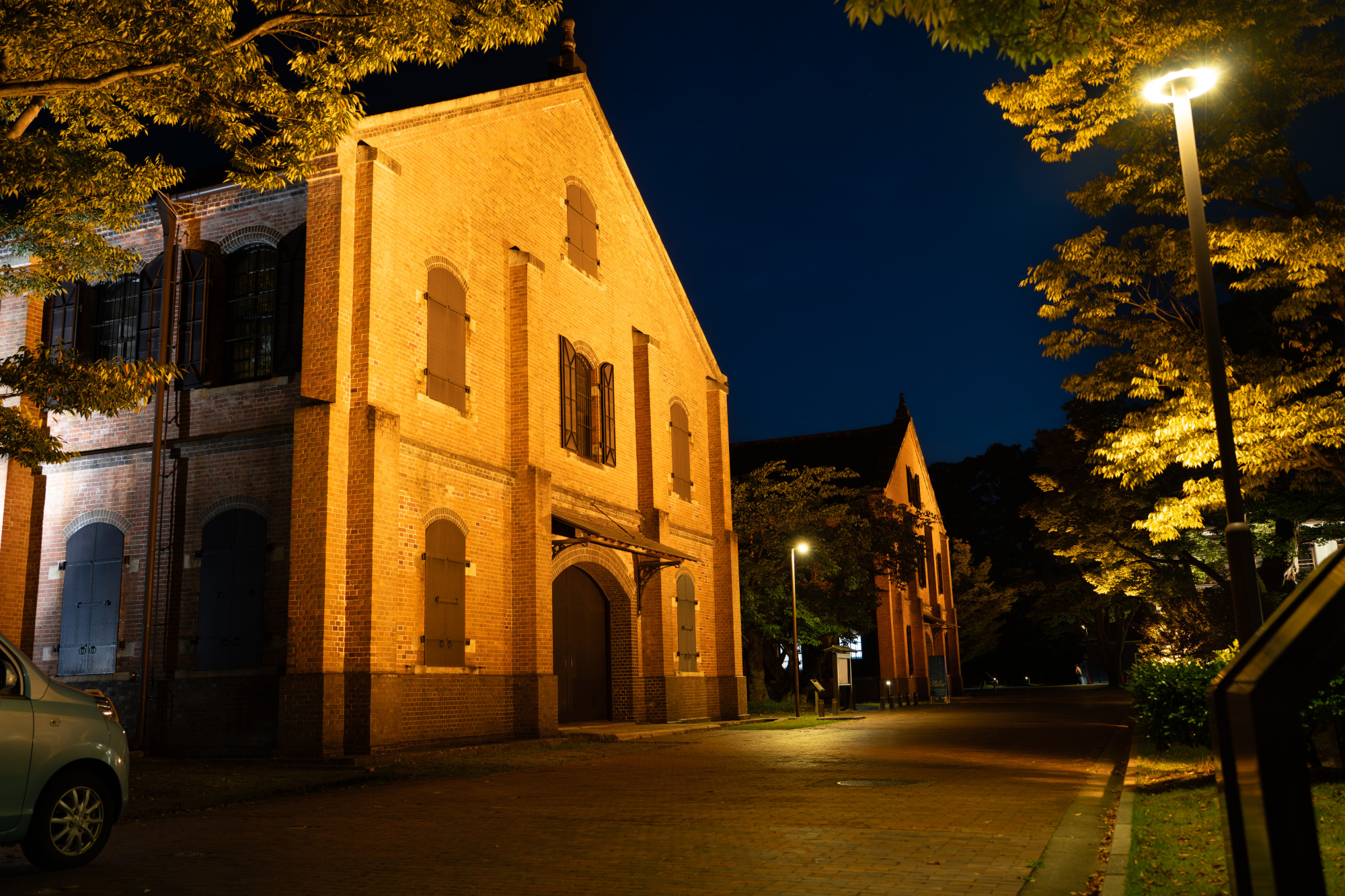 夜間は外観がライトアップされ、重厚な赤レンガの建物が幻想的に浮かび上がる姿が印象的です。