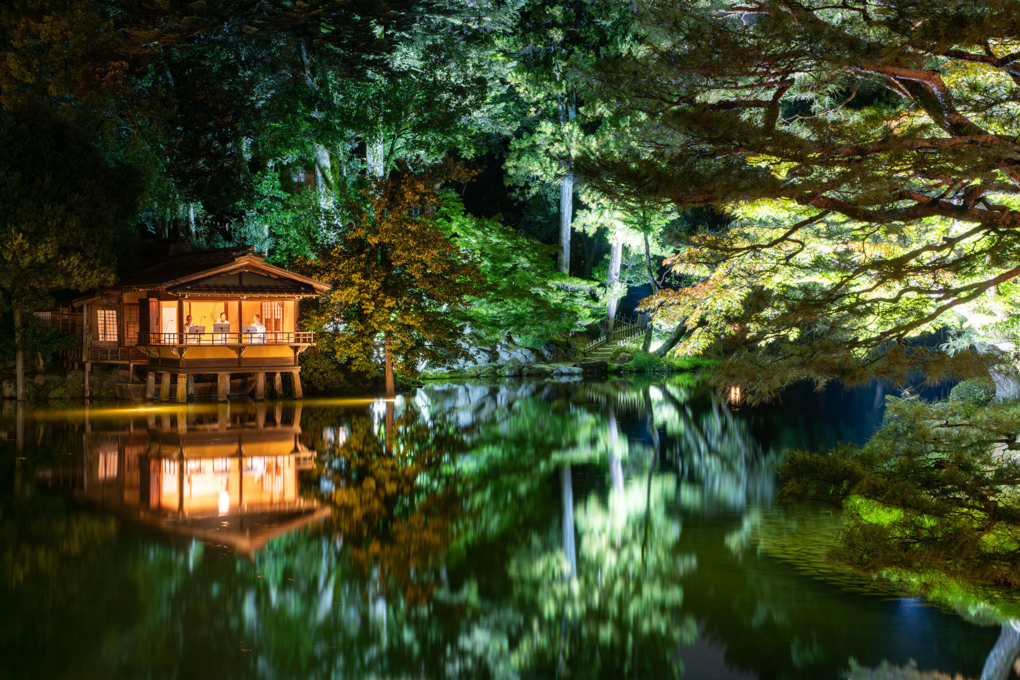 園内には霞ヶ池や唐崎松、曲水などの名所が点在し、四季折々の自然を楽しめるのが特徴です。夜間には期間限定でライトアップが実施され、園内の池や植栽が照明に浮かび上がる幻想的な風景が広がります。