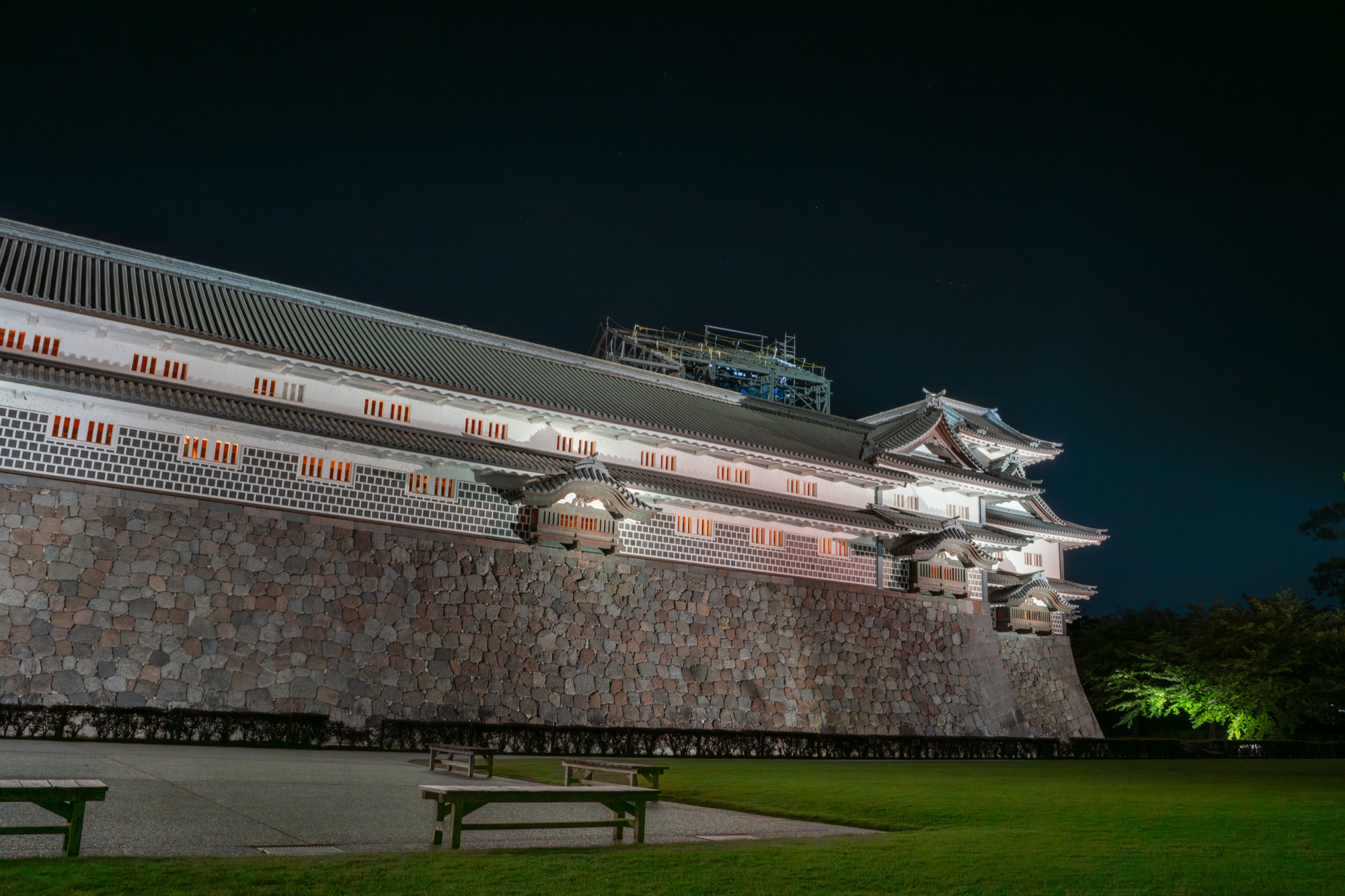 園内には、石川門(重要文化財)をはじめ、河北門や橋爪門続櫓、菱櫓、五十間長屋などの建造物が復元され、往時の城郭構造を体感することができます。隣接する玉泉院丸庭園は、藩主の私的な庭園として再現されたもので、夜間にはライトアップされ、城と庭園が一体となった幻想的な景観を楽しめます。