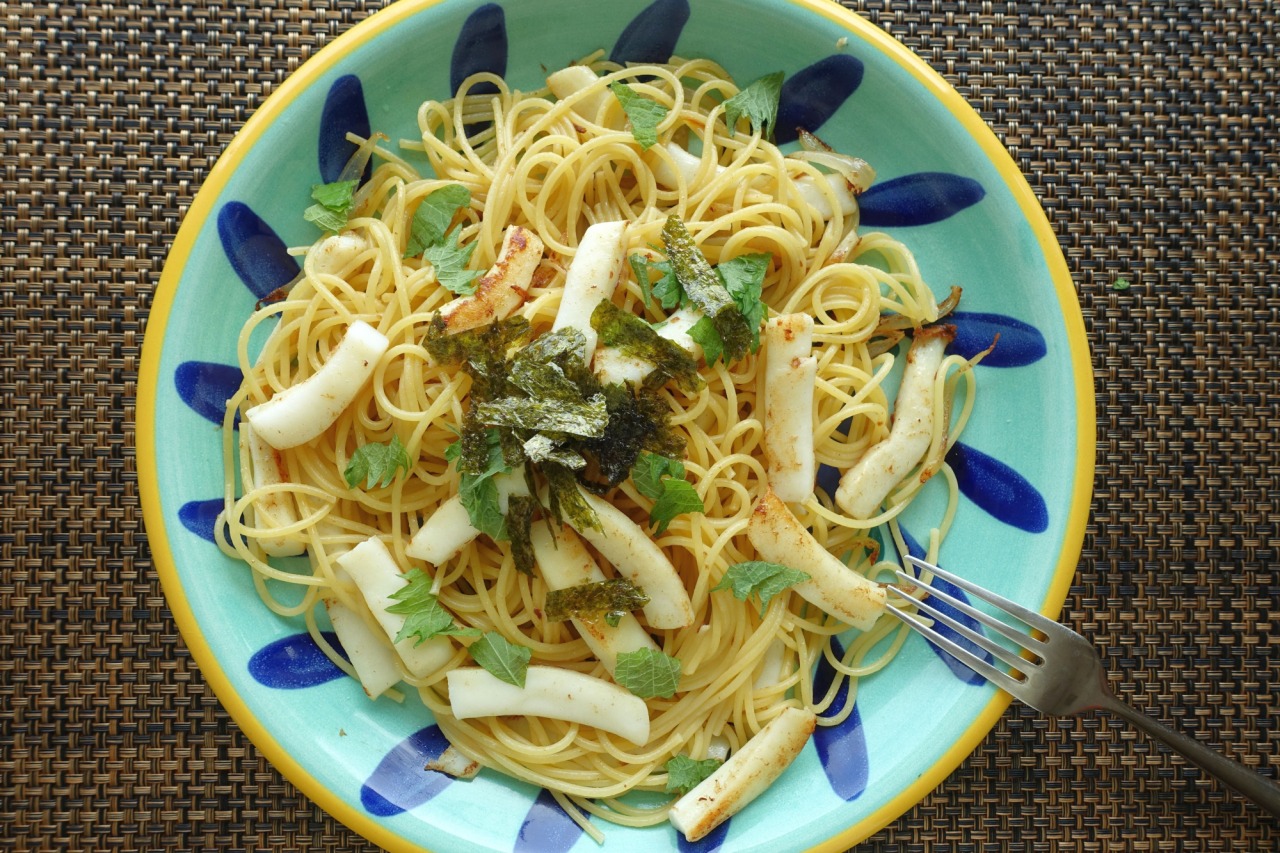 イカと玉ねぎのパスタには、「いしり」が絶妙にマッチ。おいしさをぐっと底上げ♪
