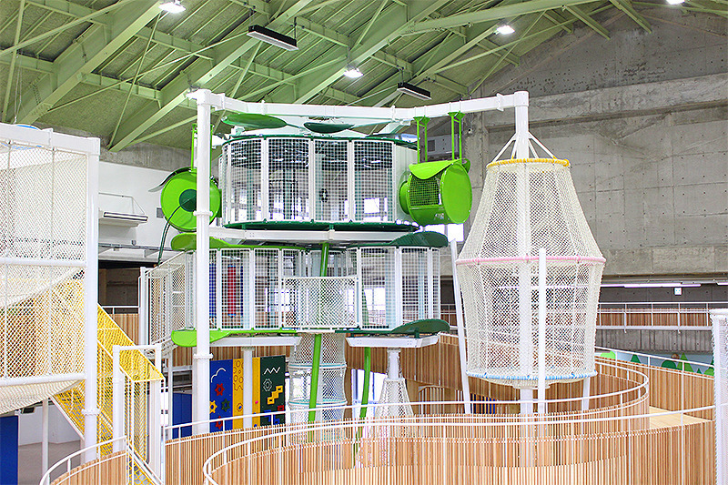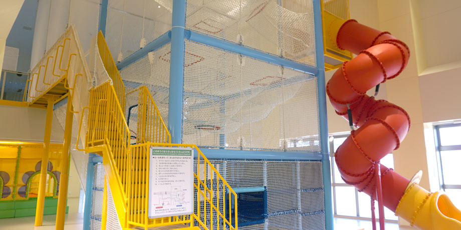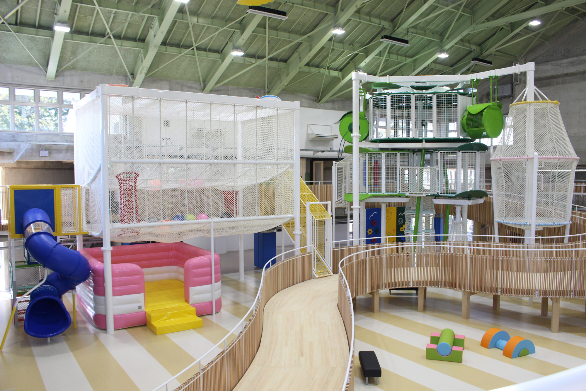 ネット遊具やバンク遊具で遊べるエリアのほか、ベビー・幼児エリアもあり、兄弟や友人同士でも楽しめること間違いなし。館内には休憩エリアやカフェ、テラスも完備されていて、充実した時間を過ごせます。
