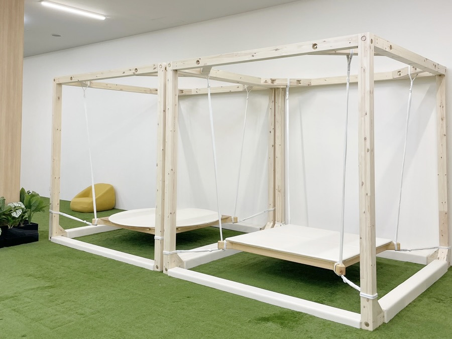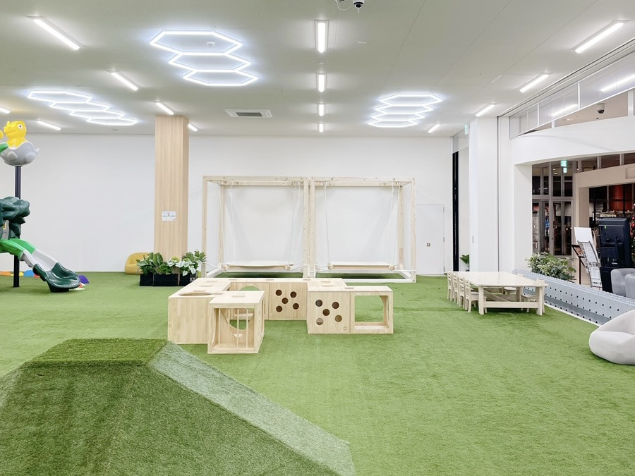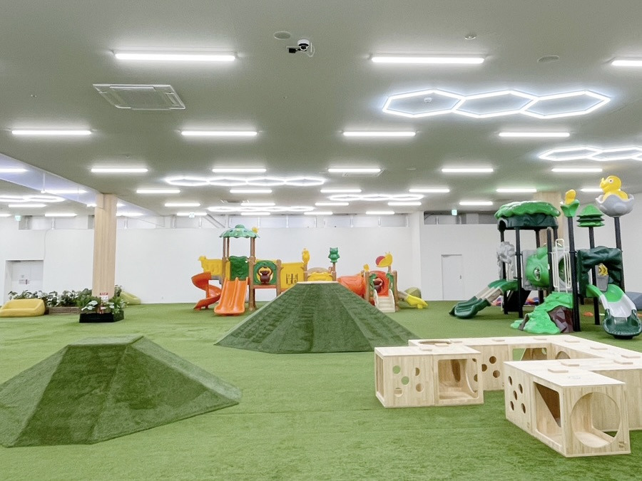 全面人工芝で、安心して子どもを見守ることができるのが魅力。芝の山や大きな滑り台、ゆらゆら揺れるハンモックなど、オリジナル遊具は子どもたちからも大人気です。