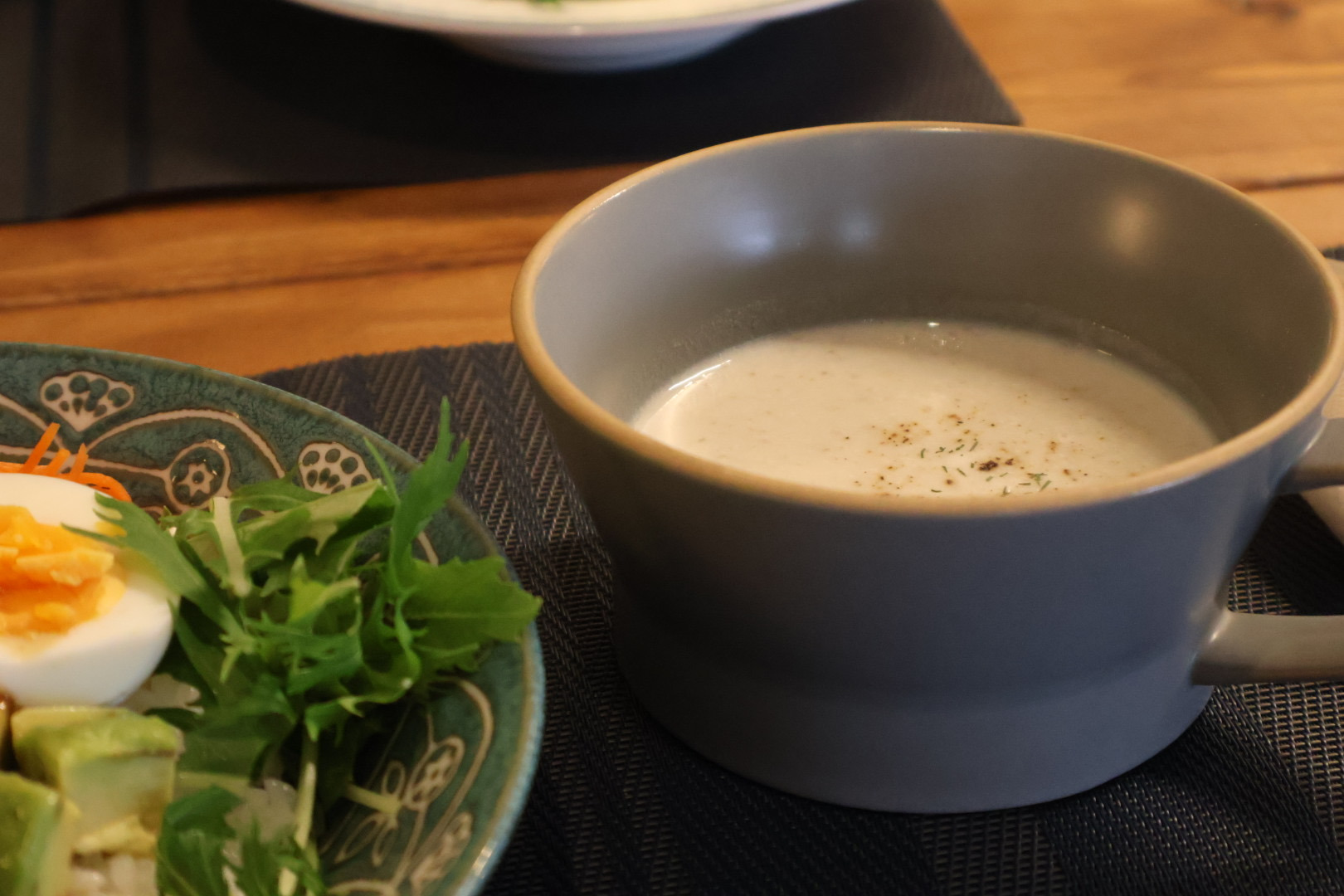 丼には、手作りスープまたは自家製くるみドレッシングのサラダを付けることができます。今回は手作りスープをいただきました。日替わりで内容が変わり、素材の風味をしっかりと感じられる優しい味わいです。