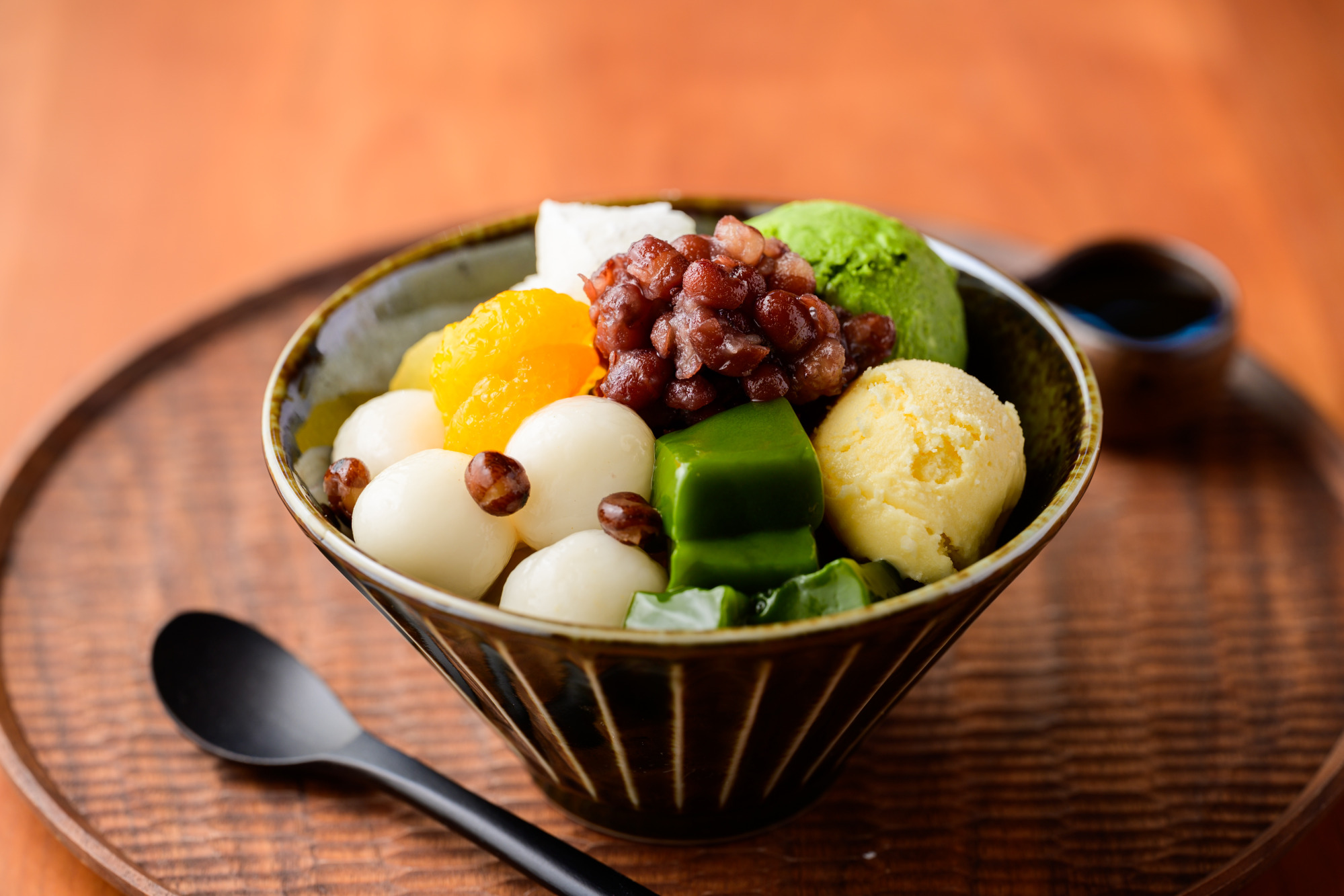 上品な甘さとほろ苦さのバランスが絶妙な抹茶アイスと抹茶ゼリーに、北海道産小豆で作ったつぶ餡、寒天、作りたてのもちもち白玉などが添えられた「白玉抹茶クリームあんみつ」。程よい甘さと豊かな風味が調和した、たまらない美味しさです。
