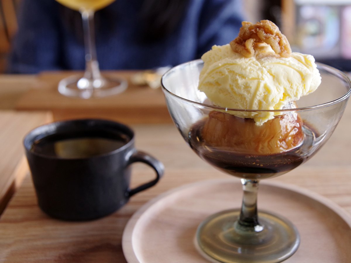 この日は、食べ歩きの休憩を兼ねて店内でスイーツとコーヒーをいただきました。豆乳ときび砂糖を使ったシンプルな固めプリン「ザ・プディング」は、ほろ苦いカラメルと相性抜群。バニラアイスが少しずつ溶けてなじみ、絶妙な味のバランスを生み出していました。