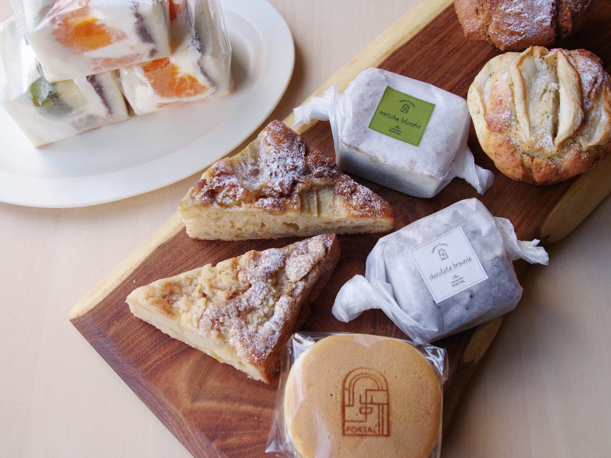 スイーツは季節ごとにフルーツやフレーバーが変わり、秋には柿、梨、ぶどう、みかんなどを使ったフルーツサンドが登場します。焼き菓子はマフィンやブラウニー、バナナブレッドなど種類も多彩。お店の焼き印が押されたあんバターサンドも人気の一品です。