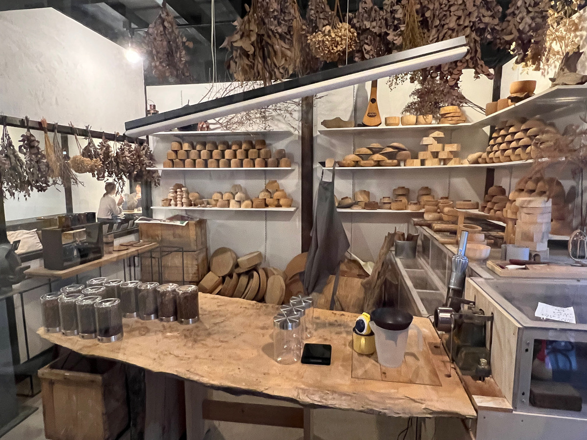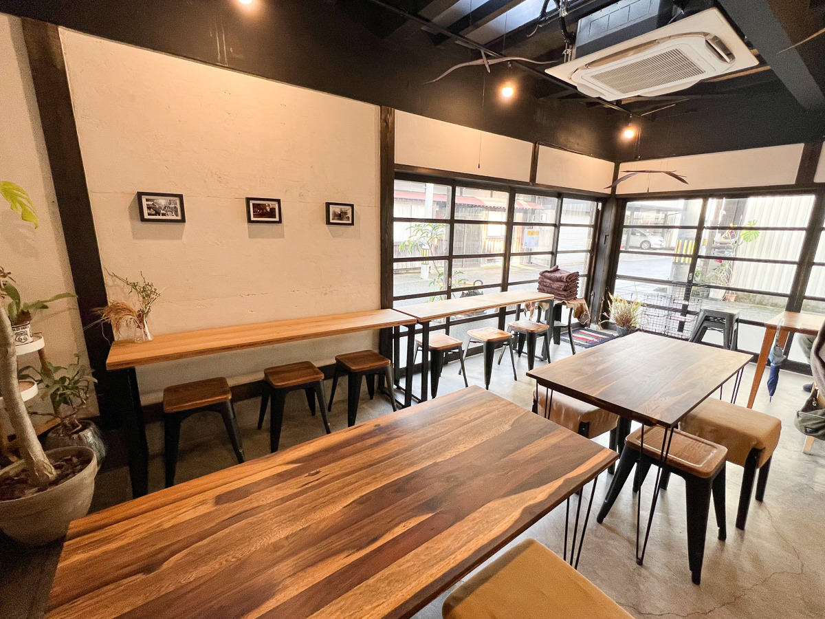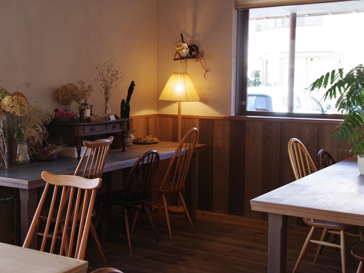 古材を使って作られた奥の小上がり席もおすすめ。壁にもたれて足を伸ばせる絶妙な広さで、靴を脱がずにくつろげます。モビールやドライフラワーが飾られた店内は、温かみのある穏やかな雰囲気に包まれています。